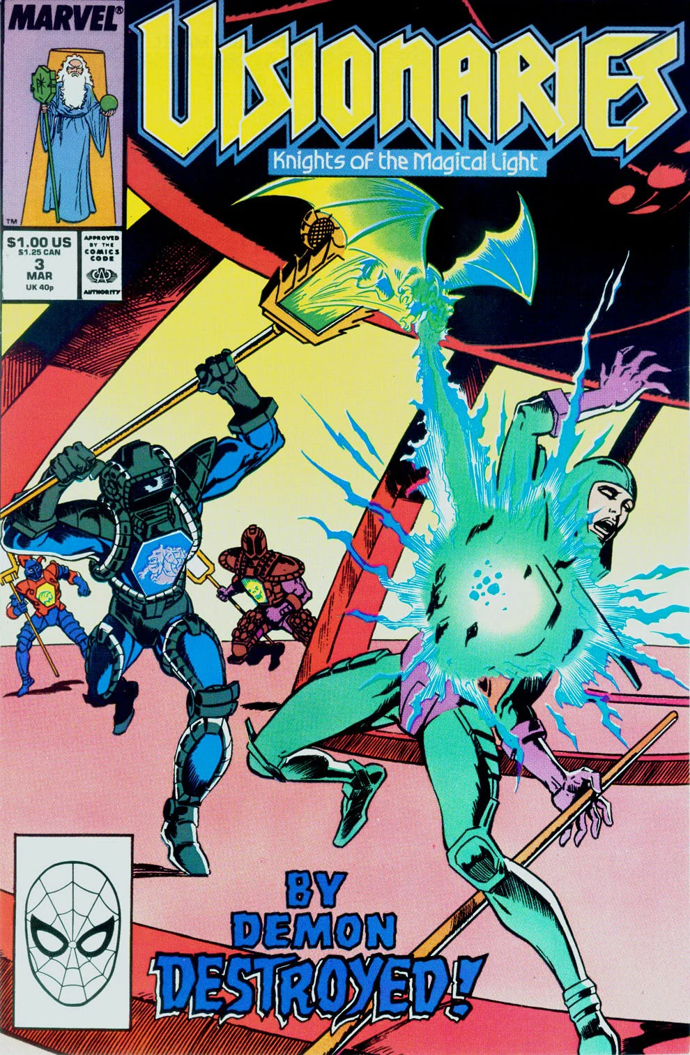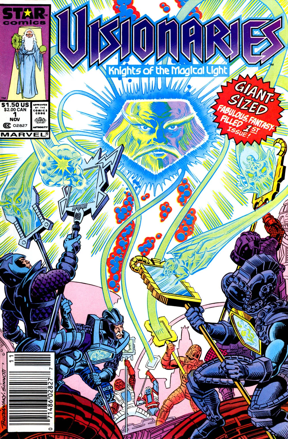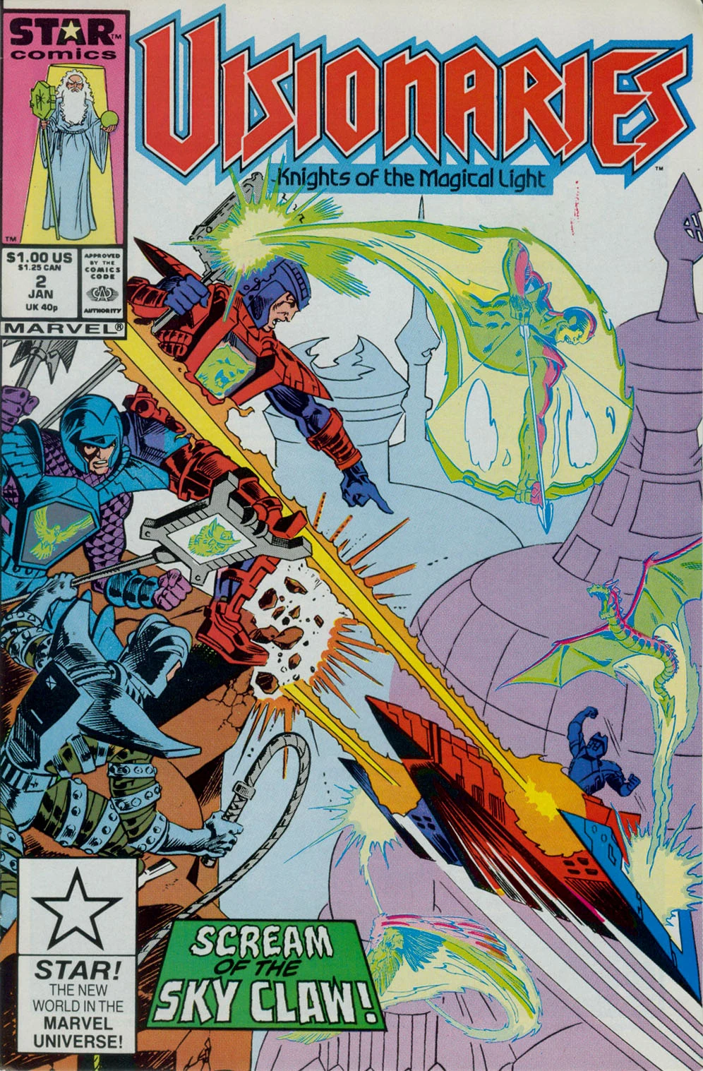 Visionaries: Knights of the Magical Light was a short-lived comic seres published by Star Comics, an imprint of Marvel. The comic lasted only six issues, and was cancelled halfway through a four-part storyline. The first issue was an adaptation of the first episode, "The Age of Magic Begins", but subsequent issues took the storyline in a different direction. There were a few differences in details – whereas in the cartoon, the staff-bearing knights had only one use of their staffs before needing a recharge, in the comic, they could use their staffs as often as they liked. In one issue, Witterquick and Cindarr crossed their staffs to combine their powers, the combination of light speed and destruction creating an earthquake. Another difference concerned the animal totems - the characters worried that they might lose control of their animal forms while in them.