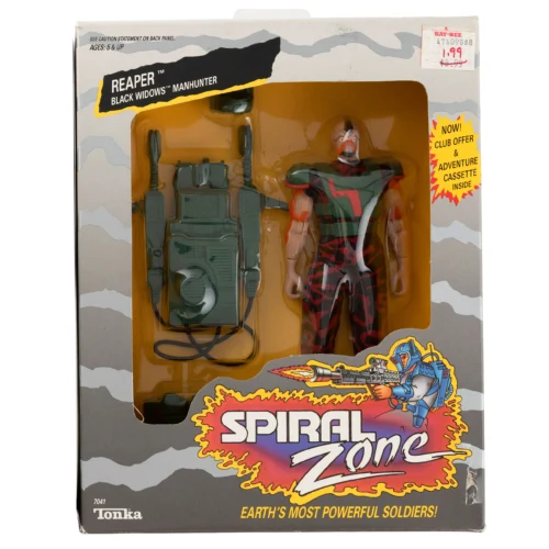 Although best known for producing toys of construction vehicles, Tonka licensed the rights to Spiral Zone from Bandai and created a line of seven-inch figures that were later based on the animated series. The toy line, which hit the market in 1986, comprised four of the five original Zone Riders and all five original Black Widows, plus their vehicles, six cloth uniforms, and six equipment sets. However, the cancellation of the series left the figures of Zone Riders Anastacia, Tucker, and Franklin, Black Widows Crook and Raw Meat, and a Zone Generator playset out of Tonka’s 1988 release. The figures were also highly detailed, but were not as articulated as the Japanese figures. Each figure has a special audio cassette tape.