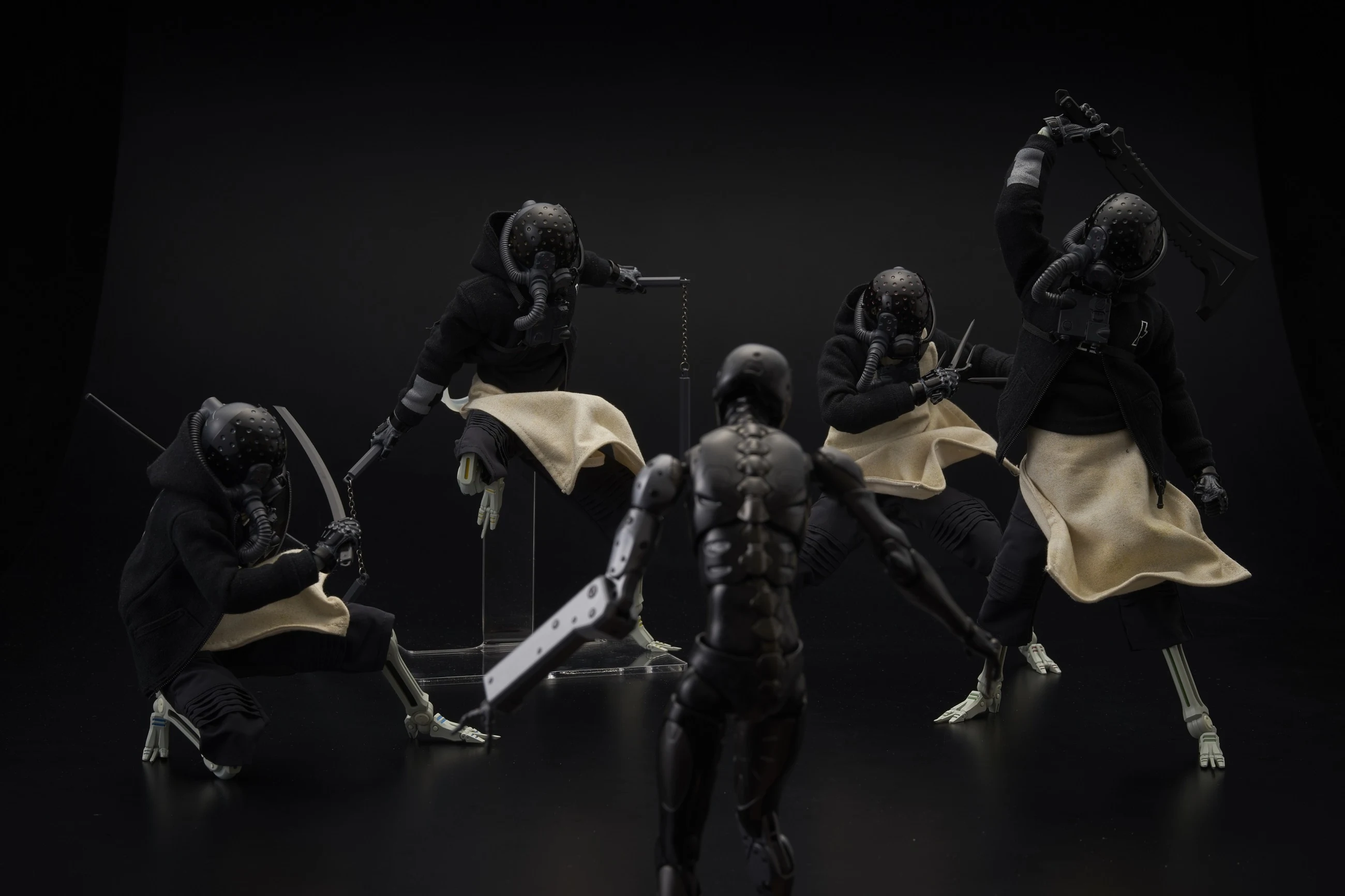 Debuted at Thai Toy Expo 2015 in May 2015. The ‘Anti CaRB Squad’ is an enforcement unit formed of 4 Synthetic Humans under orders from TOA Heavy Industries, to search and dispose of the ‘Collared-and-Reprogrammed-Body’(*pre-order for the CaRB ended in May). Even with their faces covered by under-generated protective membrane, these experimental bodies are operated mainly for close quarters combat purposes. The helmet is directly connected to the outer shell of the skull, with its protective membrane stripped off. Due to the wide angle view, environmental info indication, energy supply support from the helmet, and the high-solidity frame used for both legs, longer operation time for close quarters combat has been made possible. 1000toys Anti-CaRB Each body, with its own identification color and specialized weaponry, hunts the Collared-and-Reprogrammed-Body in a joint operation together with other members of the Anti CaRB Squad