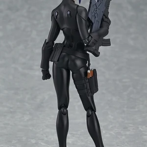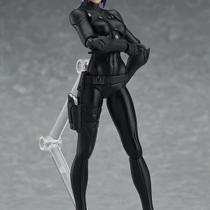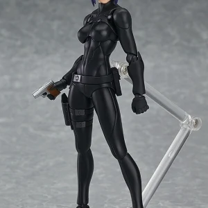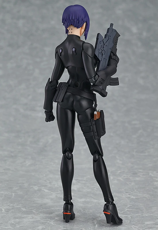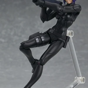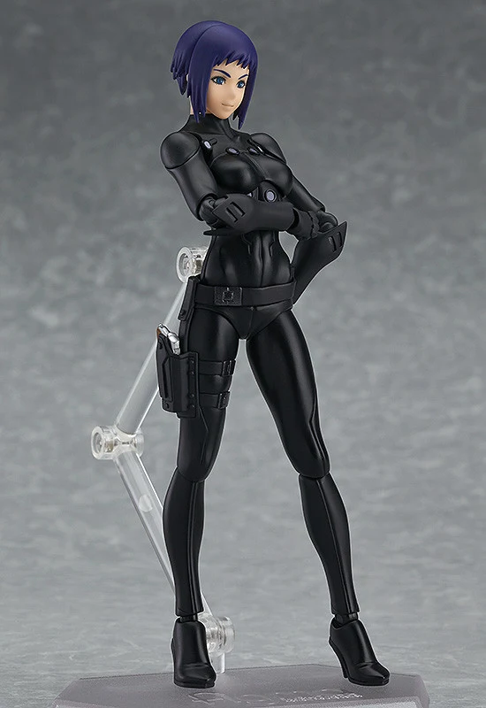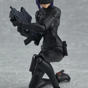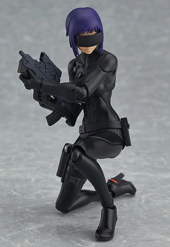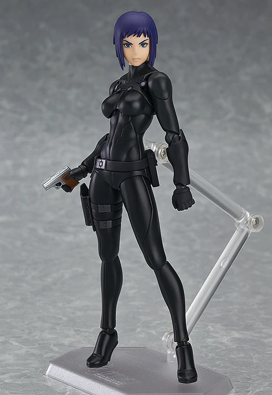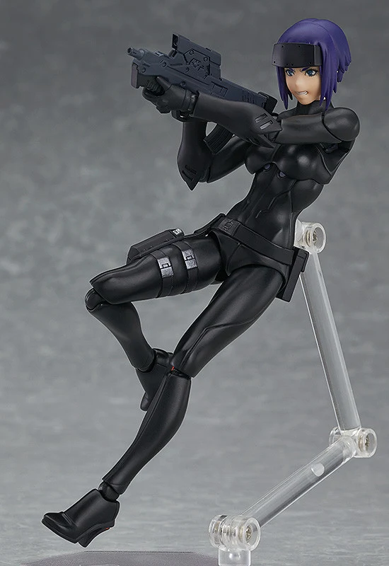 Her standard calm and collected expression, an expression with clenched teeth as well as a smiling expression are all included. Motoko's favorite pistol as well as an assault rifle are both included for various action scenes. An alternate front hair part with her visor is included, which matches up with her thermo-optical camouflage suit perfectly. A flexible plastic is used for important areas, allowing proportions to be kept without compromising posability. An articulated figma stand is included, which allows various poses to be taken.