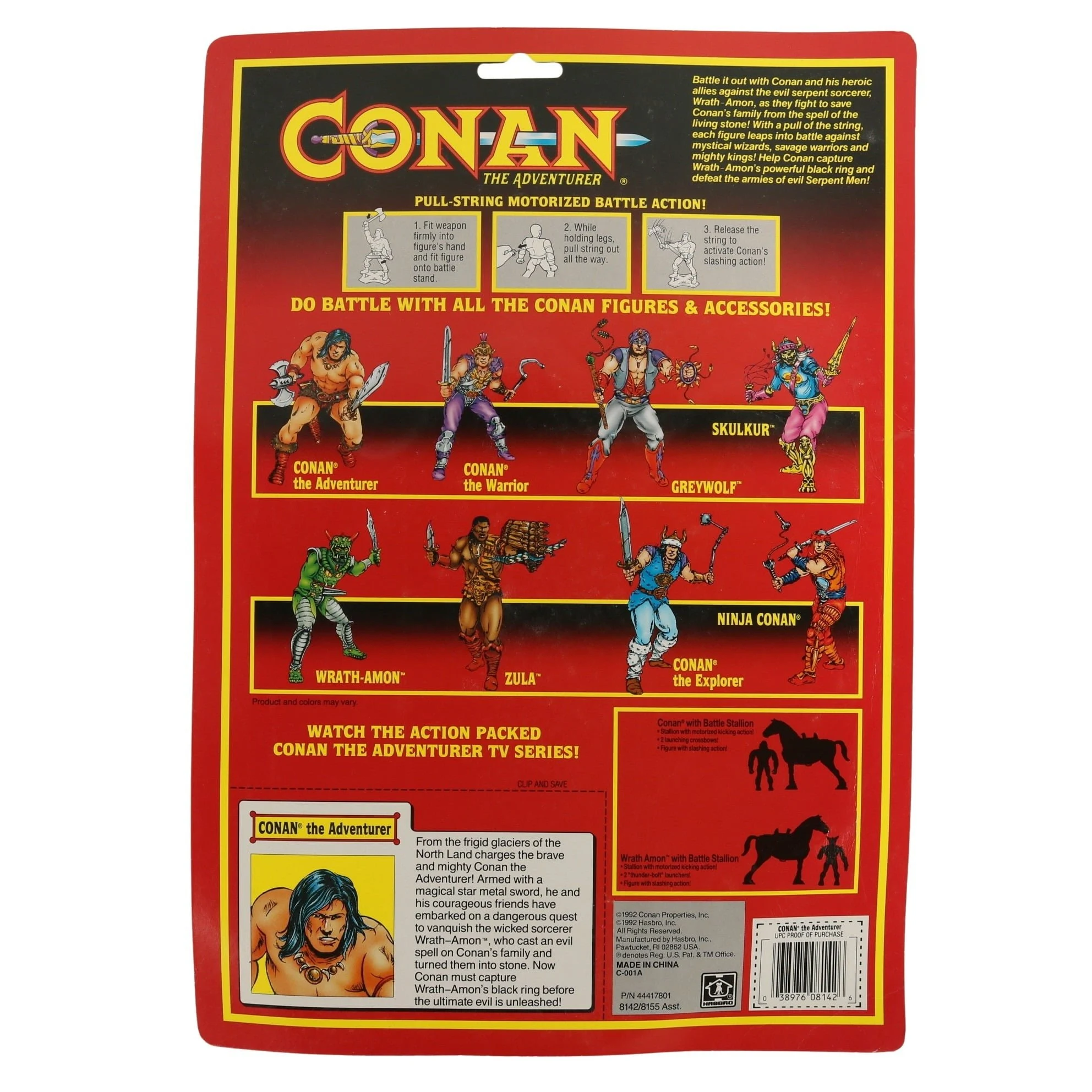 From the frigid glaciers of the North Land charges the brave and mighty Conan the Adventurer! Armed with a magical star metal sword, he and his courageous friends have embarked on a dangerous quest to vanquish the wicked sorcerer Wrath-Amon, who cast an evil spell on Conan's family and turned them into stone. Now Conan must capture Wrath-Amon's black ring before the ultimate evil is unleashed!