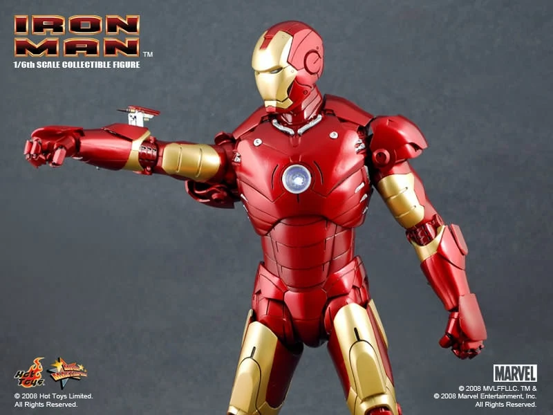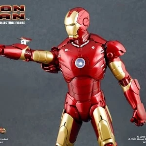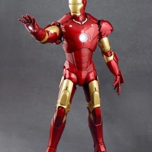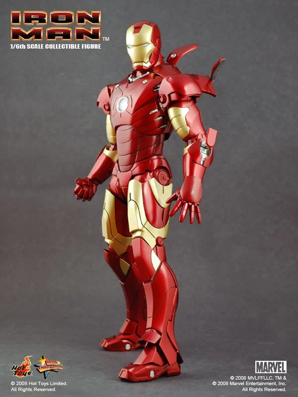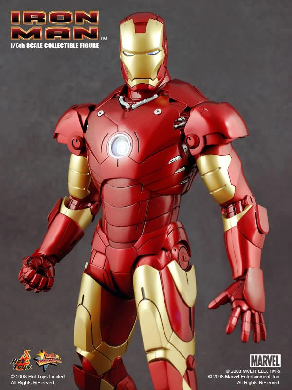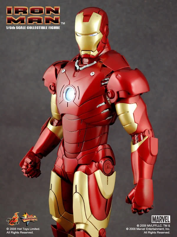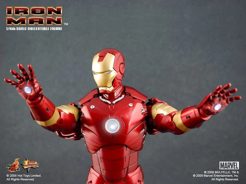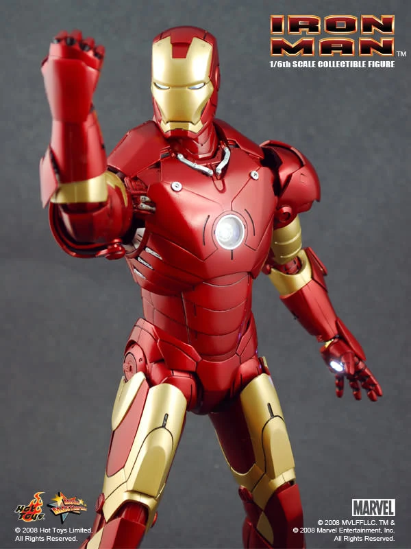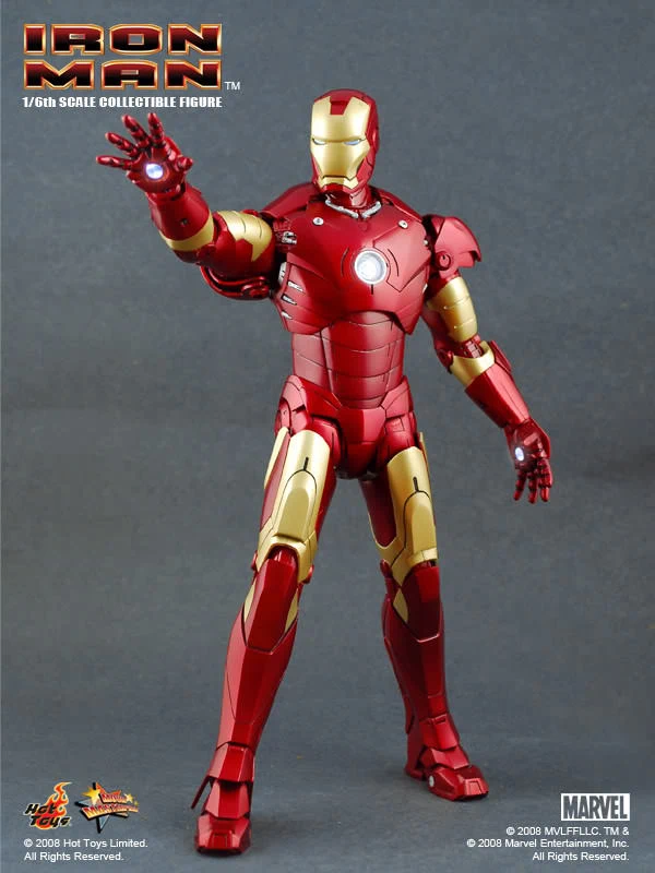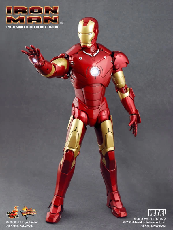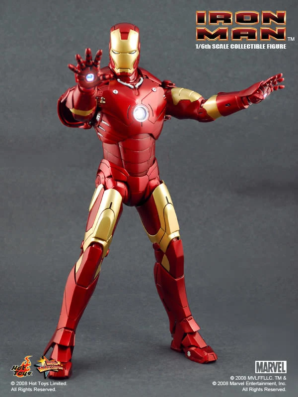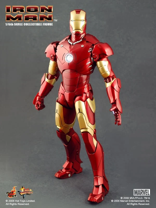 The Iron Man Mark III Sixth Scale Figure features: Over 36 points of articulation, Metallic paint, Light-up eyes and ‘heart’ (battery operated)*, Three pairs of interchangeable hands, including light-up repulsor hand, Interchangeable head with authentic likeness of Robert Downey Jr. as Tony Stark, 12-inch figure stand, Full color display packaging.