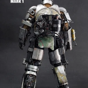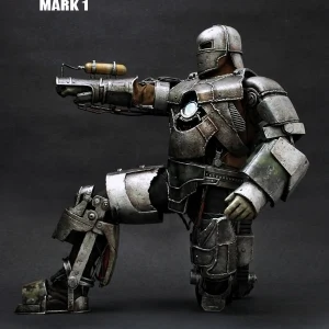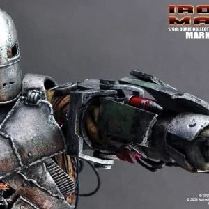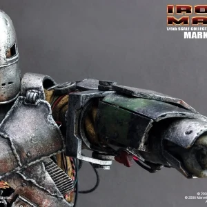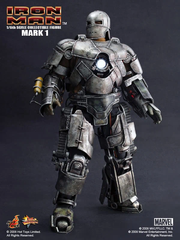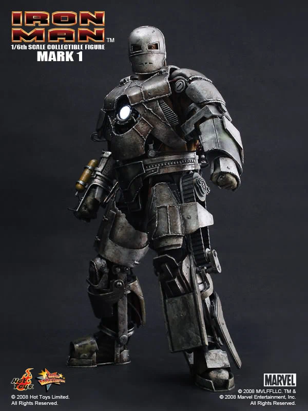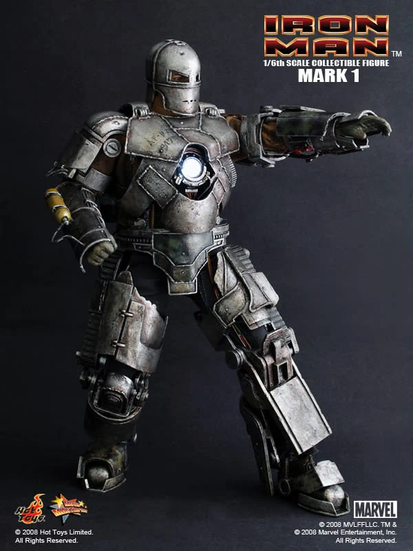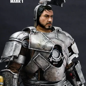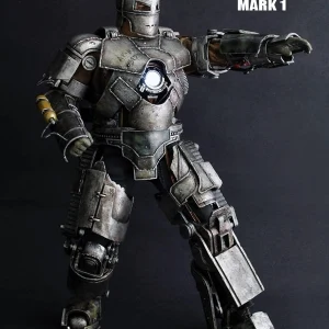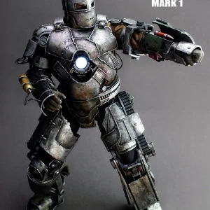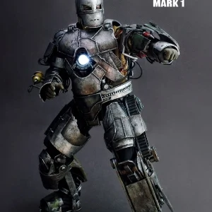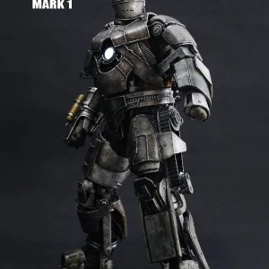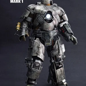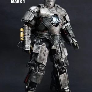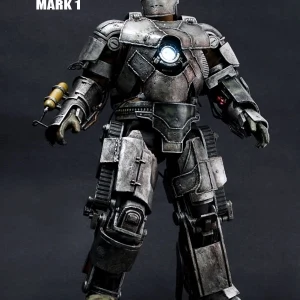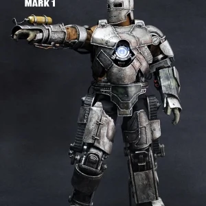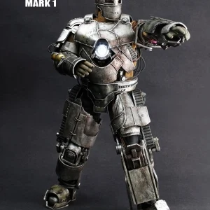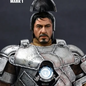 The Iron Man Mark I Sixth Scale Figure features: Stands approximate 12 inches tall, Over 36 points of articulation, Hot Toys’ TrueType figure body dressed as TONY STARK beneath the armor, Authentic and fully realized Mark 1 armor, including helmet with raising faceplate to reveal likeness of Robert Downey Jr. as TONY STARK, Metallic paint, Light-up heart and red button on left forearm (battery operated – batteries included), Two pairs of interchangeable hands, Realistic built-in flamethrower, Forearm missile launcher, 12-inch figure stand.