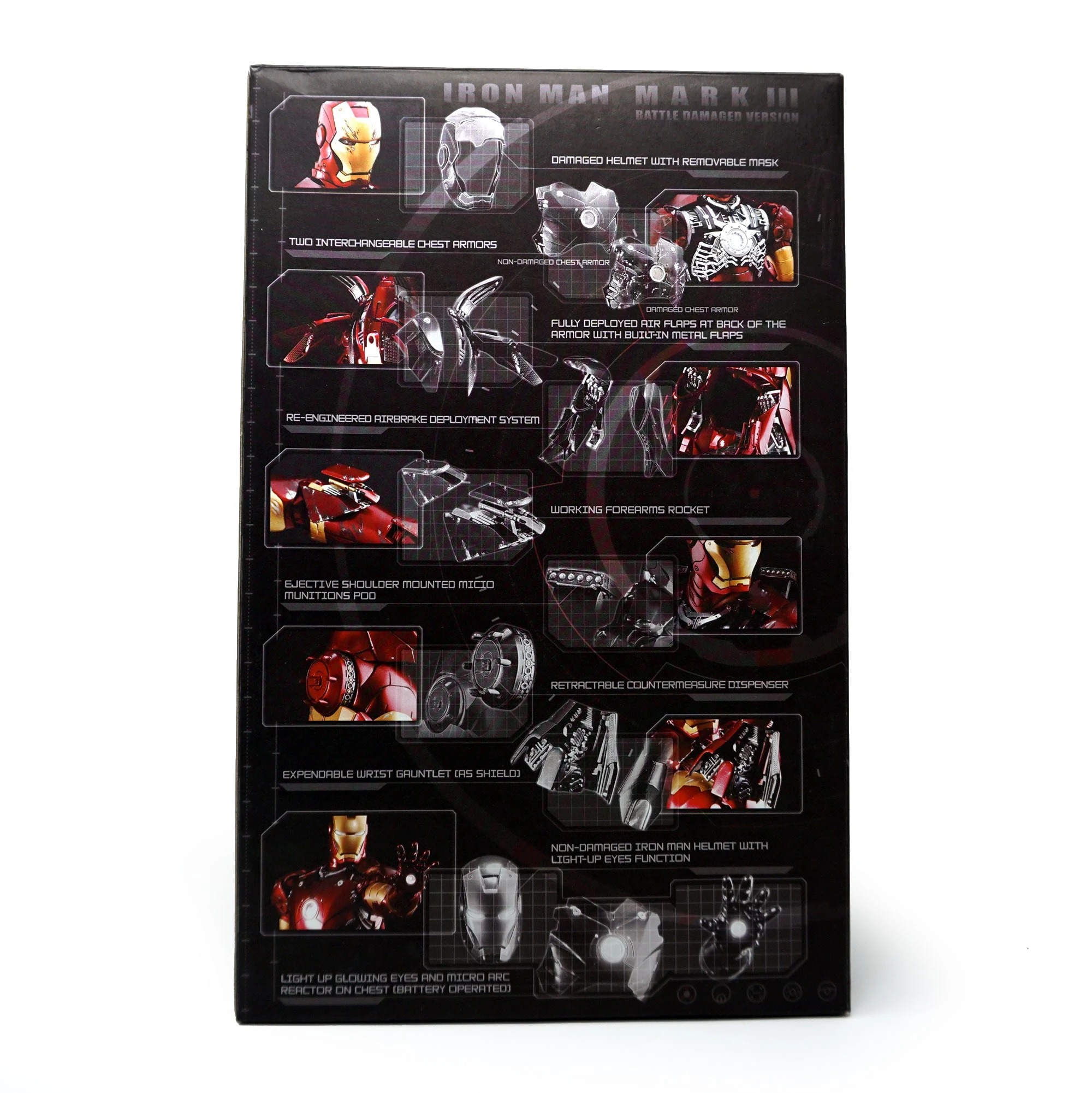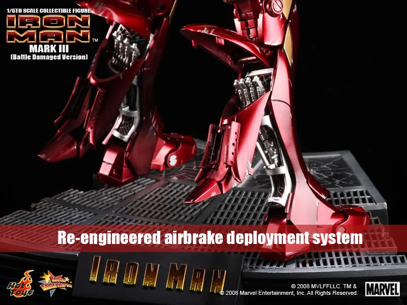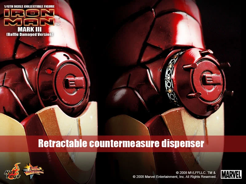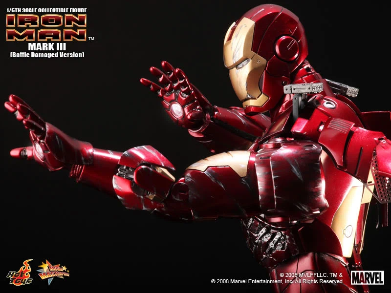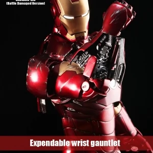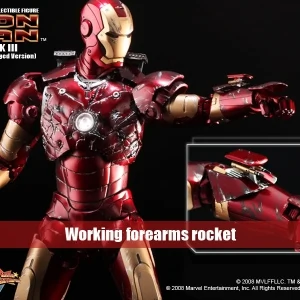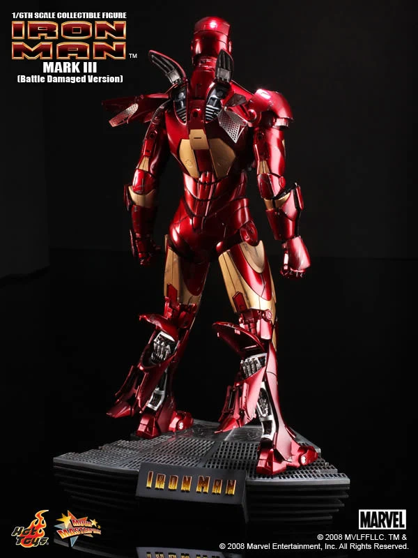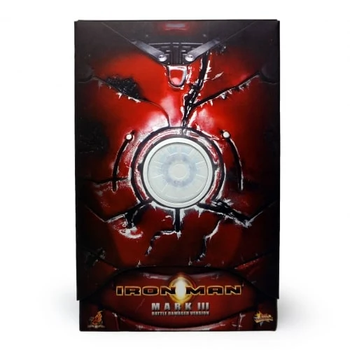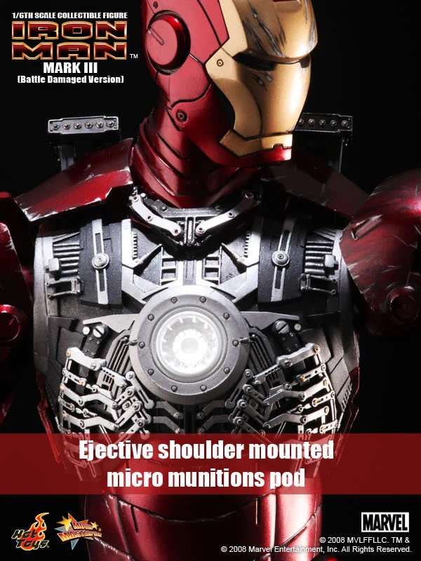 The Battle damaged IRON MAN MARK III features: Authentic and detailed fully realized IRON MAN Stands approximately 30 cm tall Over 36 points of articulation Special features on the armor: Metal-like painting with scratches finishing, Light up glowing eyes and Micro ARC reactor on chest (battery operated), Expendable wrist gauntlet (as shield), Ejective shoulder mounted micro munitions pod, Retractable countermeasure dispenser, Fully deployed Air Flaps at back of the armor with built-in metal flaps, Re-engineered AirBrake deployment system, Working forearms rocket, Two interchangeable chest armors, Seven pieces of interchangeable hands, including light up replusor palms, Damaged helmet as accessory. Alternate heads: Authentic likeness of Robert Downey Jr. as TONY STARK, in damaged helmet with removable mask, Non-damaged Iron Man helmet with light-up eyes function, Deluxe Iron Man figure base. Artist info: Head Sculpt by Kojun, Paint by JC Hong.