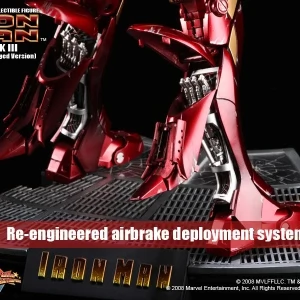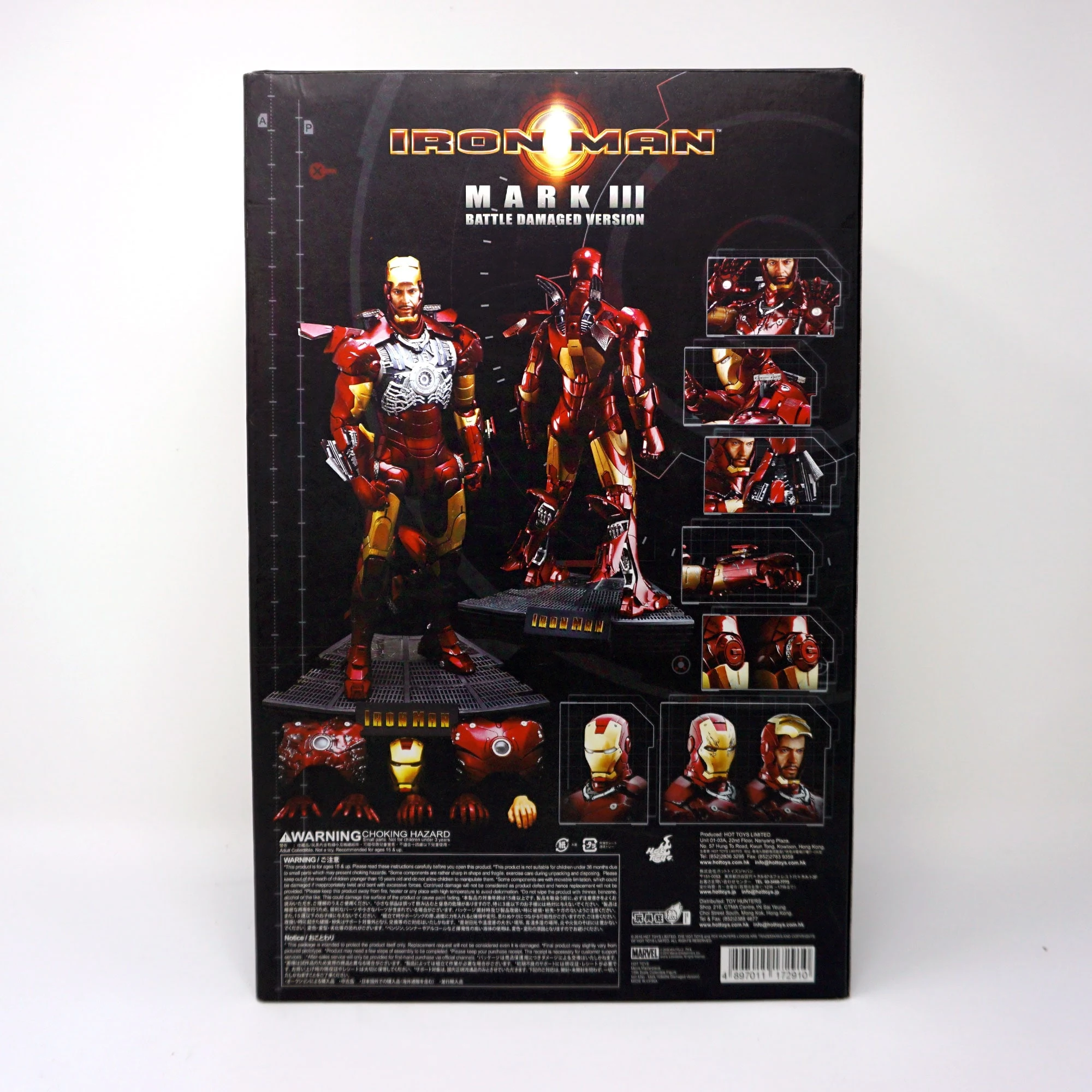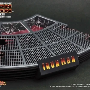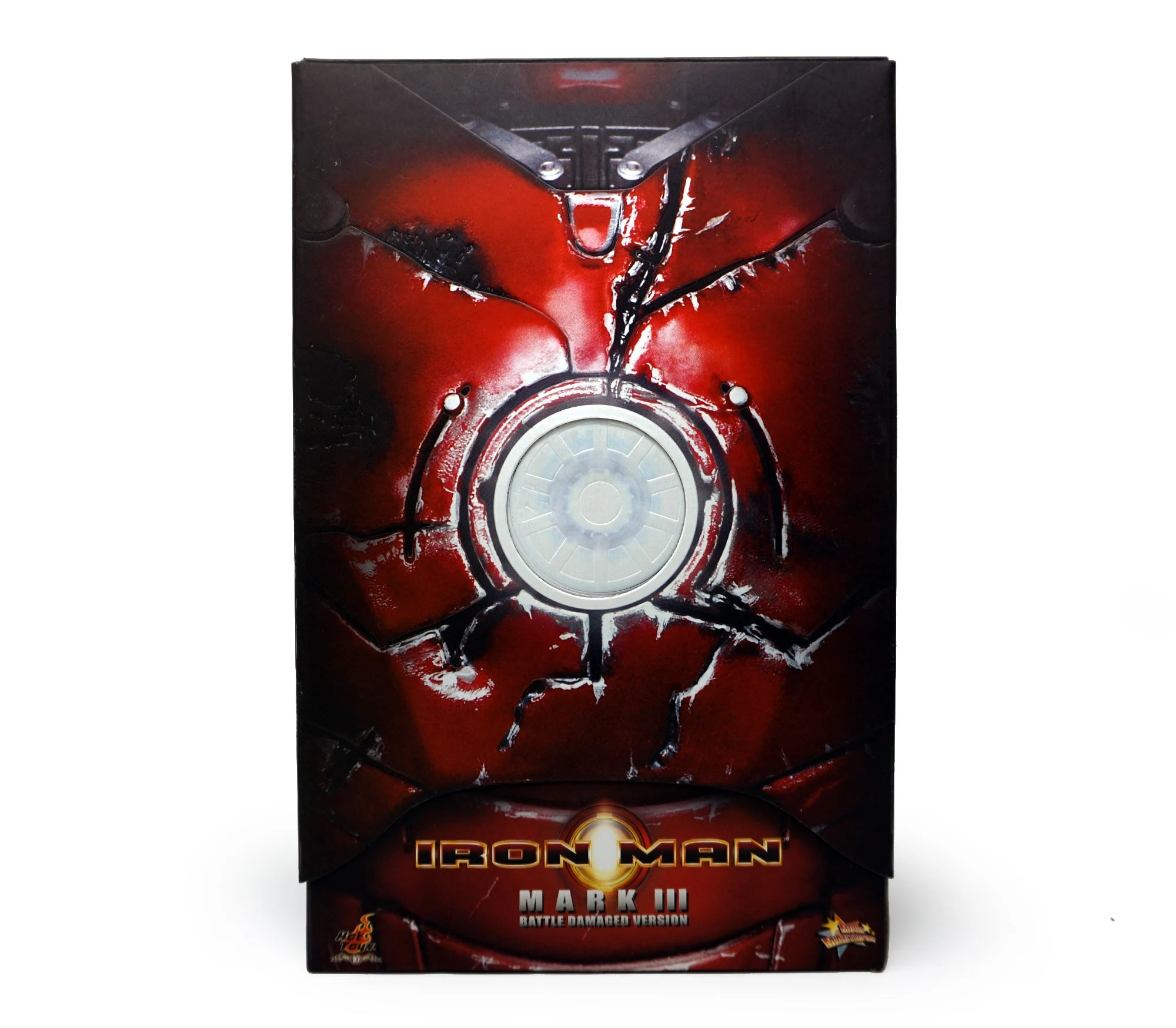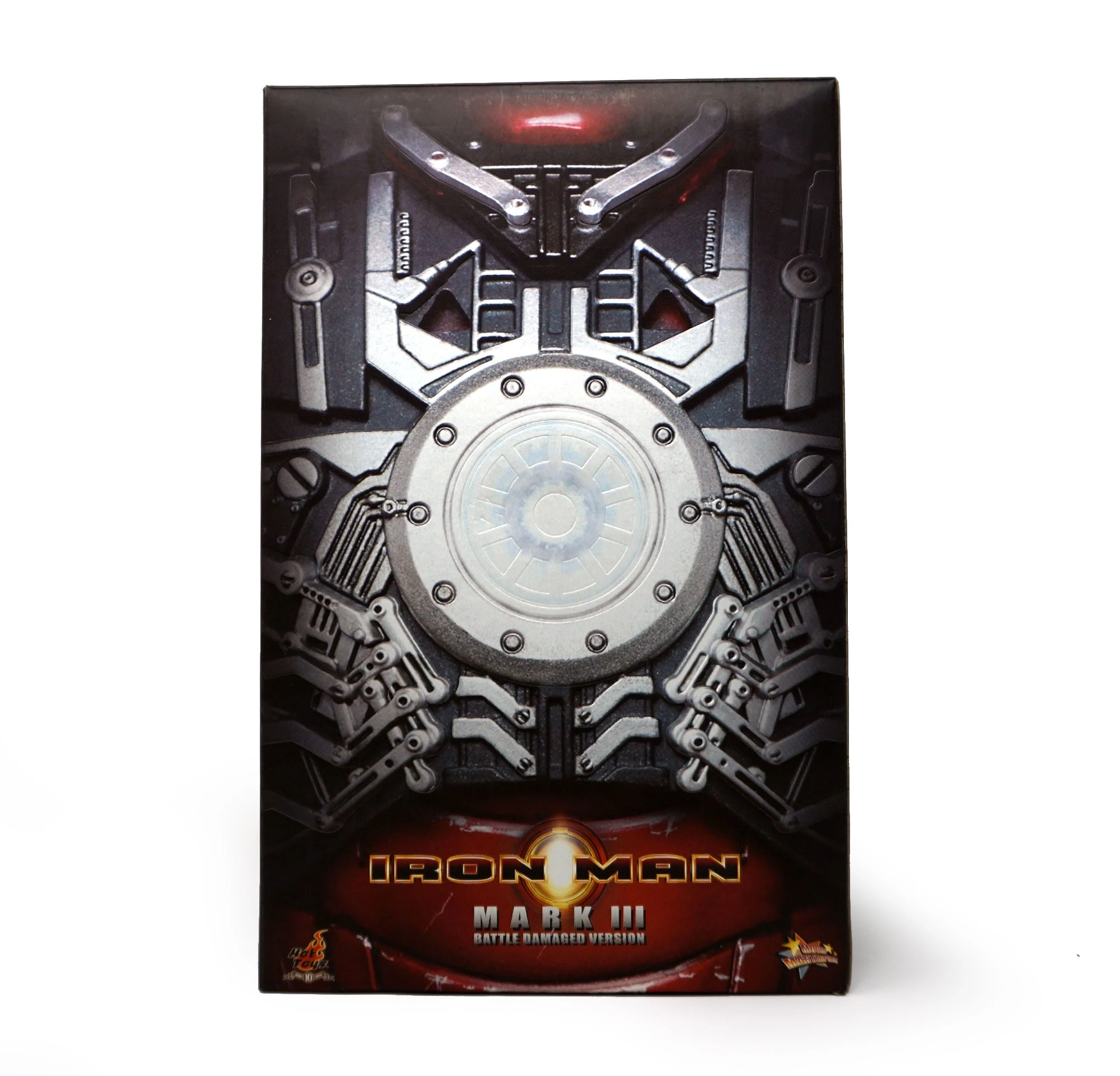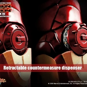 The Battle damaged IRON MAN MARK III features: Authentic and detailed fully realized IRON MAN Stands approximately 30 cm tall Over 36 points of articulation Special features on the armor: Metal-like painting with scratches finishing, Light up glowing eyes and Micro ARC reactor on chest (battery operated), Expendable wrist gauntlet (as shield), Ejective shoulder mounted micro munitions pod, Retractable countermeasure dispenser, Fully deployed Air Flaps at back of the armor with built-in metal flaps, Re-engineered AirBrake deployment system, Working forearms rocket, Two interchangeable chest armors, Seven pieces of interchangeable hands, including light up replusor palms, Damaged helmet as accessory. Alternate heads: Authentic likeness of Robert Downey Jr. as TONY STARK, in damaged helmet with removable mask, Non-damaged Iron Man helmet with light-up eyes function, Deluxe Iron Man figure base. Artist info: Head Sculpt by Kojun, Paint by JC Hong.
