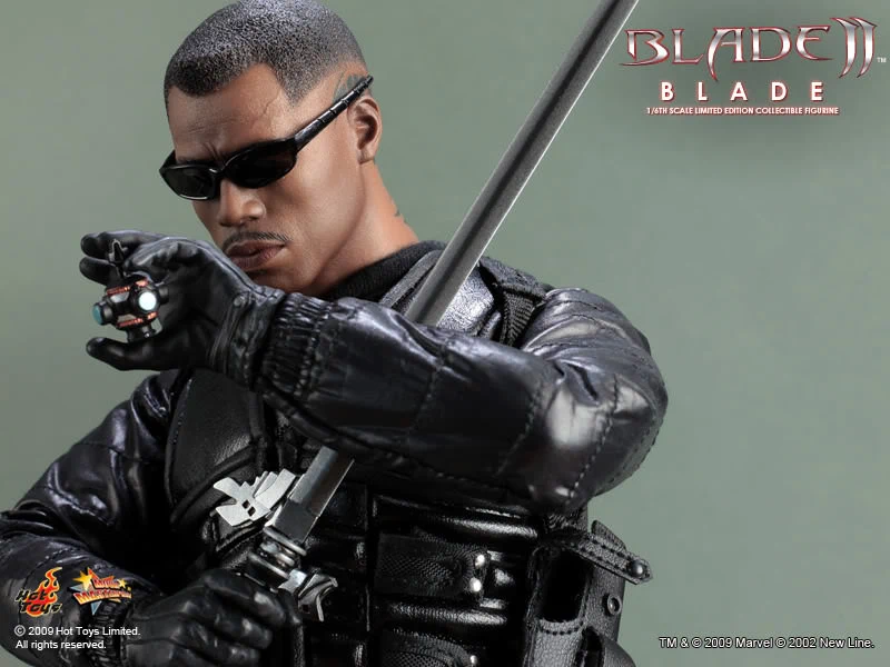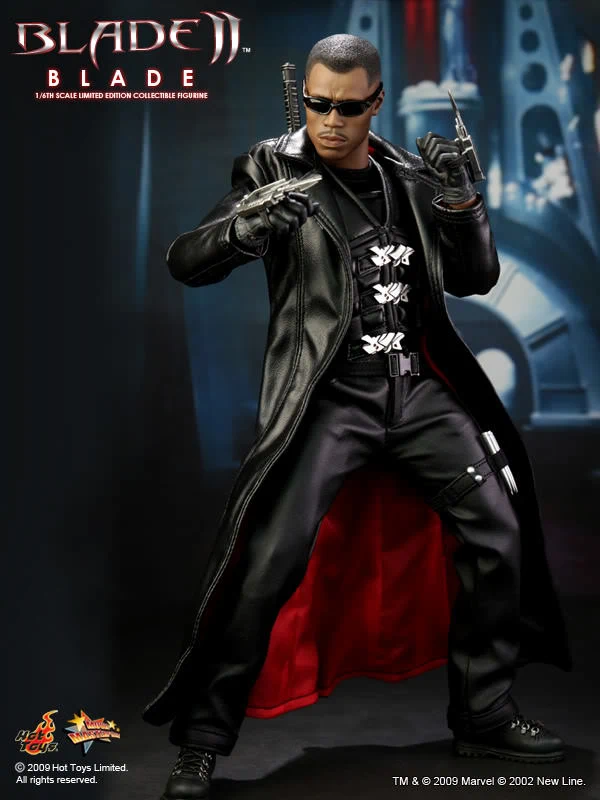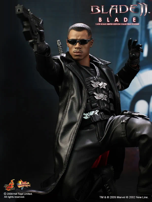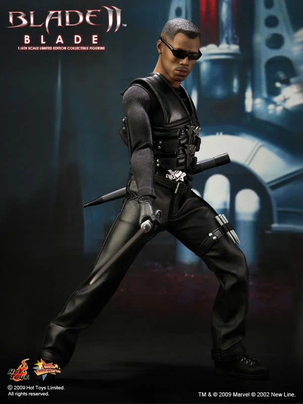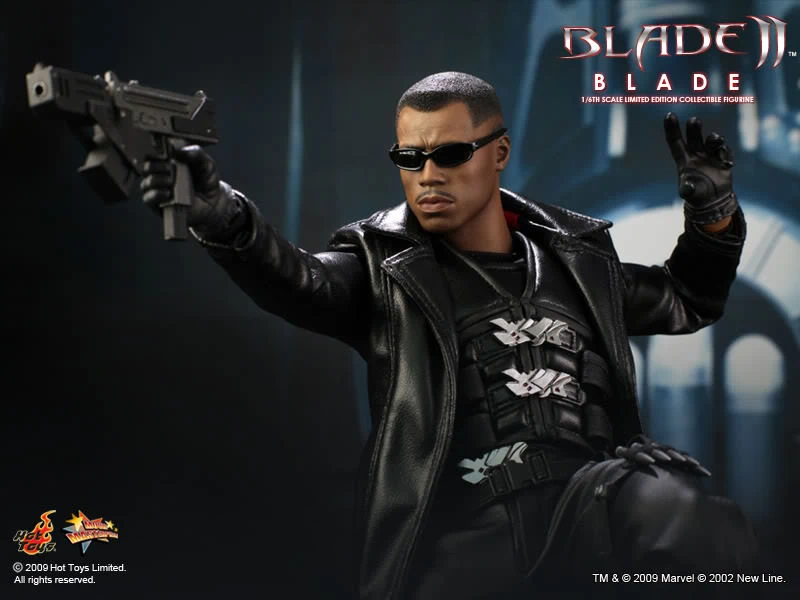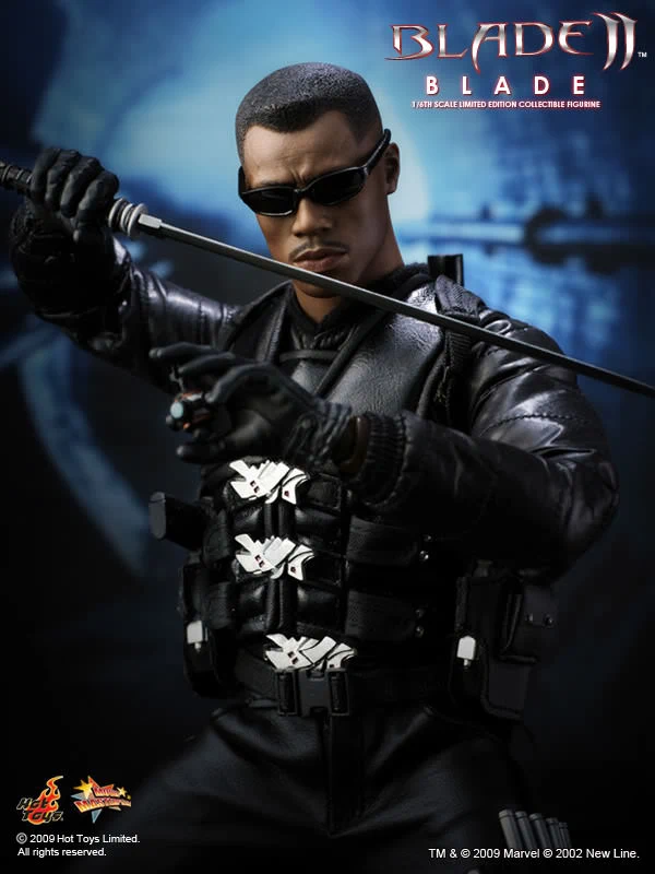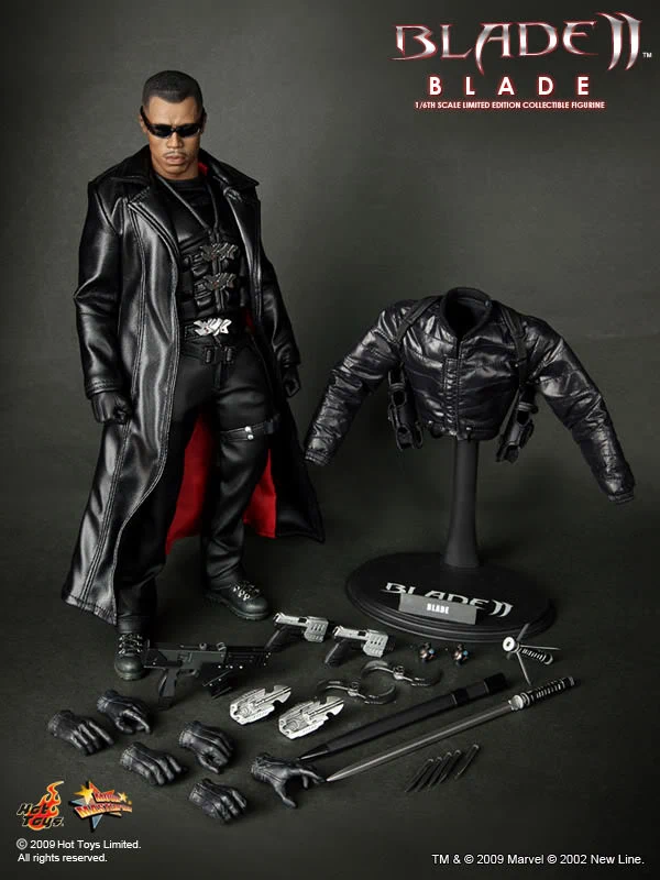 Accessories : Lifelike head sculpt with Blade’s signature tattoos at back, Authentic Likeness of Wesley Snipes, Sunglasses, Shoulder Holster, Two (2) foldable glaives, Two (2) extendable hand armors, Sword with scabbard, Interchangeable sword handle with blades, Five (5) stakes, Two (2) UV Bombs, Machine Gun, Two (2) Handguns, Four (4) sets of interchangeable gloved hands, Figure stand with Blade II movie logo and Blade nameplate