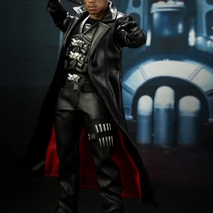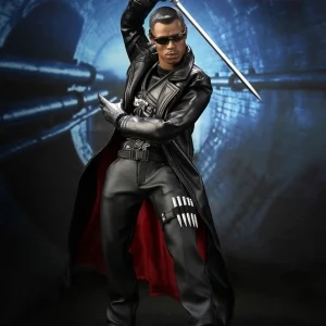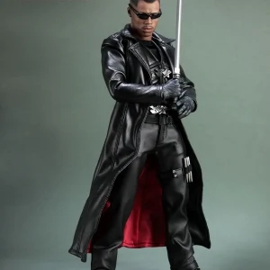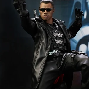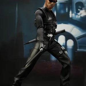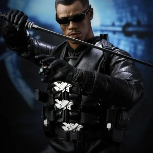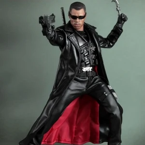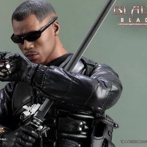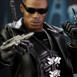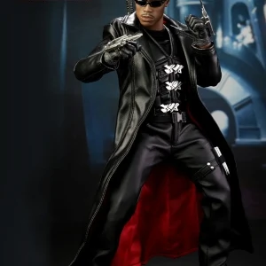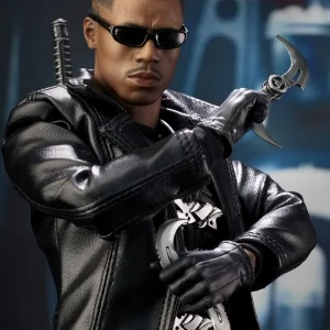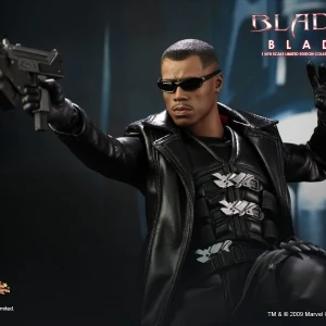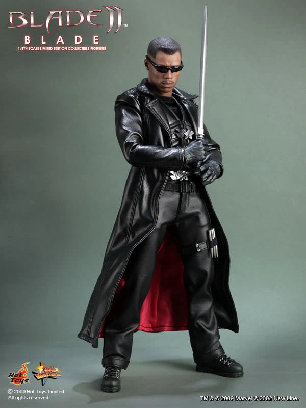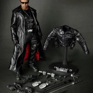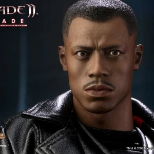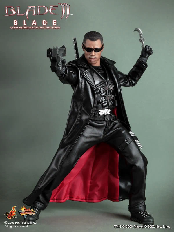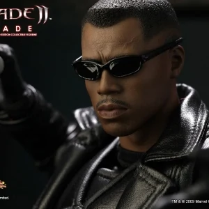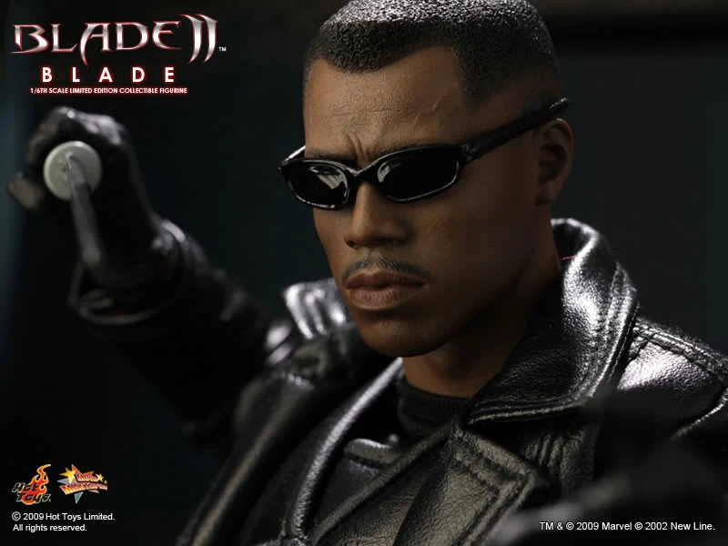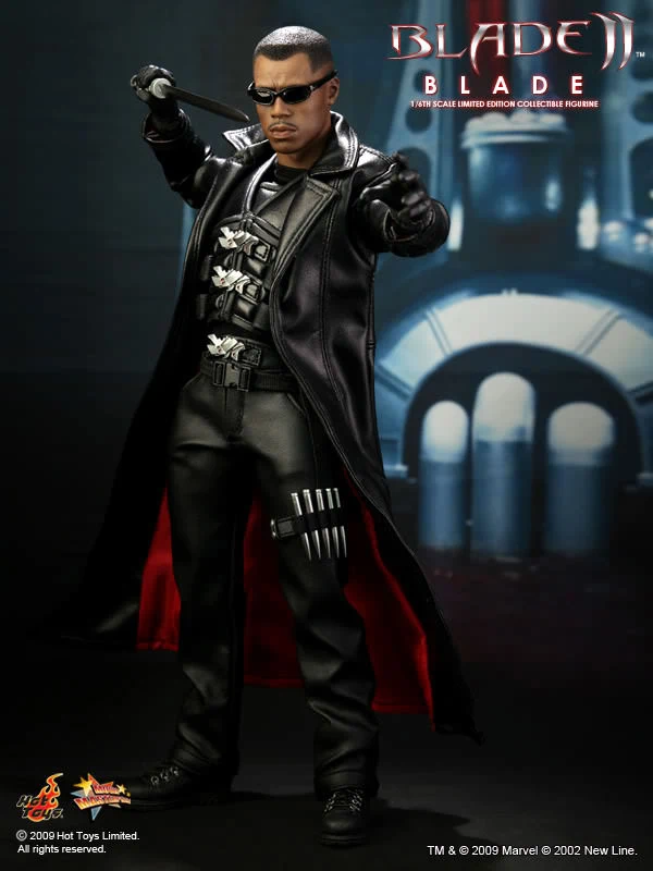 Accessories : Lifelike head sculpt with Blade’s signature tattoos at back, Authentic Likeness of Wesley Snipes, Sunglasses, Shoulder Holster, Two (2) foldable glaives, Two (2) extendable hand armors, Sword with scabbard, Interchangeable sword handle with blades, Five (5) stakes, Two (2) UV Bombs, Machine Gun, Two (2) Handguns, Four (4) sets of interchangeable gloved hands, Figure stand with Blade II movie logo and Blade nameplate
