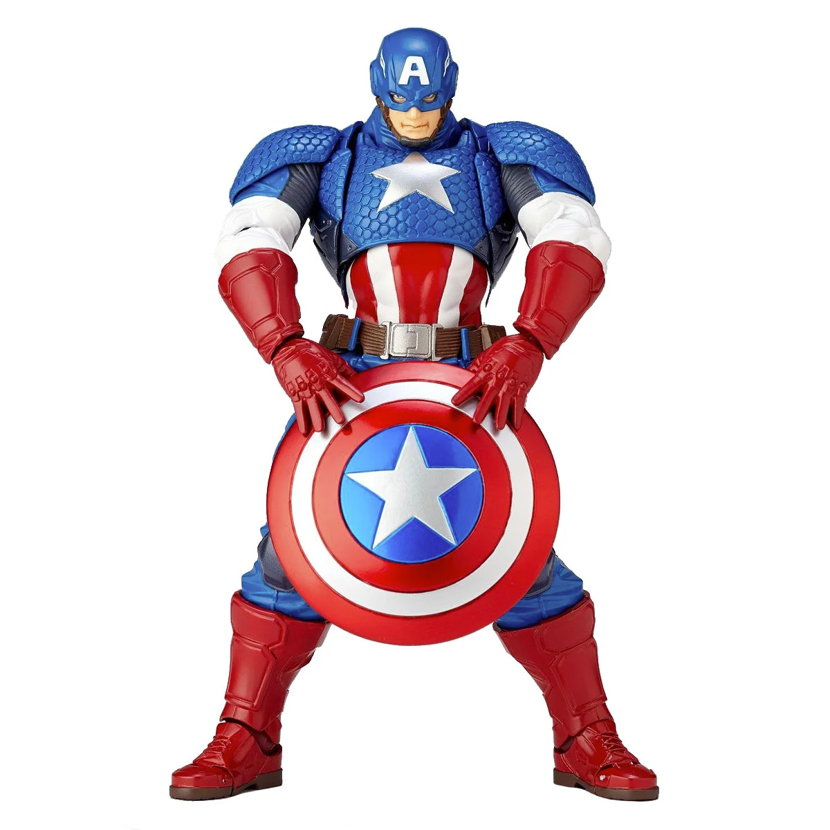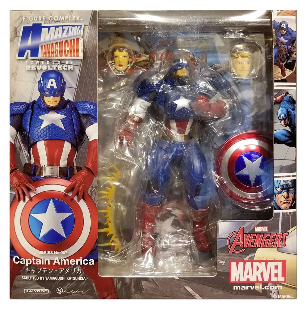 Captain America joins the Amazing Yamaguchi figure lineup! He’s about 6.50 inches tall, and boasts over 38 points of articulation. The Captain includes his trusty shield that can be either mounted to him arm or back and even includes a bullet ricochet effect piece. Also included are several hand and facial expression options.