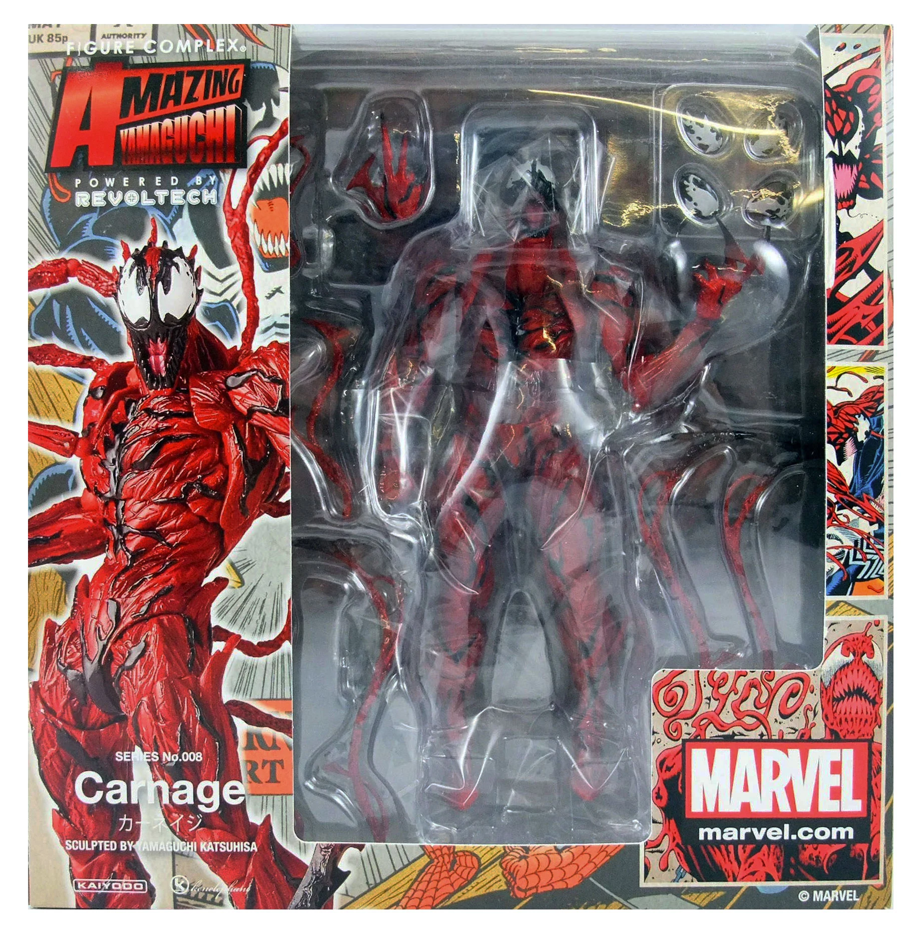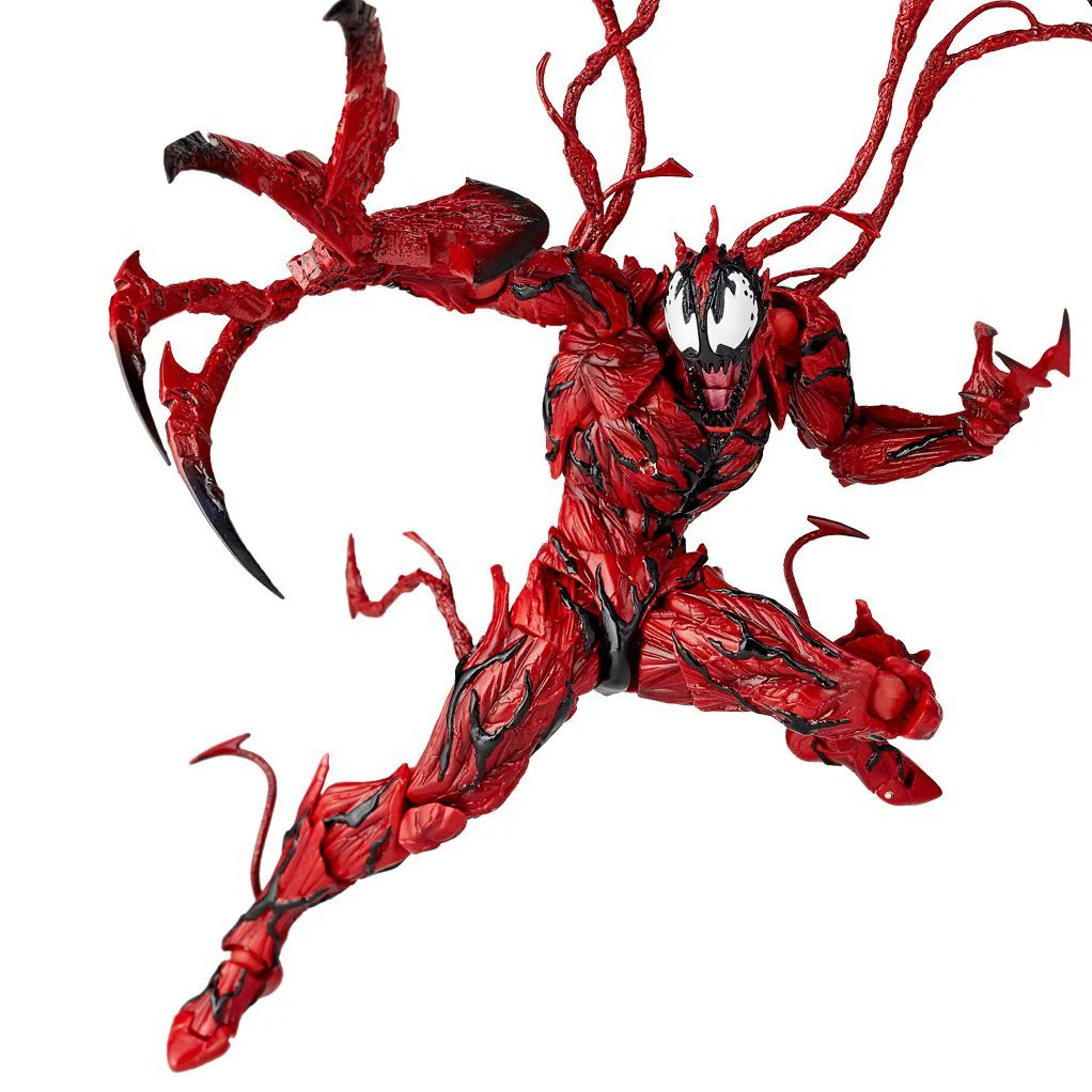 The vicious symbiote Carnage from "The Amazing Spider-Man" joins the Amazing Yamaguchi action figure lineup from Kaiyodo, and he looks incredible! This Revoltech Carnage action figure is insanely posable for maximum action, and he comes with a lot of interchangeable parts -- tendrils of symbiote, as well as symbiote weapons (axes, sharp points, etc.), extra hands and eyes, and more!