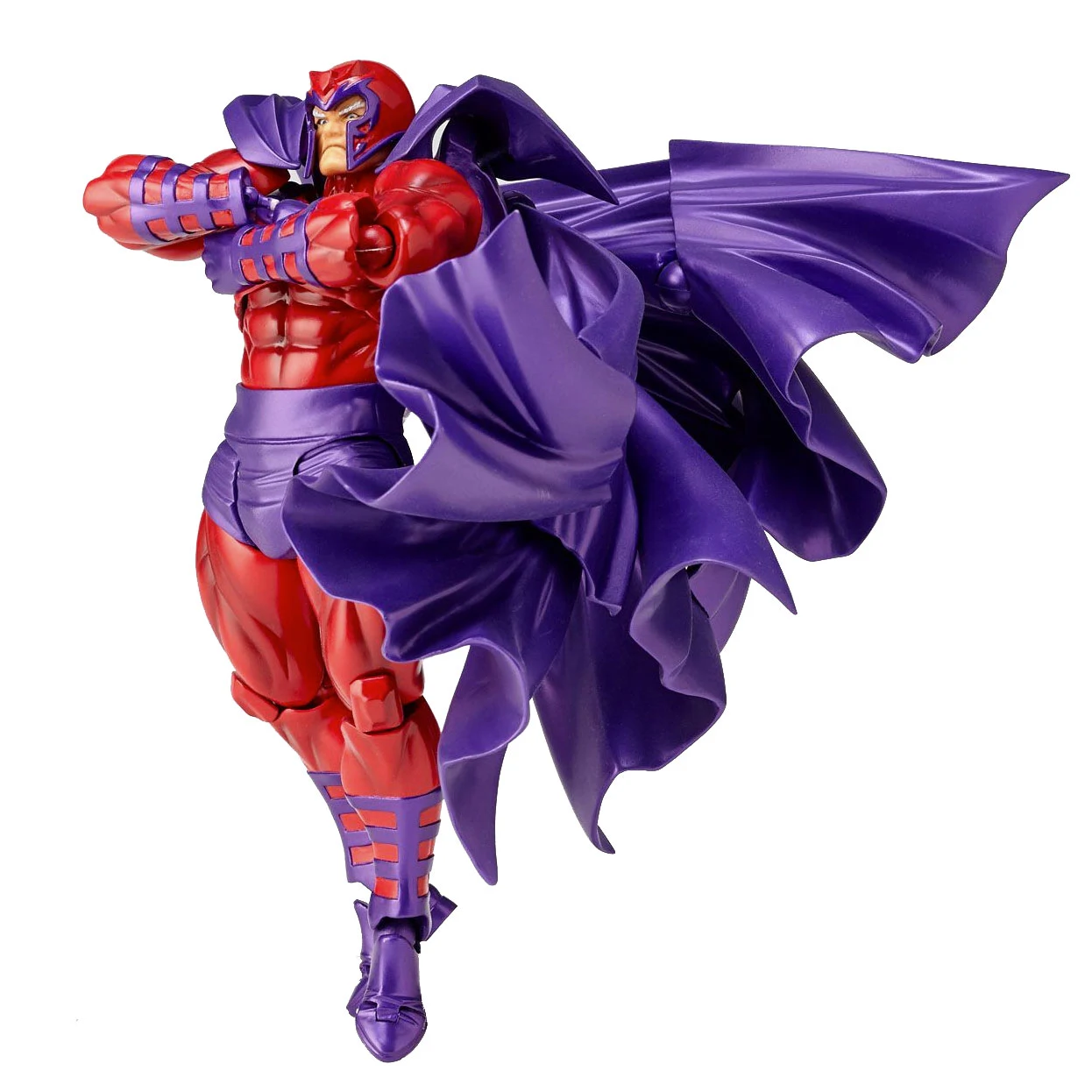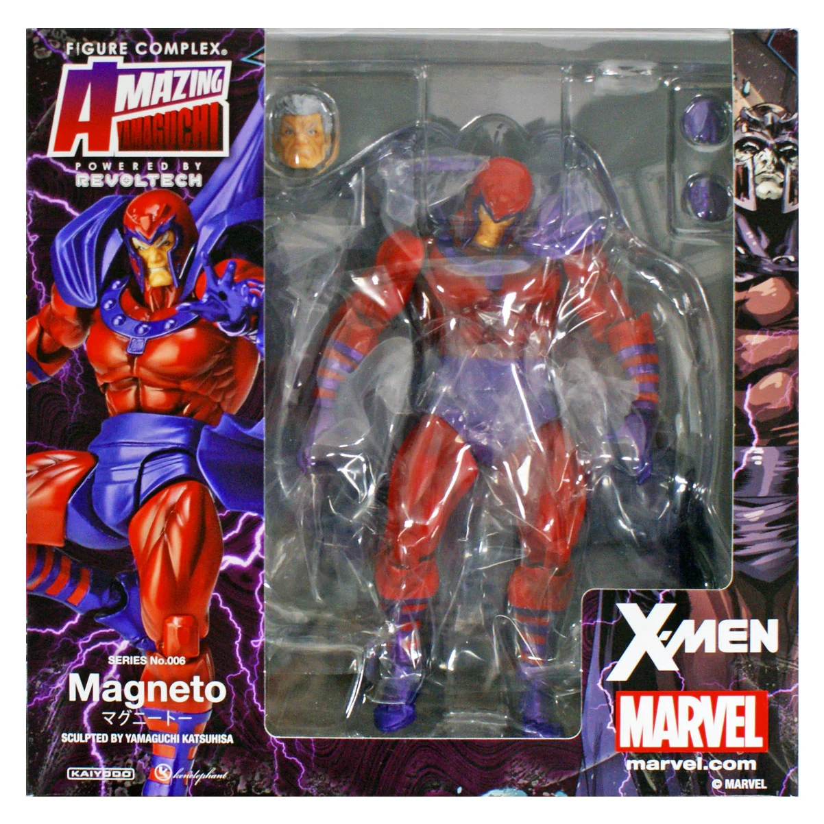 Magneto from "X-Men" joins the Amazing Yamaguchi figure lineup! He's about 6.50 inches tall, and has joints in an amazing 45 places for superb posability--even his flowing cape is jointed! He has two facial expressions, two interchangeable heads (one with his helmet and one without), two interchangeable hands, and a display stand. Effects parts are also included (they attach with magnets, fittingly enough).