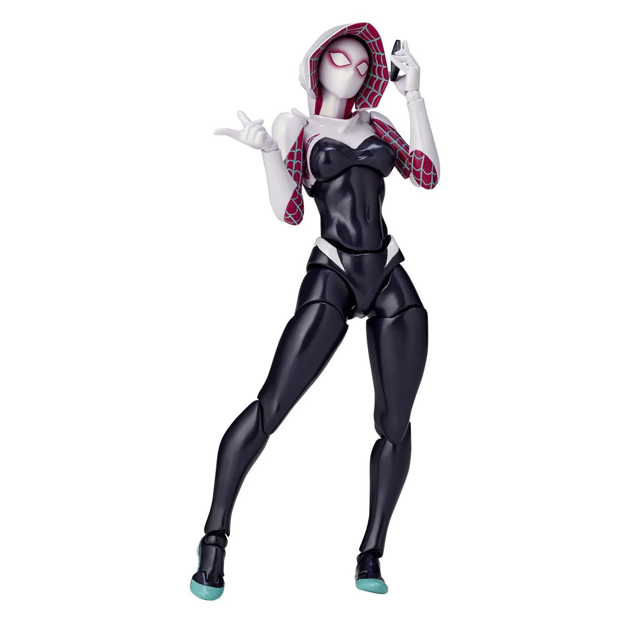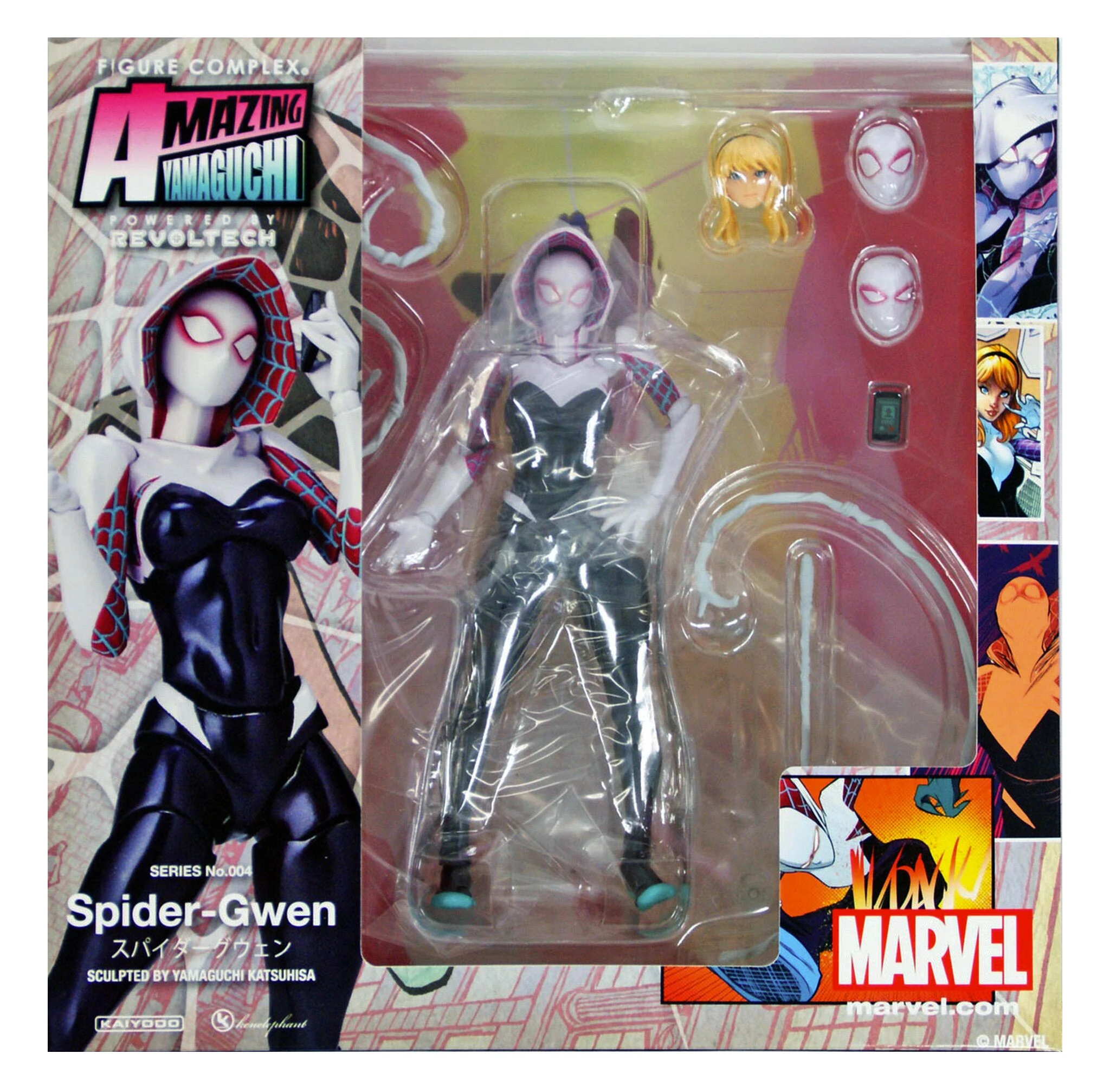 Spider-Gwen gets an Amazing Yamaguchi figure from Kaiyodo, and she looks fantastic! Look at how astonishingly posable she is, and check out the three interchangeable facial expressions (including an unmasked head part), multiple interchangeable hands, and webbing parts--she even comes with her cell phone!