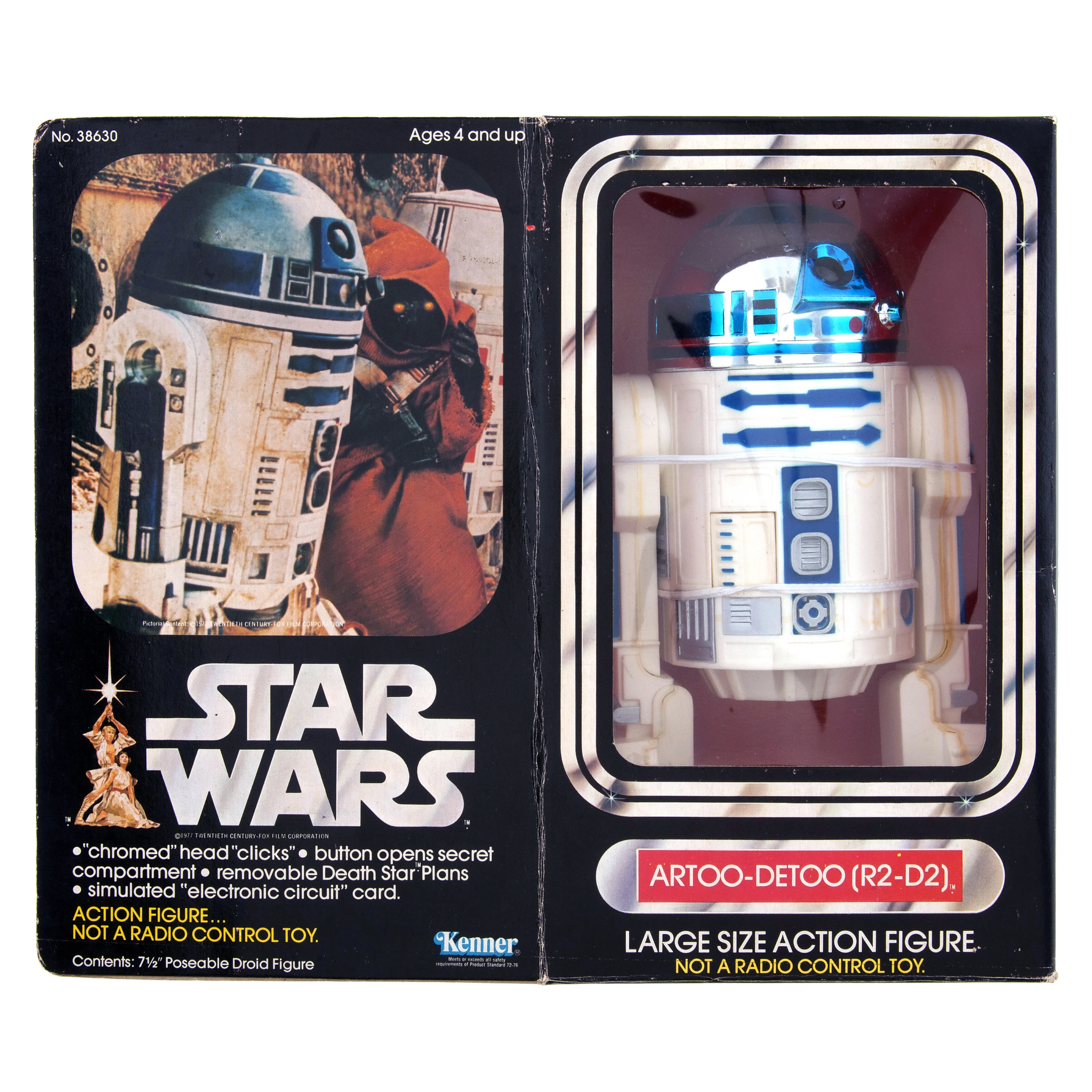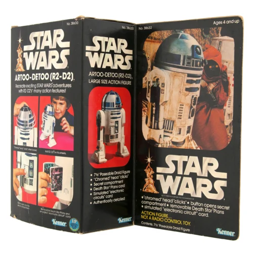 Figure has secret compartment "Death Star Plans" card, simulated "Electronic Circuits" card and wheels on feet.