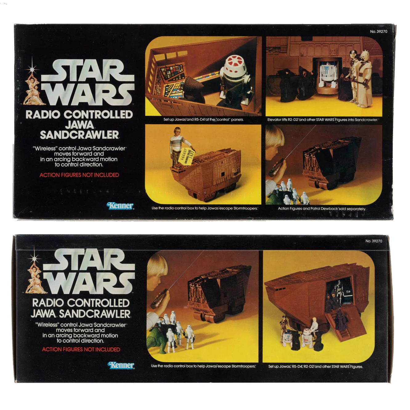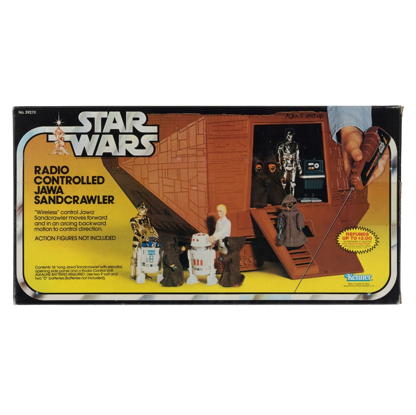 contains 16" long battery-operated Jawa Sandcrawler w/elevator, opening side panel and a radio control unit.