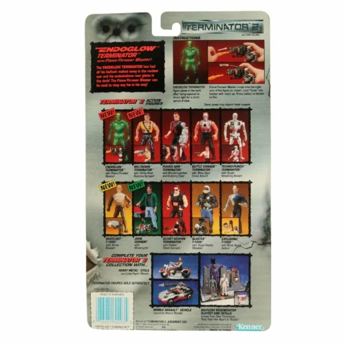 With Flame-Thrower Blaster! The Endoglow Terminator has had all his bioflesh melted away in the nuclear war and his endoskeleton now glows in the dark! The Flame-Thrower Blaster can be used to stop any foe in his way!