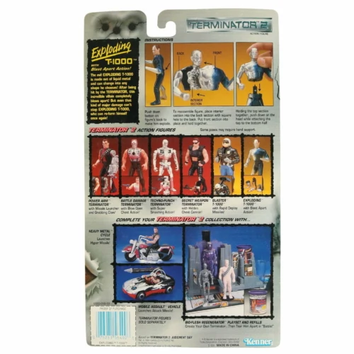 With Blast Apart Action! The evil exploding T-1000 is made out of liquid metal and can change into any shape he chooses! After being hit by the Terminator, this incredible villain completely blows apart! But even that kind of major damage can't stop Exploding T-1000, who can re-from himself once again!