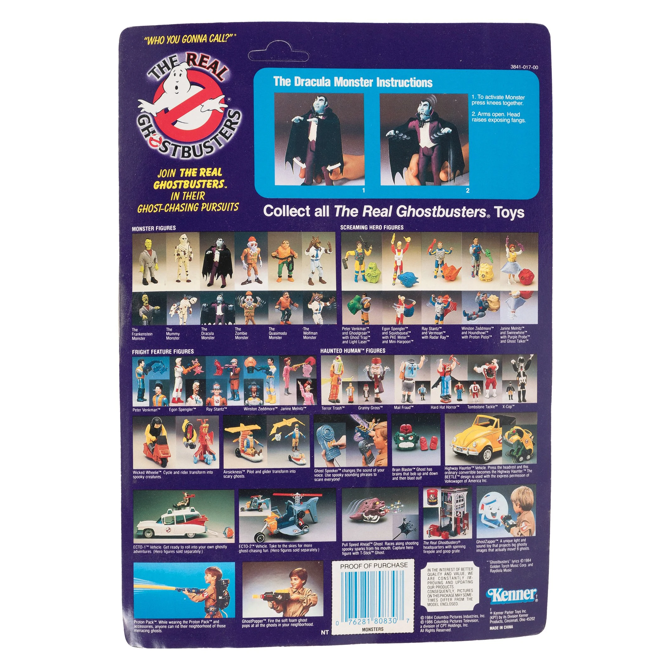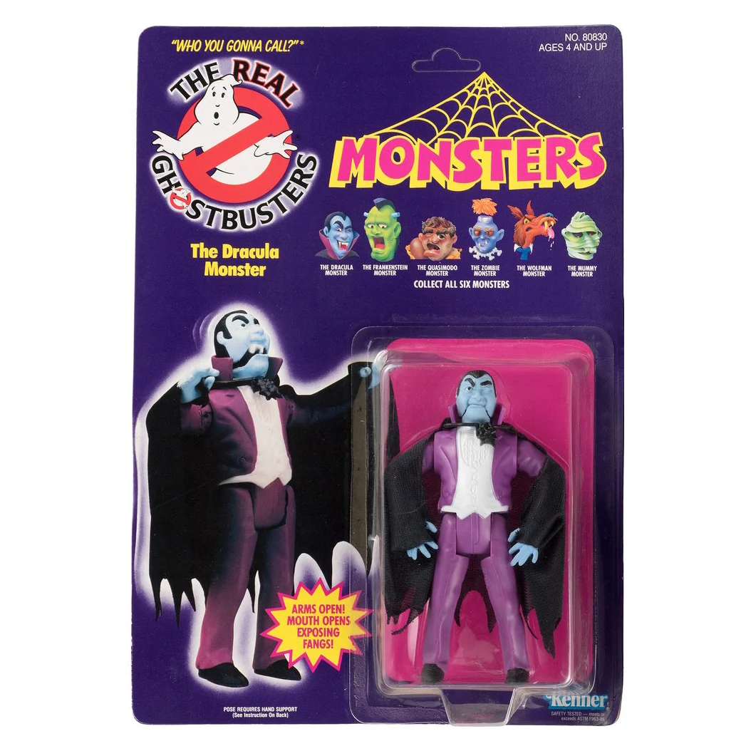 Monster Figure: The Dracula Monster an action figure which is part of Kenners The Real Ghostbusters Toy Line's (Classic) Monsters set. The Monsters set also included Frankenstein, Mummy, Zombie, Quasimodo, and Wolfman. While not suggested in the materials, five of the six monsters appear to be based in part to Universal Monsters. Some promotions call the set "Classic" Monsters, however the cards say simply "Monsters".