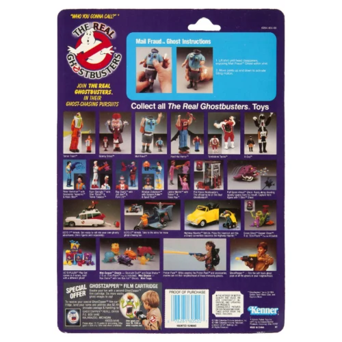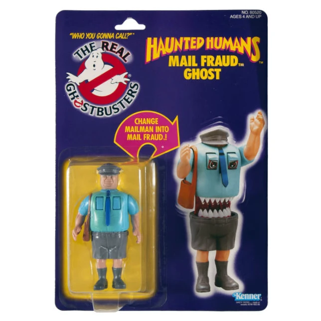 Haunted Human Figure: Mail Fraud Ghost is an action figure which is part of Kenners The Real Ghostbusters Toy Line's Haunted Humans set. It featured Mail Fraud, a ghoul with a monstrous face with sharp fangs and googly eyes hidden within his body. The Haunted Human set also included Terror Trash, Granny Gross, Hard Hat Horror, Tombstone Tackle, and X-Cop. Later, Kenner also released two Haunted Vehicles, which had a human and vehicle that changed into ghosts/monsters. The two Haunted Vehicle sets: Air Sickness, and Wicked Wheelie.