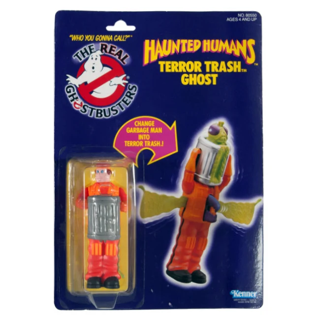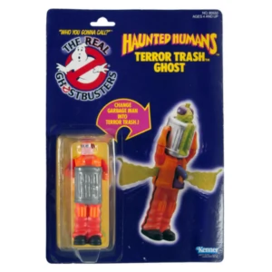 Haunted Human Figure: Terror Trash Ghost is an action figure which is part of Kenners The Real Ghostbusters Toy Line's Haunted Humans set. It featured Terror Trash, a ghoul with a dragonfly's head, jaws and wings. The Haunted Human set also included Granny Gross, Mail Fraud, Hard Hat Horror, Tombstone Tackle, and X-Cop. Later, Kenner also released two Haunted Vehicles, which had a human and vehicle that changed into ghosts/monsters. The two Haunted Vehicle sets: Air Sickness, and Wicked Wheelie.