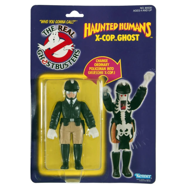 Haunted Human Figure: X-Cop Ghost is an action figure which is part of Kenner's The Real Ghostbusters Toy Line's Haunted Humans set. It featured X-Cop, a skeleton-like ghoul with glowing eyes and a jaw that opened farther than normal. The Haunted Human set also included Terror Trash, Granny Gross, Mail Fraud, Hard Hat Horror, and Tombstone Tackle. Later, Kenner also released two Haunted Vehicles, which had a human and vehicle that changed into ghosts/monsters. The two Haunted Vehicle sets: Air Sickness, and Wicked Wheelie.