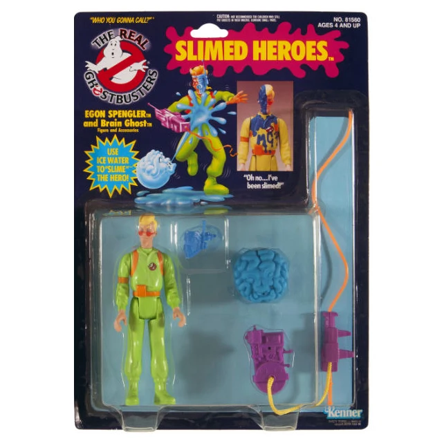 Slimed Hero Figure: Egon Spengler an action figure which is part of Kenners The Real Ghostbusters Toy Line's Slimed Heroes set. Based on The Real Ghostbusters animated series Egon Spengler. For most markets, this was the last version of Egon released by Kenner. The Slimed Heroes group also included Peter, Ray, Winston, and Louis. This group once again used the classic mold designs and also reused the proton pack designs. This is the first line other than the Classic Heroes to not include a Janine Melnitz in the lineup. This group is noted for have consistency issues with plastic colors.