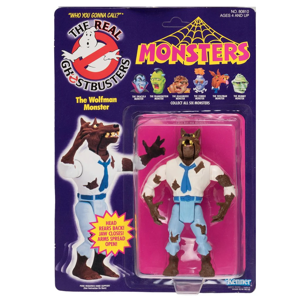 Monster Figure: The Wolfman Monster an action figure which is part of Kenners The Real Ghostbusters Toy Line's (Classic) Monsters set. The Monsters set also included Frankenstein, Mummy, Dracula, Zombie, and Quasimodo. While not suggested in the materials, five of the six monsters appear to be based in part to Universal Monsters. Some promotions call the set "Classic" Monsters, however the cards say simply "Monsters".