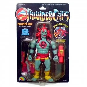 Mumm-Ra is a toy that was released in every series of the LJN Toyline and is based on the 80's version ThunderCats series character Mumm-Ra. The toy featured the "Battle-Matic Action" whereby pushing down the lever on its back, made both of Mumm-Ra's arms move up and down. The figure also had poseable head, arms and legs. The Mumm-Ra figure also had "Light Up Eyes". When the included Power Ring was inserted into the contact point on the figure's back, it made Mumm-Ra's eyes light up. The Power Ring required one AAA Battery to operate. The only other toy in the Thundercats line which had this feature was the Lion-O figure.