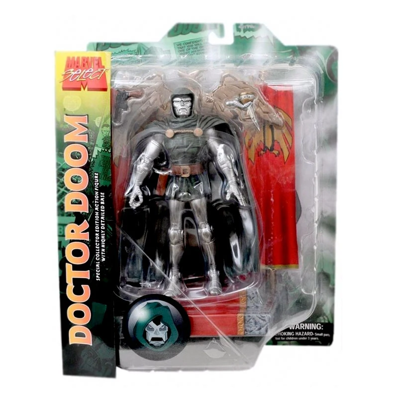 A diamond select release. From the pages of Fantastic Four comes one of the Marvel Universe's most notorious villains, Doctor Victor Von Doom. Figure stands 7" tall and includes a detailed throne display base and variant hand. Deluxe blister card package. A diamond select release. One of Marvel Comics' iconic villains. Stands 7" tall. Includes throne display base and variant hand. Deluxe packaging.