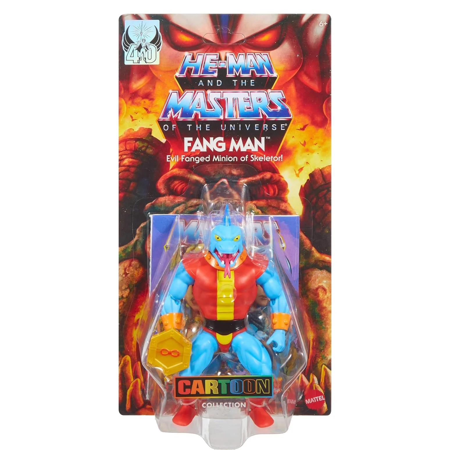 This MOTU Origins Fang Man action figure joins the Cartoon Collection, inspired by the original He-Man and the Masters of the Universe TV series from the ’80s. The evil fanged minion of Skeletor has a vintage look at 5.5-inch scale, but with the modern posability of 16 movable joints. This MOTU villain comes with a Wheel of Infinity accessory inspired by the episode “The Time Corridor.” A mini-comic is included for story context. Packaging now features thicker cardboard for in-pack display.