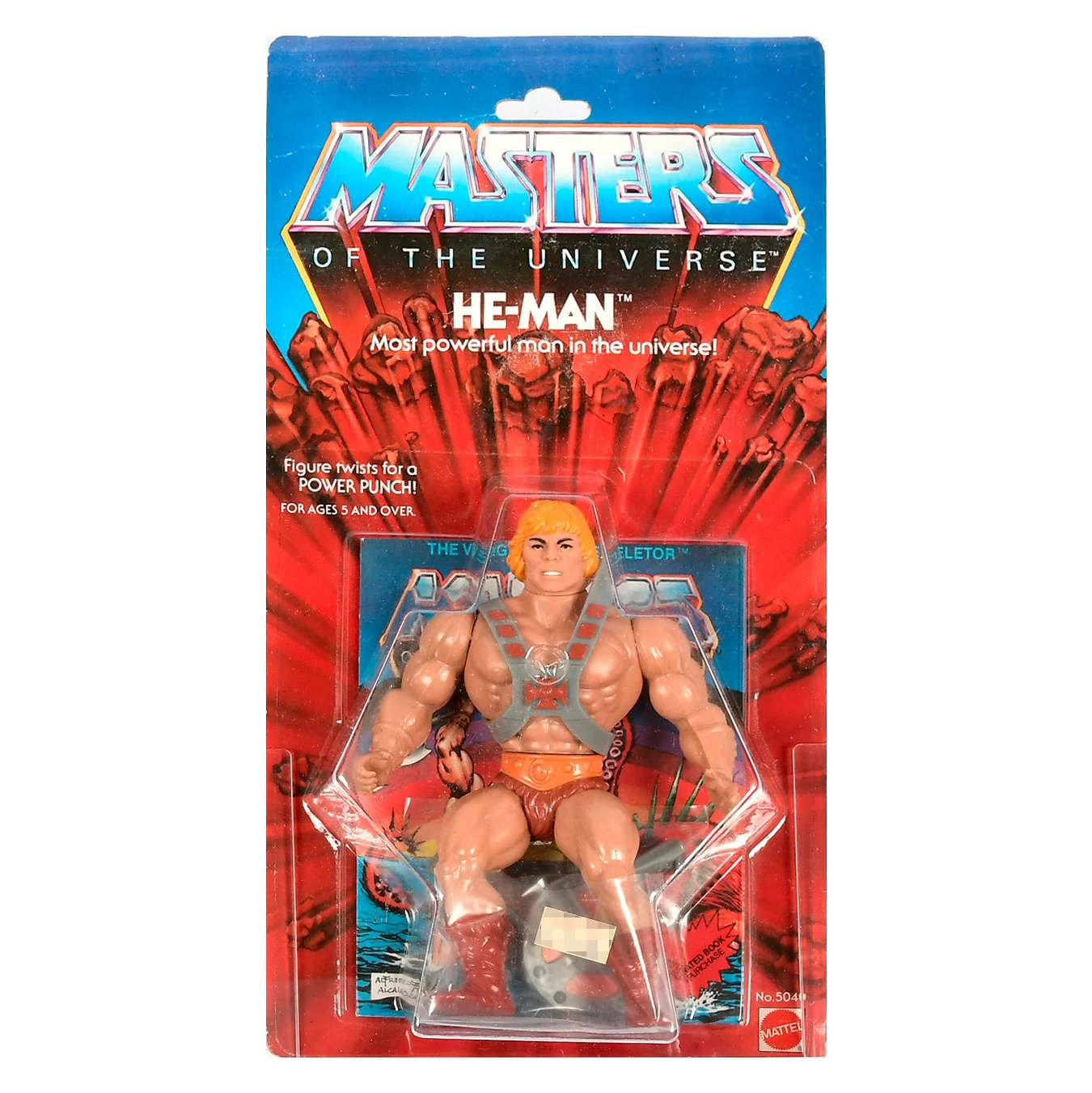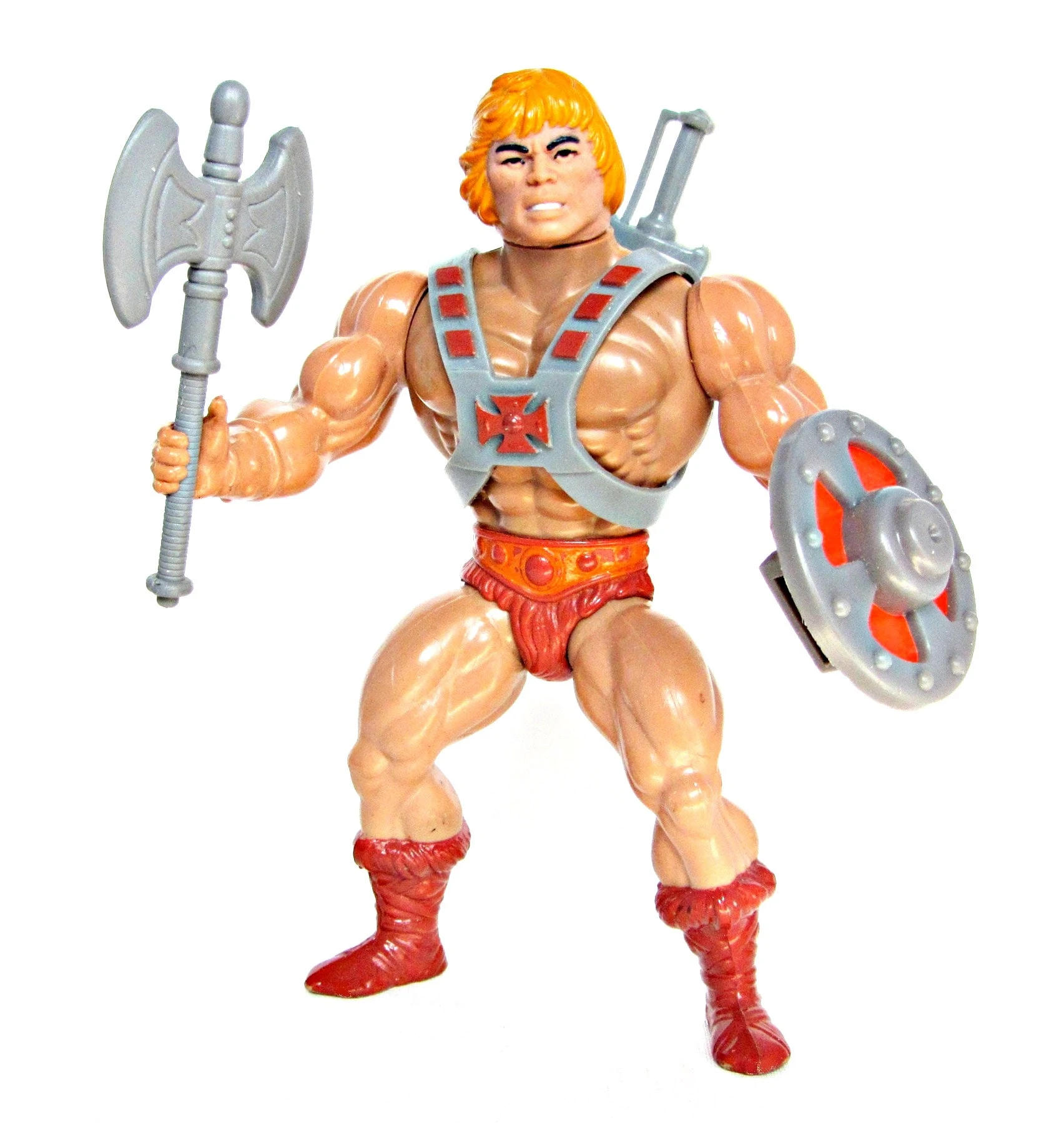 The first He-Man action figure was released by Mattel in 1981, and had a twist waist and power punch action. The figure came with the grey half of the Power Sword, a battle axe and a shield, together with a removable baldric.