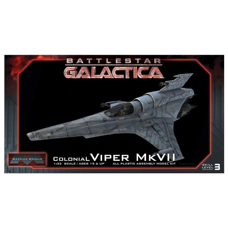Capable of atmospheric flight, the Mark VII is the front-line variant of the Viper design, retaining the Mark II's general layout but adding fully integrated avionics that provide superior battle management and flight information for the pilot. Ironically, it is this incorporation of new integrated systems that prevents the majority of Mark VIIs from being effective during the Cylon attack: as with the majority of Colonial Fleet, the Mark VIIs suffer fatal computer system failures on contact with Cylon forces. This all-plastic assembly kit requires glue and paint for finishing and is compatible, at 1/32nd-scale, with previous BSG kit releases. Full color decals, landing gear, pilot figure, and display stand included.