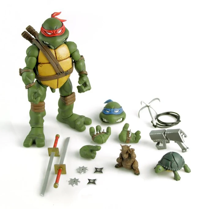 Accessories : Classic Comic Red Mask Head, Cartoon Blue Mask Head, Dual Katana and Scabbards, 1 set of C-Grip Hands, 1 set of Climbing Claw Hands, Unique "Pointing Finger of Leadership" Hand, 2 Four-Point Shuriken, 2 Eight-Point Shuriken, Grappling Hook and Cord, Utrom Blaster, Belt with Scabbard Straps, Pre-Mutation Splinter, Pre-Mutation Baby Leonardo.
