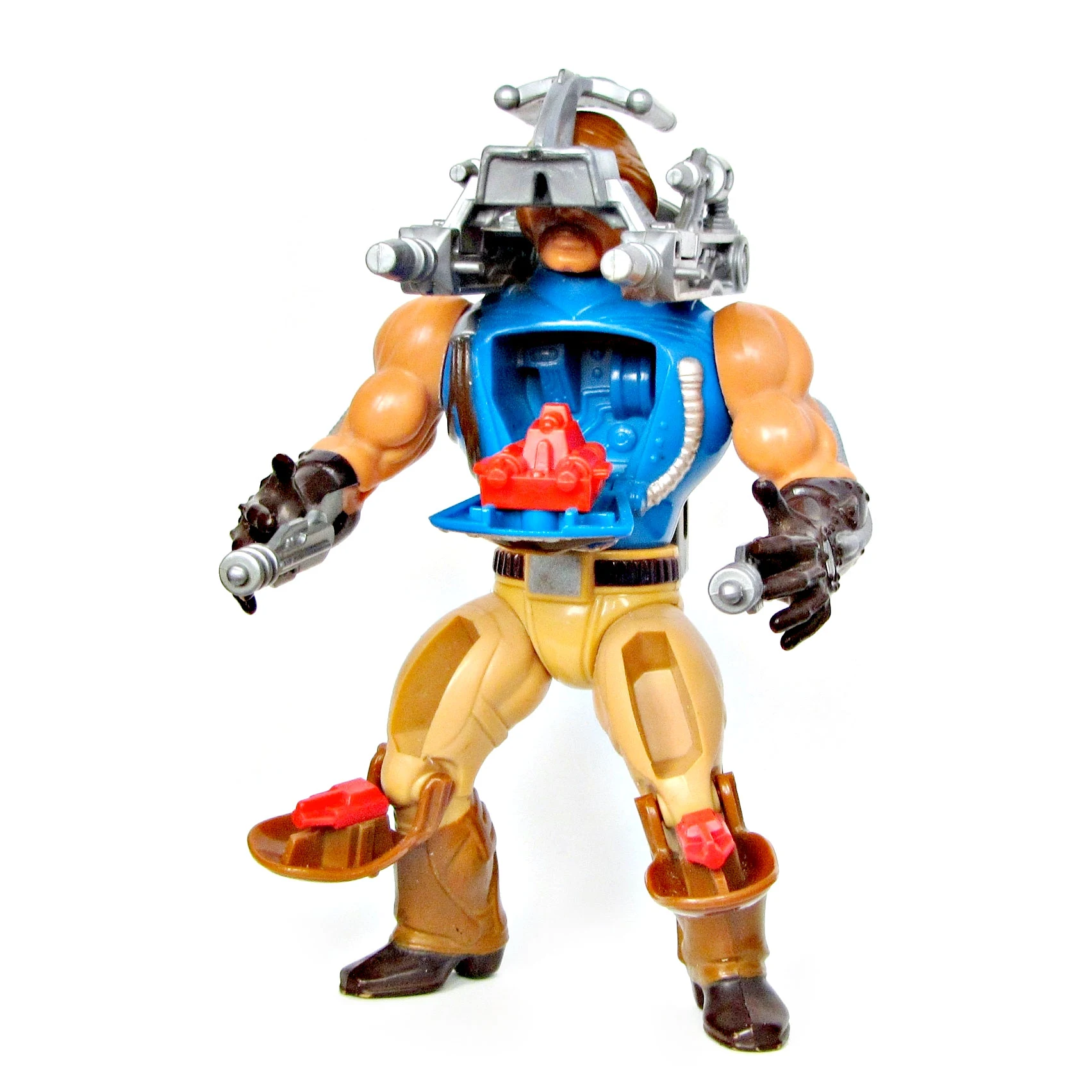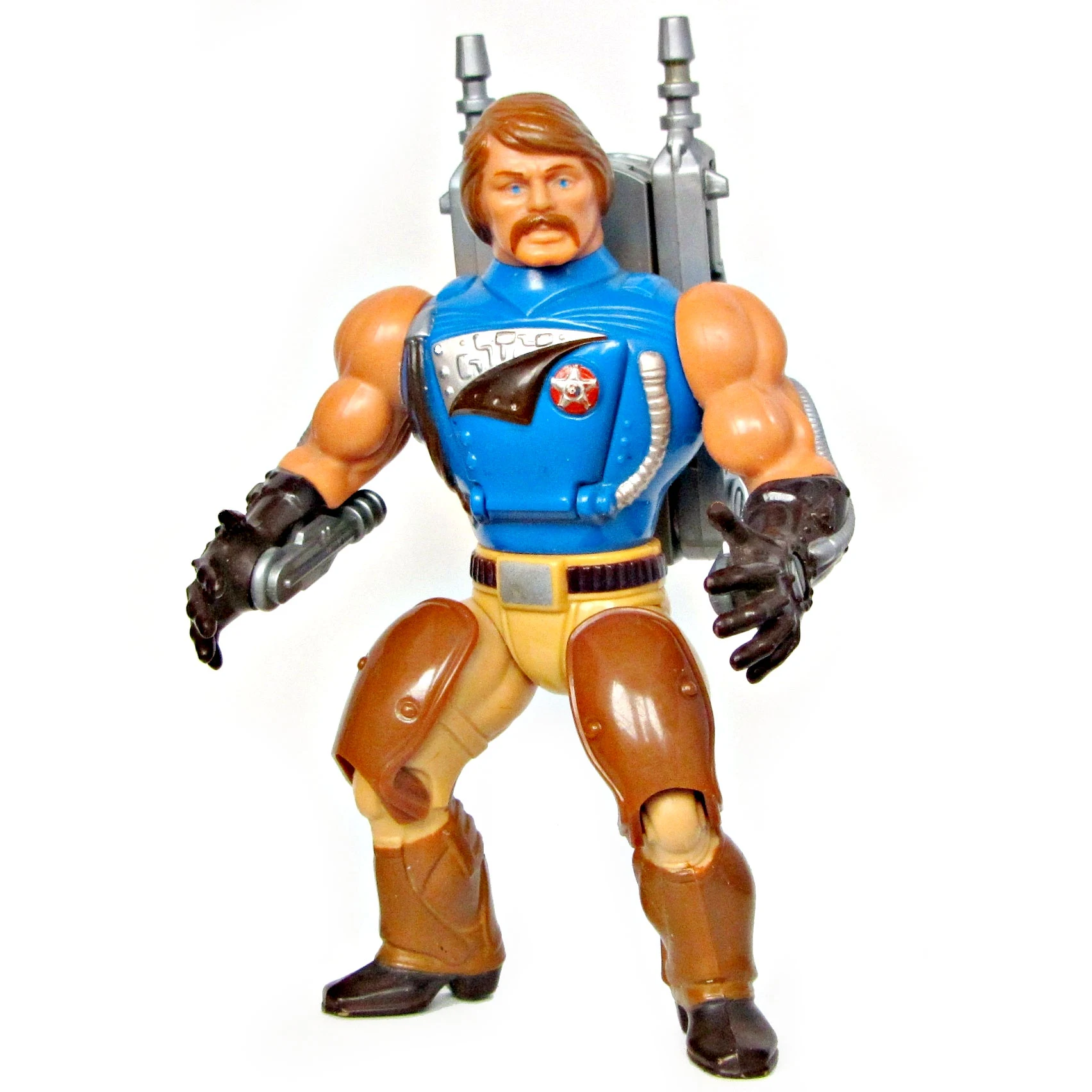 Features multiple blasters that flip out from his legs, wrists and chest as well as a dual blaster backpack that flips over his head.