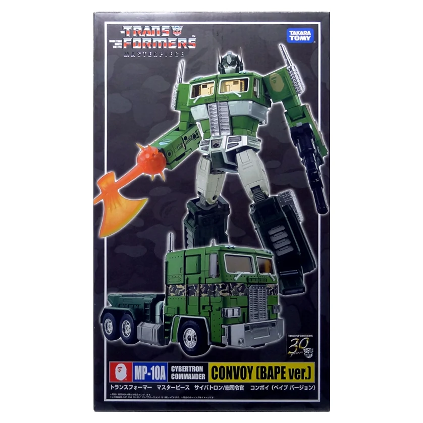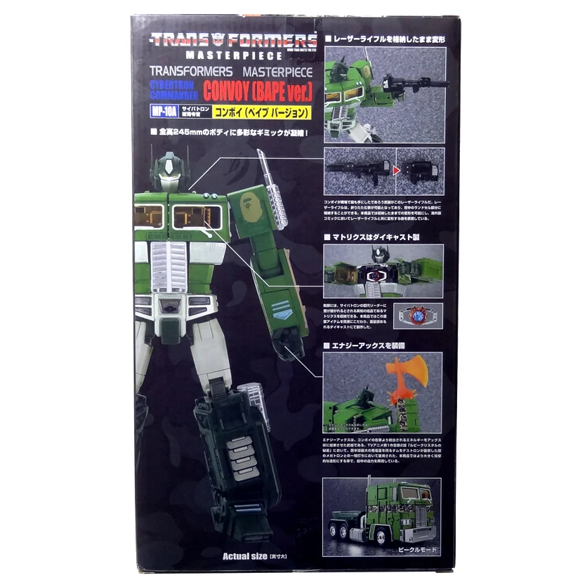 Available exclusively from Japanese clothing company A Bathing Ape in 2014, MP Convoy Reissue BAPE Ver. is a trailer-less redeco of the MP-10 mold sporting a green color scheme matching the Convoy Reissue BAPE Ver. of the original G1 toy, with "BAPE's famous camouflage pattern" and an ape head print on the shoulder replacing the usual faction symbol.