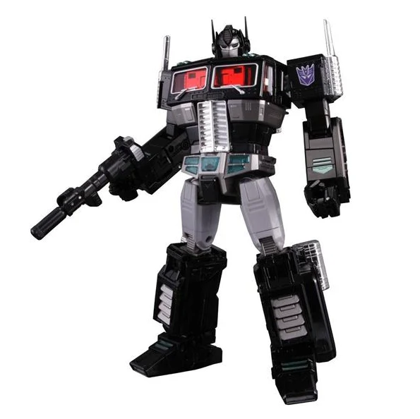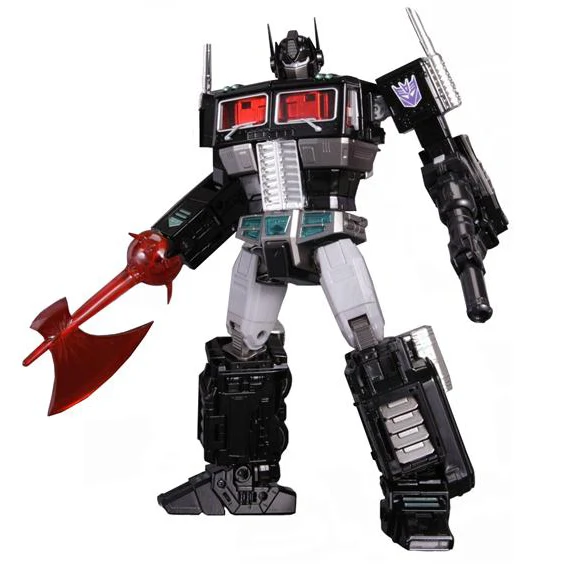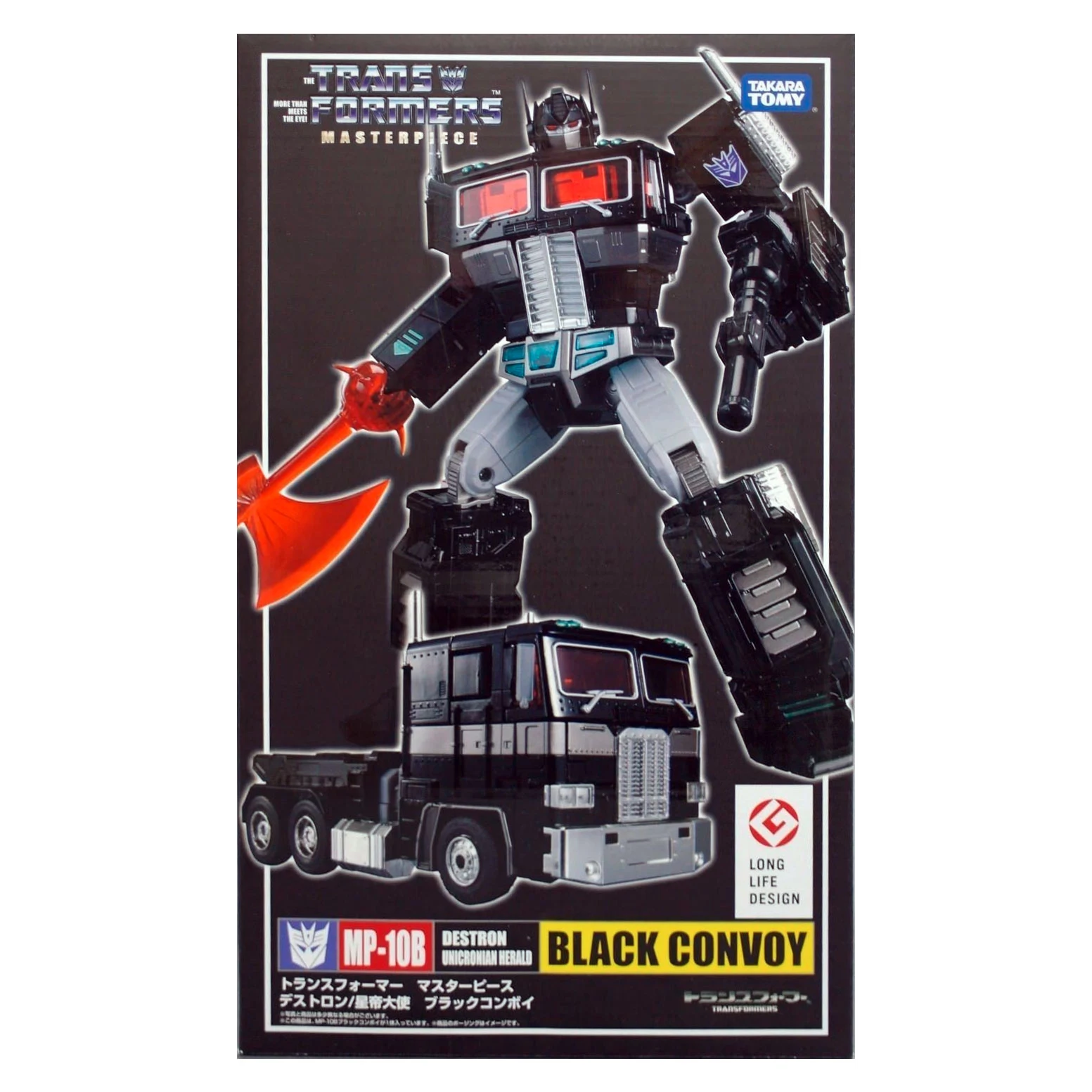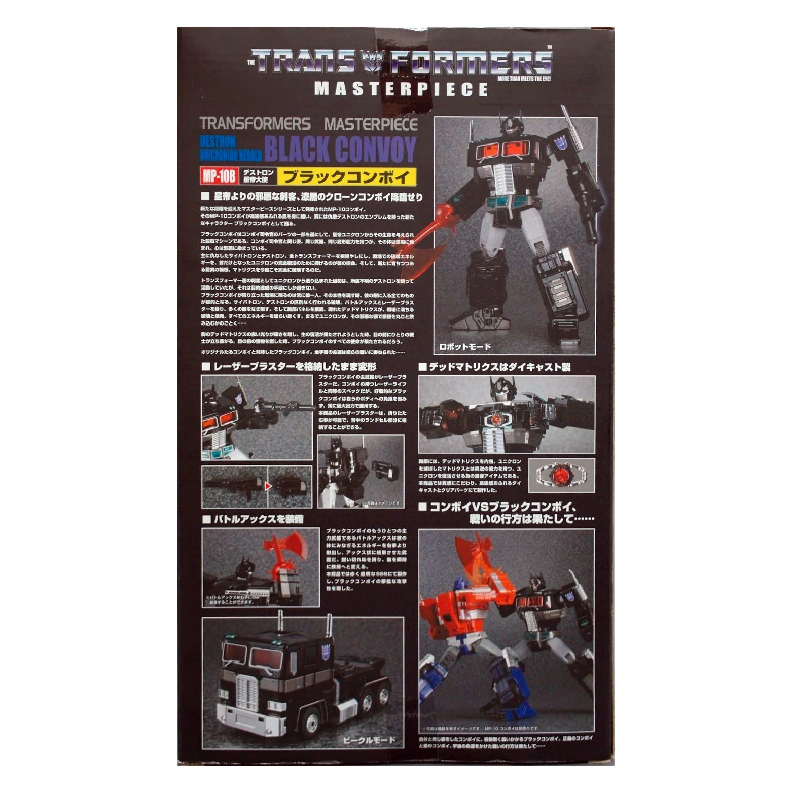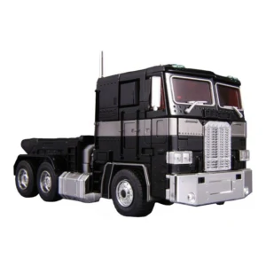 Masterpiece MP-10B Black Convoy is a black redeco and minor retool of MP-10 Convoy, in the typical black/grey/teal color scheme with red windows, and with a tampoed Decepticon insignia shoulder panel instead of the molded Autobot one, but lacking the trailer, Roller, and the Spike Witwicky figure. He transforms into a Freightliner FL86, and comes with a hand-held laser blaster which can collapse and store inside a compartment on his back in either mode, as well as a battle axe that slips over Black Convoy's right hand. His chest opens up to reveal the removable Dead Matrix, which is made of die-cast metal, and can be held by one of Black Convoy's hands. When purchased from sellers supplied by Hasbro Asia, Black Convoy came with a collector coin, in a unique black metallic finish. The coin is mounted on a card resembling a dark-tinted Matrix which slides open laterally, like the Matrix itself, to reveal the coin inside. TakaraTomy reissued this figure in December 2017.