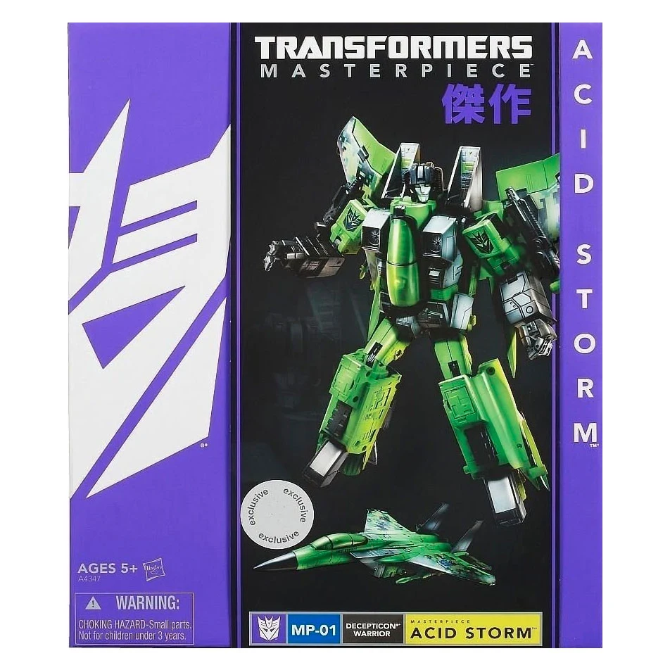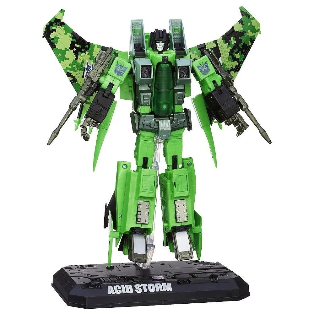Masterpiece Acid Storm is a Toys"R"Us-exclusive redeco of MP-11 Starscream (himself a heavy retool of MP-3 Starscream), but without the coronation gear. He transforms into an F-15 Eagle fighter jet, and features numerous built-in gimmicks, such as an opening panel at the top-center of the jet, adjustable thrust vectors, a sculpted radar hidden in his nosecone, and an opening canopy. In robot mode, he features missile pods hidden in his chest. For accessories, his non-firing cannons are attached to extending armatures so that they don't have to be removed for transformation, but they each have a 5mm post, and can be easily detached via ball joint. He also comes with two missile racks which peg via 5mm post onto ports on his wings, provided the cannons (which normally mount there in vehicle mode) are removed. Also included is a pilot figurine that can fit in his cockpit, and he additionally has a clip that is intended to mount underneath the cockpit and hold the Megatron gun initially included with 20th Anniversary Optimus Prime/Masterpiece MP-1 Convoy. Finally, he comes with a two-piece stand, which has two peg-holes to store two of his weapons, and can be configured for either robot or vehicle mode. On the sides of his cockpit, he sports tampographed names of a pilot and a co-pilot: "MSGT. [Master Sergeant] B 'Vicious' Vala" (after Hasbro designer Bobby Vala[1]) and "SSGT. [Staff Sergeant] Etipsone" (after graffiti artist Etipsone[2]). Acid Storm's instructions neglect to mention numerous steps of his transformation, such as the fact that the strut his nosecone is attached to is on a slide joint that allows it to slide into the cockpit more and help compact his kibble backpack. It also fails to mention the fact that he has heels hidden in compartments just in front of his thrusters, and that his tail-fin/rear wing assemblies are also on slide joints, allowing them to slide up and allow his toes and heels to both touch the surface at once. To make matters worse, his instructions only tell you how to transform him into vehicle mode... despite the fact that he's packaged in vehicle mode. Acid Storm, along with fellow Masterpiece, Soundwave, was first released in limited numbers in conjunction with San Diego Comic-Con 2013. Acid Storm was later made available in TakaraTomy's markets as a "USA Edition" of sorts, still exclusive to Toys"R"Us. While the figure itself was unchanged, the packaging was altered to change his ID number, among other things. Common to both versions is a designated number marking him as part of the Thrilling 30 line. Acid Storm's original deco would have been significantly different, such as featuring a different pilot and co-pilot ("MSGT. Bill 'Brawlin' Brawley" and "SSGT. Mark 'Tag' Maher"), and being far more busy. He would have had numerous additional tampographs, such as a reference to him being part of the "924th Rainmakers", a reference to a "Toxitron Weapons System", "Bringing the Pain Rain", and even Rainbow Dash's cutie mark!
