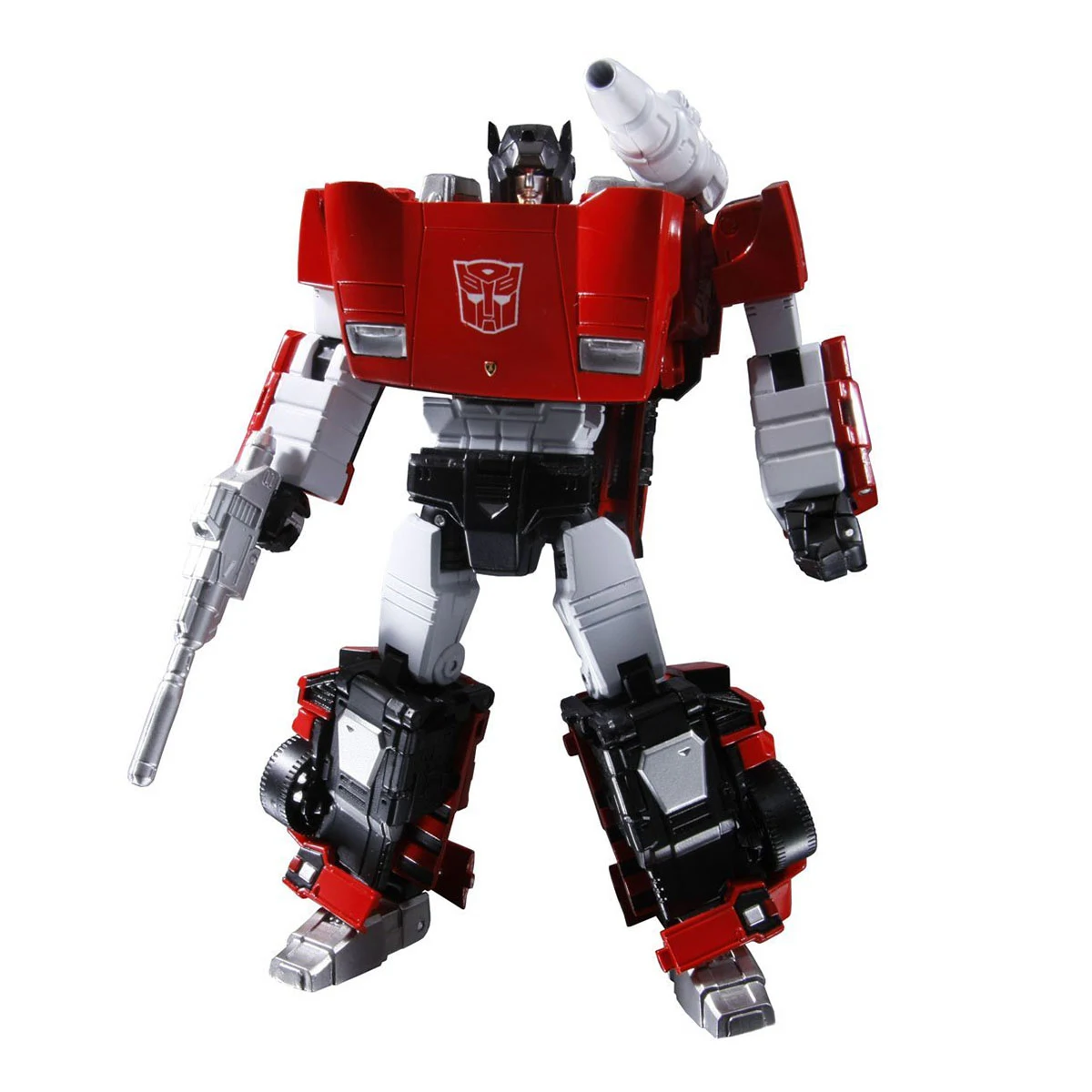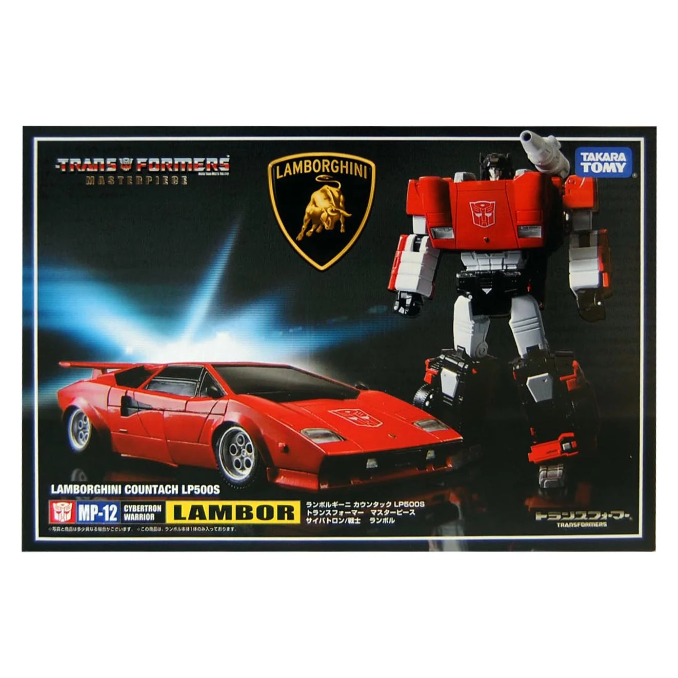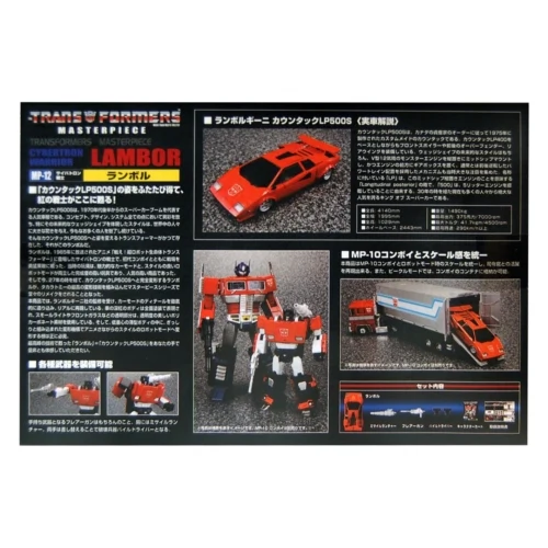 Masterpiece Sideswipe transforms into a licensed Lamborghini Countach LP500S. As with other figures in the Masterpiece line, he is intended to be an accurate representation of his cartoon model, and even features a Lamborghini-supervised paint scheme, such as glossy red paint covering the entirety of his vehicle mode panels and robot shoulders, as well as various bits of black detailing to make it accurate to the real-life vehicle. Standing at around 6¼ inches (or 15.5 centimetres) from head to toe in robot mode, he is also in scale with MP-10 Optimus Prime, and can fit inside Prime's trailer in vehicle mode. In contrast to larger entries in this line, Lambor lacks die-cast parts, and his tires are cast in hard, non-rubberized plastic. For accessories, he comes with his hand-held flare gun, and his non-firing missile launcher, which is jointed at the peg to allow it to pivot up and down, and can mount on either shoulder in robot mode. Both his launcher and gun can be combined and mounted on a self-covering peg-hole on his vehicle roof/robot back. He also comes with a pair of pile drivers, which can snap onto the ends of his forearms when either hand is flipped in, and are based on the blunt arm pistons he uses in "A Plague of Insecticons". If purchased in Japan through Amazon.com, one additionally gets a different vacuum-metalized pair of pile drivers, which are based on the jackhammer-like pistons he uses in "Dinobot Island, Part 2". If purchased in other Asian markets outside of Japan, a collector's coin is included instead. Both the coin and its wheel-shaped package identify him as Sideswipe instead of Lambor. In Malaysia, Lambor included both the additional Amazon.co.jp pile drivers and the coin. A reissue of the figure in September 2015 came with a different coin, coming in a package shaped like Sideswipe's chest/front hood. This mold was redecoed and retooled to make MP-14 Alert. Lambor's version of the mold, with Alert's face, was then redecoed into MP-12T Tigertrack.
