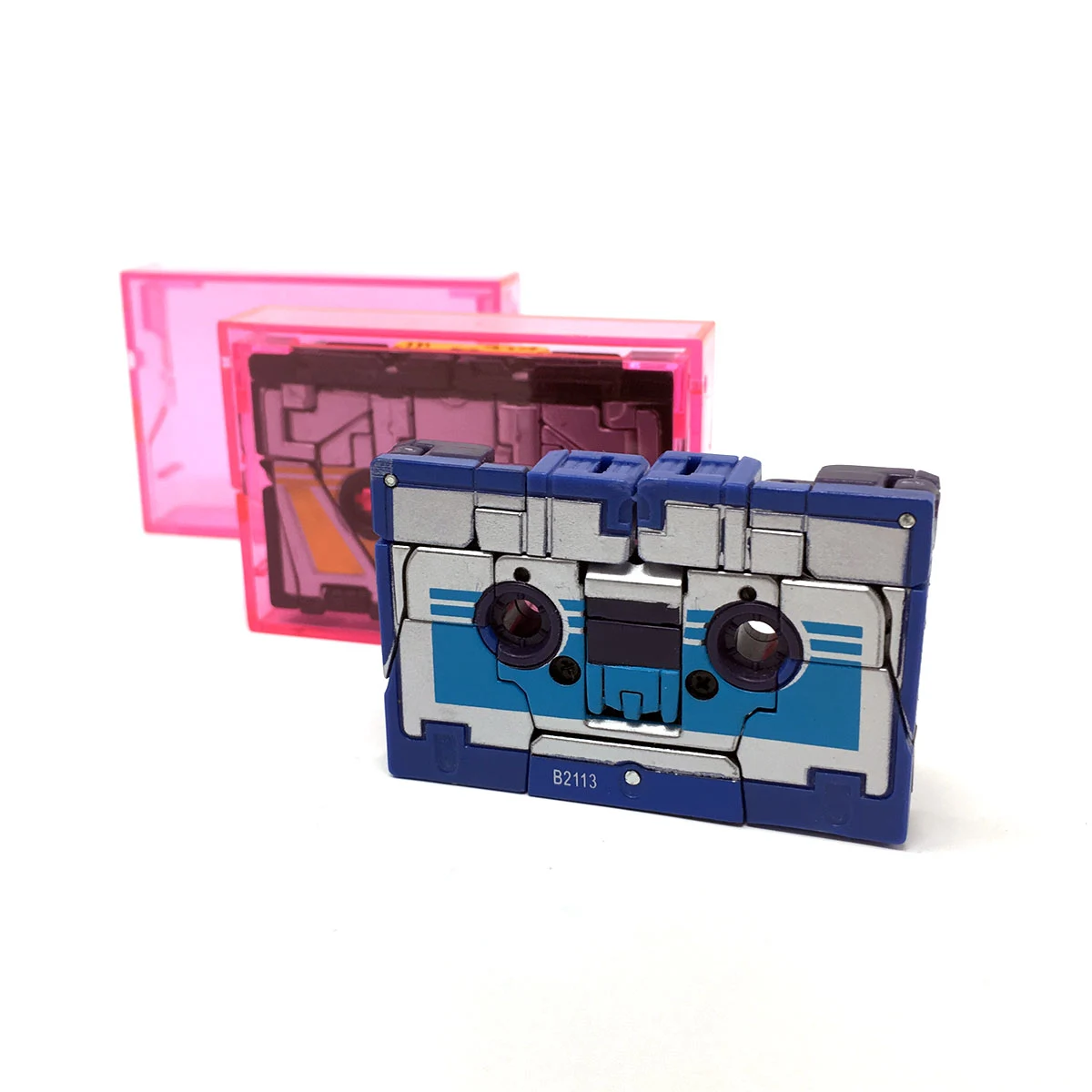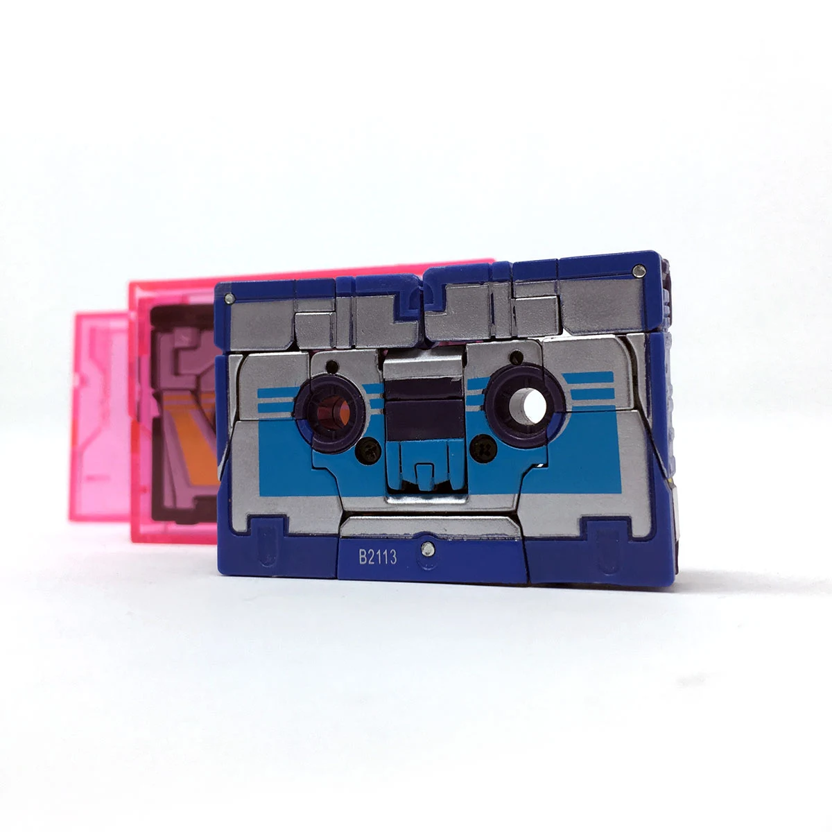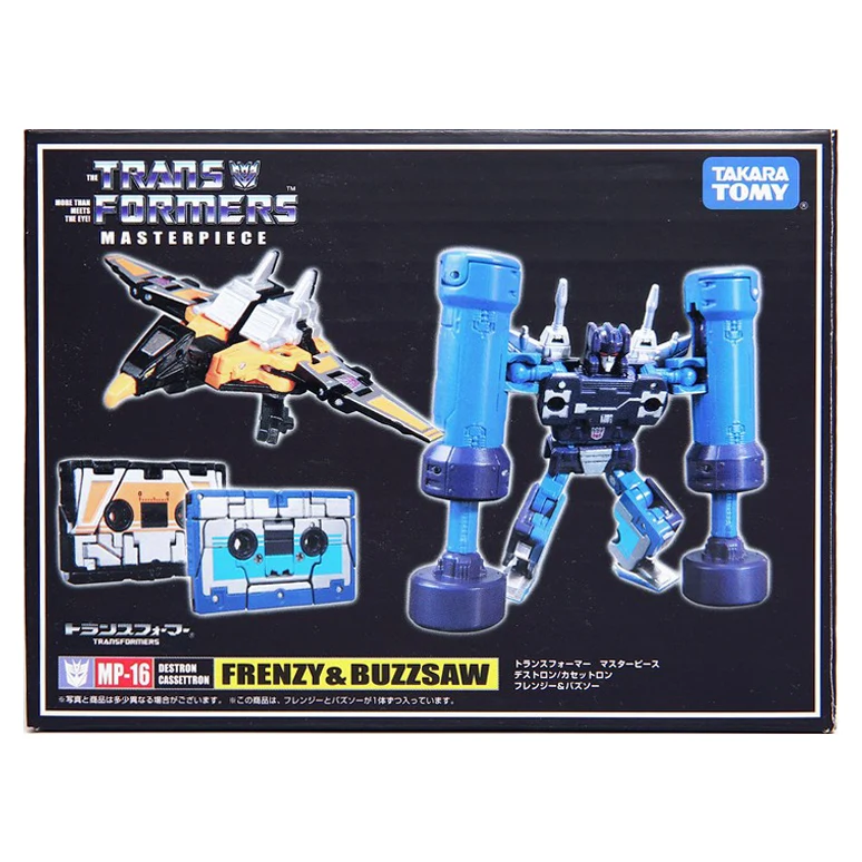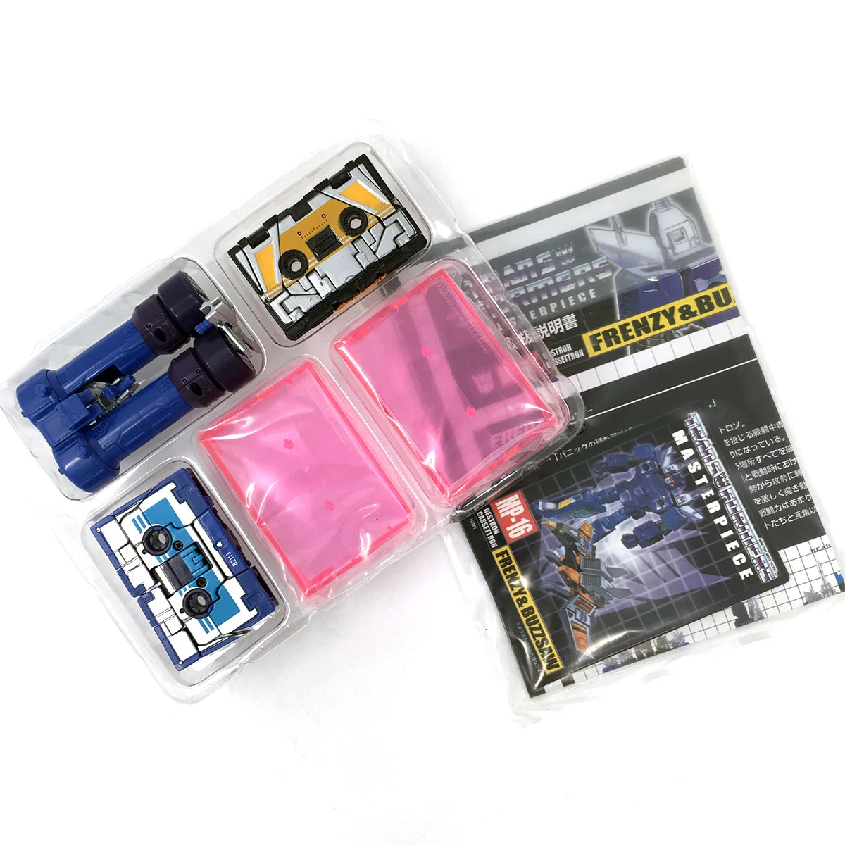 Masterpiece Frenzy is, of course, a redeco of Masterpiece MP-15 Rumble, who was released only a month beforehand. He is an updated version of the original Generation 1 toy, transforming from a highly articulated robot to a mini-cassette the same size as his Generation 1 toy. He still has his traditional Thruster Gun weapons, which can peg onto his back, or be held by his hands via 3mm post. He comes with a pink case which can be used to store him in tape mode. Frenzy comes with two large piledriver accessories which clip onto his arms. The piledrivers can connect to a mounting piece that allows them to be worn on the figure's back when not in use, and they also contain hollows to store his Thruster Guns. The mounting piece can also attach to his back on its own to resemble a battery pack. The piledrivers can also interact with other figures: They can clip to Masterpiece Soundwave's forearms to form cannons, or combine with Masterpiece Rumble's own piledrivers and link up with Soundwave's "sensor" accessory to form the interface cable that allows Soundwave to connect to other devices. He comes in a two-pack with Buzzsaw. This mold was also used to make Masterpiece Enemy.