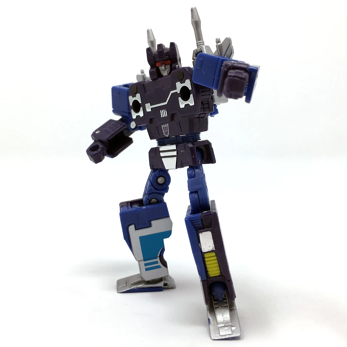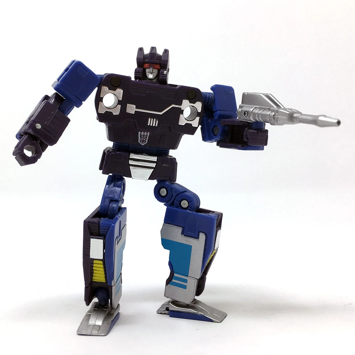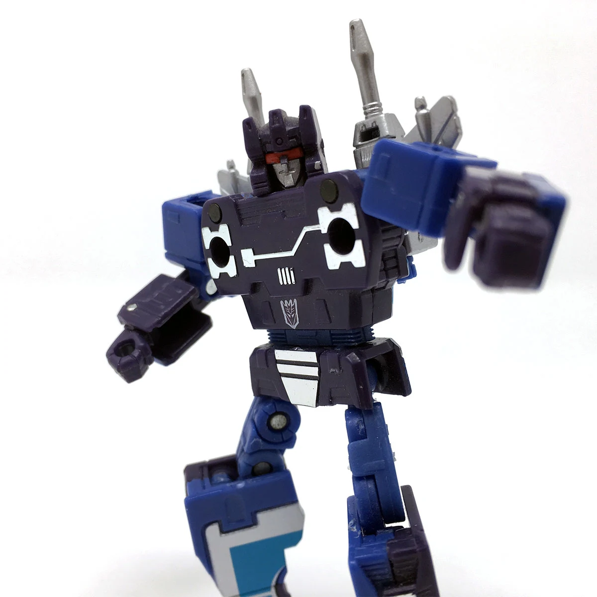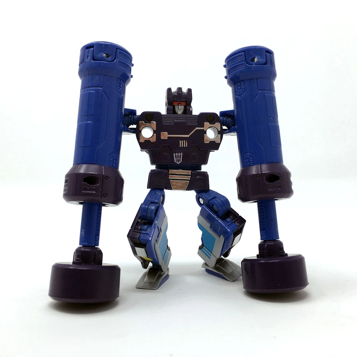 Masterpiece Frenzy is, of course, a redeco of Masterpiece MP-15 Rumble, who was released only a month beforehand. He is an updated version of the original Generation 1 toy, transforming from a highly articulated robot to a mini-cassette the same size as his Generation 1 toy. He still has his traditional Thruster Gun weapons, which can peg onto his back, or be held by his hands via 3mm post. He comes with a pink case which can be used to store him in tape mode. Frenzy comes with two large piledriver accessories which clip onto his arms. The piledrivers can connect to a mounting piece that allows them to be worn on the figure's back when not in use, and they also contain hollows to store his Thruster Guns. The mounting piece can also attach to his back on its own to resemble a battery pack. The piledrivers can also interact with other figures: They can clip to Masterpiece Soundwave's forearms to form cannons, or combine with Masterpiece Rumble's own piledrivers and link up with Soundwave's "sensor" accessory to form the interface cable that allows Soundwave to connect to other devices. He comes in a two-pack with Buzzsaw. This mold was also used to make Masterpiece Enemy.
