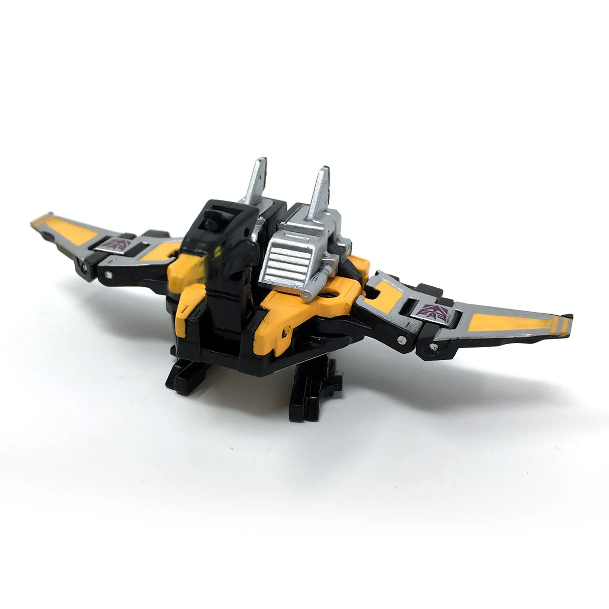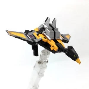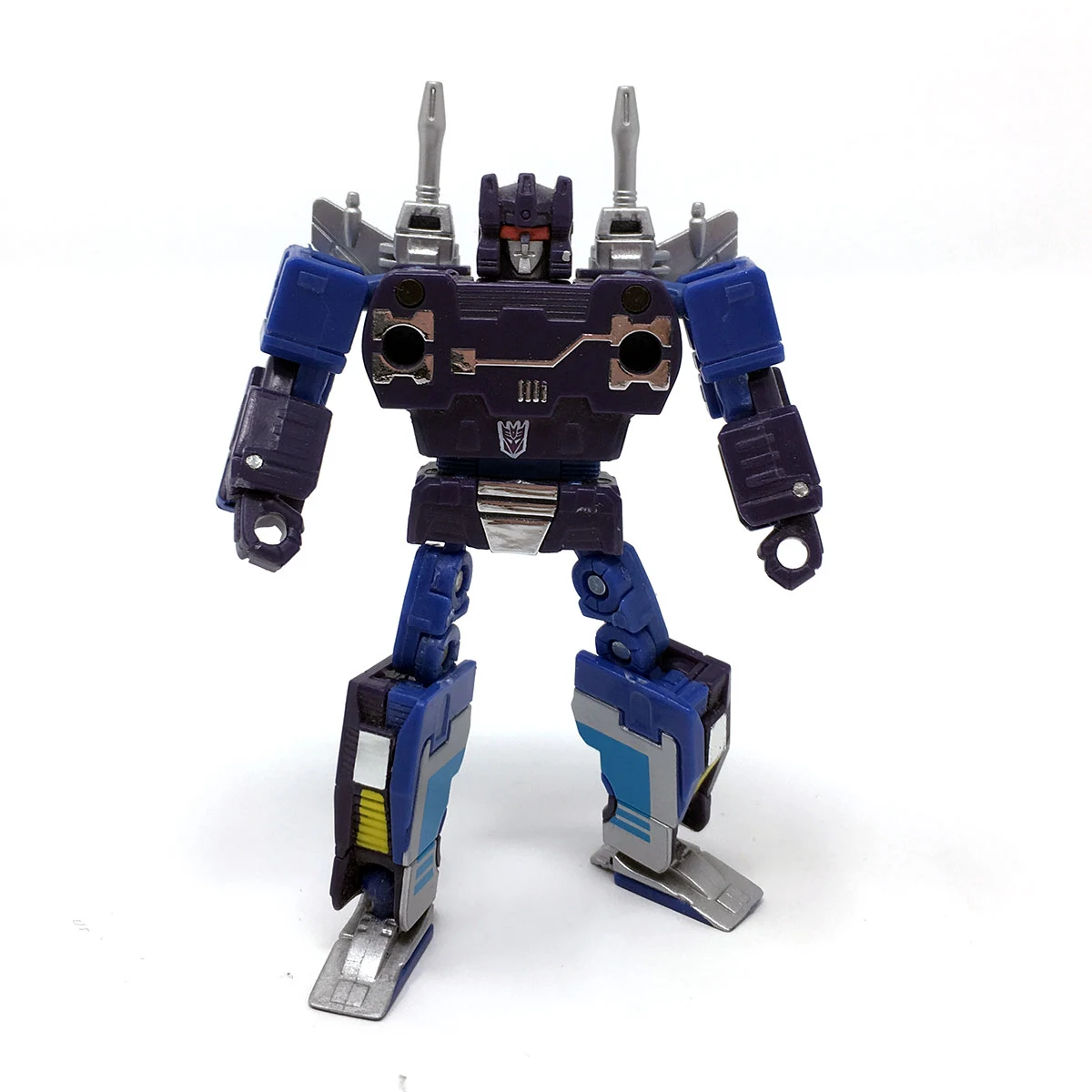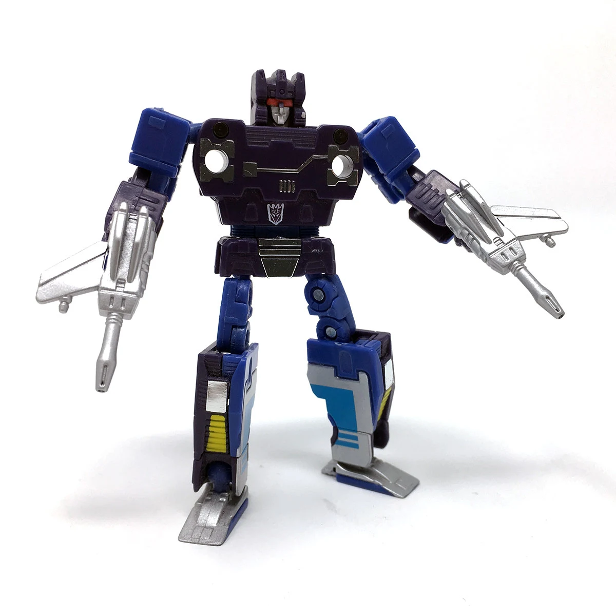 Masterpiece Frenzy is, of course, a redeco of Masterpiece MP-15 Rumble, who was released only a month beforehand. He is an updated version of the original Generation 1 toy, transforming from a highly articulated robot to a mini-cassette the same size as his Generation 1 toy. He still has his traditional Thruster Gun weapons, which can peg onto his back, or be held by his hands via 3mm post. He comes with a pink case which can be used to store him in tape mode. Frenzy comes with two large piledriver accessories which clip onto his arms. The piledrivers can connect to a mounting piece that allows them to be worn on the figure's back when not in use, and they also contain hollows to store his Thruster Guns. The mounting piece can also attach to his back on its own to resemble a battery pack. The piledrivers can also interact with other figures: They can clip to Masterpiece Soundwave's forearms to form cannons, or combine with Masterpiece Rumble's own piledrivers and link up with Soundwave's "sensor" accessory to form the interface cable that allows Soundwave to connect to other devices. He comes in a two-pack with Buzzsaw. This mold was also used to make Masterpiece Enemy.