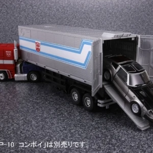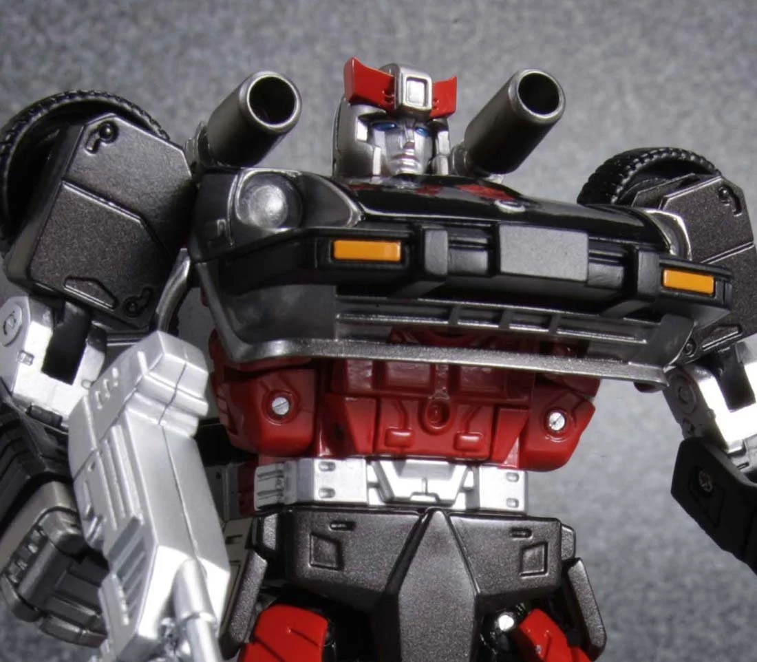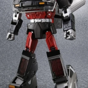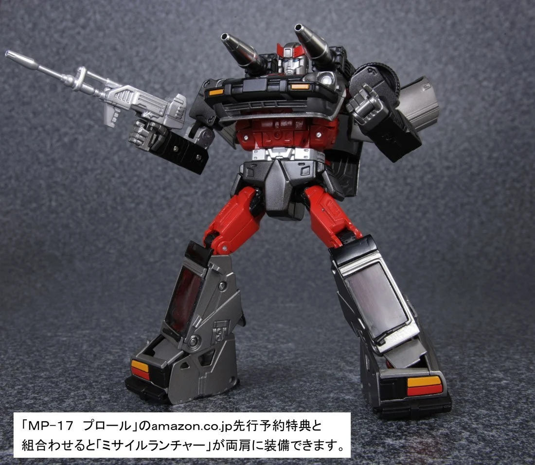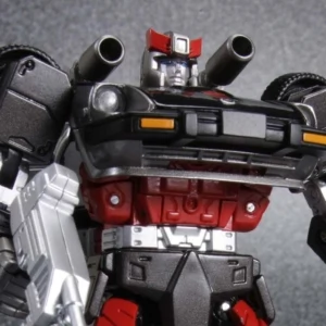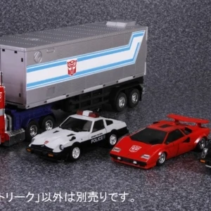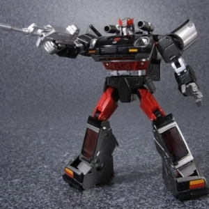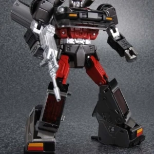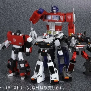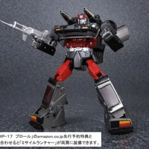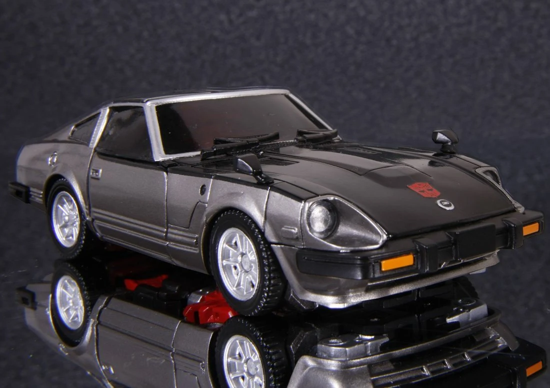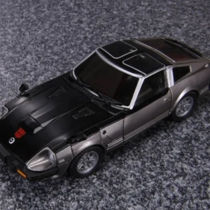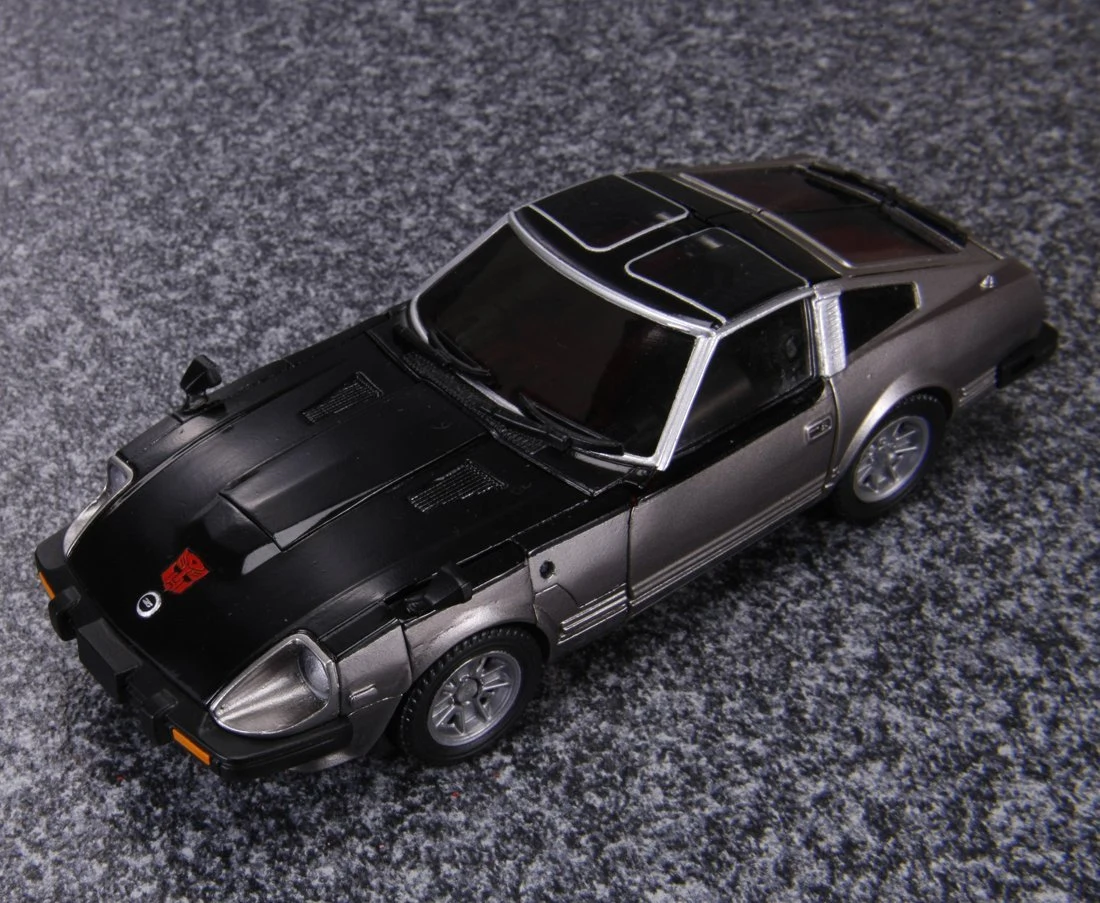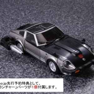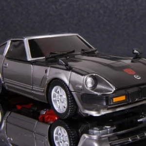 Masterpiece Streak is a redeco and retool of MP-17 Prowl, removing the light-bar and having a new head and waist. He transforms into a licensed Nissan Fairlady 280Z-T, and as with other figures in the Masterpiece line, is intended to be an accurate representation of his cartoon model, and even features an extensive black and metallic silver paint scheme. Roughly as tall as a Voyager Class figure, he is also in scale with MP-10 Optimus Prime, and can fit inside Prime's trailer in vehicle mode. In contrast to previous larger entries in this line, Streak lacks die-cast parts, and his tires are cast in hard, non-rubberized plastic. For accessories, he comes with his rifle, which can be held with his hands, or can mount onto a flip-out mounting point on his roof via the separate peg on its jointed handle. He also comes with a pair of built-in "Electro Bolt" shoulder cannons that can be deployed in robot mode. If purchased in Japan through Amazon.com, one additionally gets a single non-firing toy-accurate missile launcher accessory, which can cover and replace either of his shoulder cannons, as well as tab onto the rear sides of his vehicle mode. If purchased in other Asian markets outside of Japan, a collector's coin is included instead of or in addition to the launcher. The coin itself identifies him as Bluestreak. This mold was also redecoed and retooled into MP-19 Smokescreen. Streak and Prowl were to be released simultaneously, but Prowl was pushed back one month and Streak two months to meet demand. Streak was redecoed into Masterpiece Bluestreak, a separate character.
