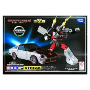 A TakaraTomy Mall exclusive, Streak is a redeco and slight retool of the original MP-18 release featuring a matte deco more akin to the character's appearance in the cartoon, including a larger Autobot insignia on the hood, unpainted front lights and fully orange back lights. As additions to the original mold, this release features a few additional accessories: his head was retooled to allow interchangeable faces (with the original serious face coming alongside a smiling one and a screaming one), and he also comes with three different shooting parts that can fit both in the rifle and in the shoulder cannons with interchangeable adapters.