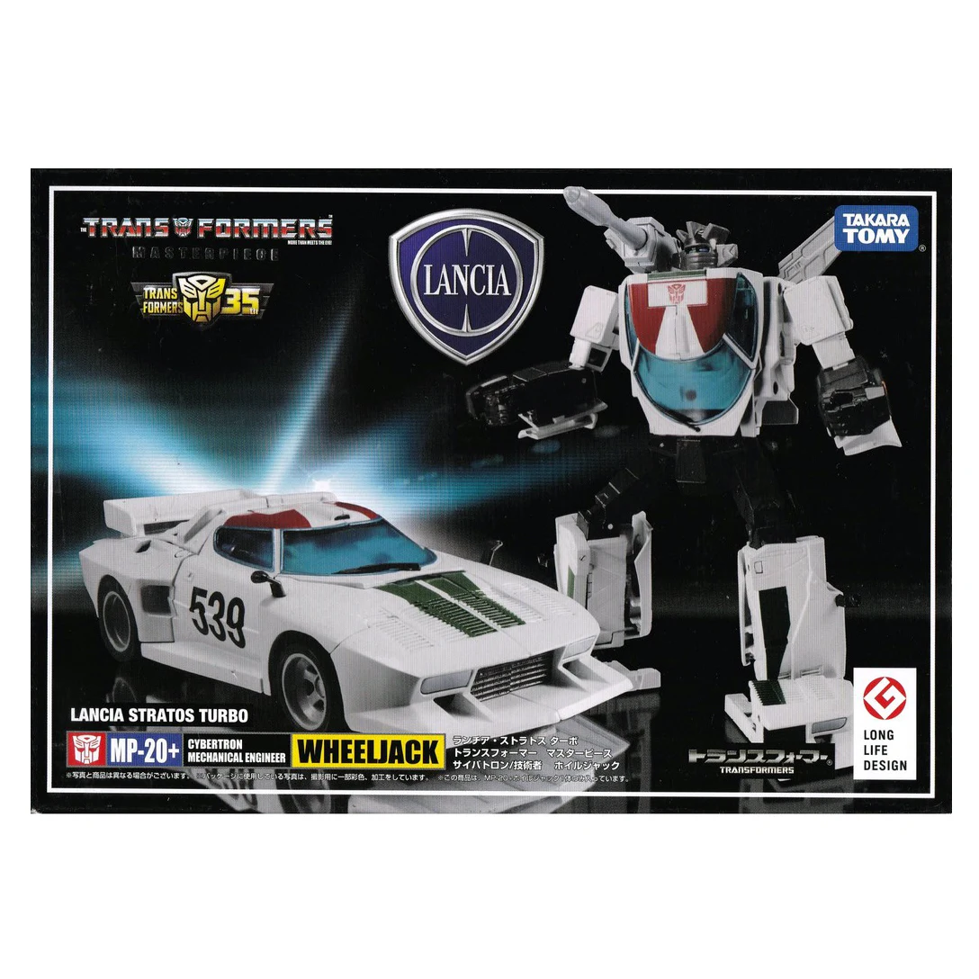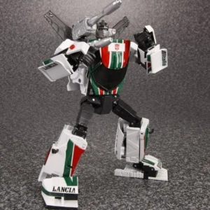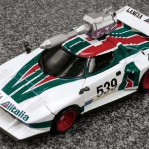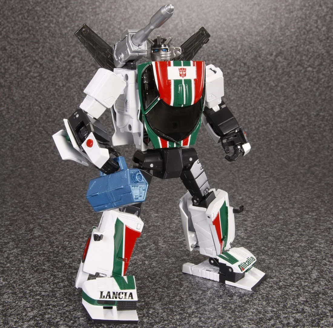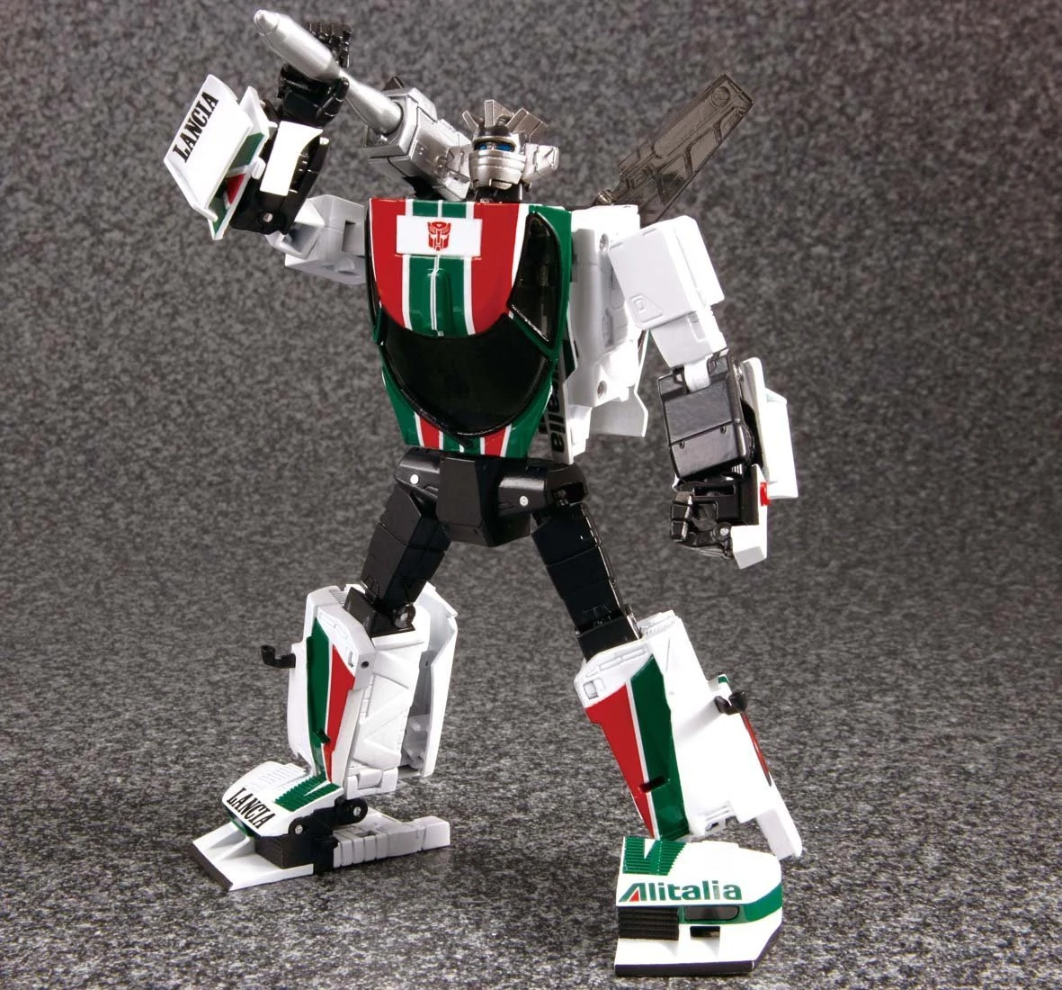 Masterpiece Wheeljack transforms into an officially-licensed Lancia Stratos with proper (licensed?) "Alitalia" markings. As with other figures in the Masterpiece line, he is intended to be an accurate representation of his cartoon model. Roughly as tall as a Voyager Class figure, he is also in scale with MP-10 Optimus Prime, and can fit inside Prime's trailer in vehicle mode. In contrast to larger entries in this line, Wheeljack lacks die-cast parts, and his tires are cast in hard, non-rubberized plastic. Additionally, his side mirrors come detached out of the box, and can be found separately packaged inside the instruction bag. An extra pair of mirrors is included in case of loss or breakage. For accessories, he comes with shoulder launcher, including a removable non-firing missile, and the generic laser pistol he wielded in "The Ultimate Doom, Part 3." In vehicle mode, the shoulder launcher mounts on the roof like the weapons of the other Masterpiece cars, while the gun stores underneath as the car's exhaust pipe. As a curious Easter egg, dismantling his head reveals a moustache hidden under his faceplate, similar to the one his Animated counterpart sports. If purchased in Japan through Amazon.com, one additionally gets a toolbox based on the hypno-chip disabling device he used in "The Ultimate Doom, Part 3". If purchased in other Asian markets outside of Japan, a collector's coin is included instead of or in addition to the toolbox. The coin package is shaped and colored like his hood deco, and identifies him as "Weeljack". This mold was redecoed and retooled into MP-23 Exhaust.