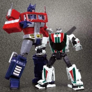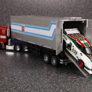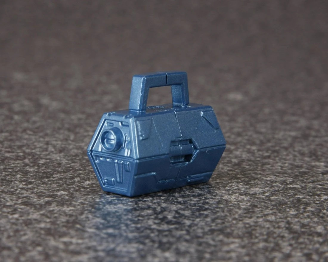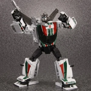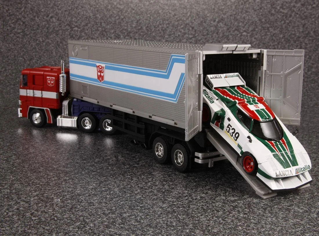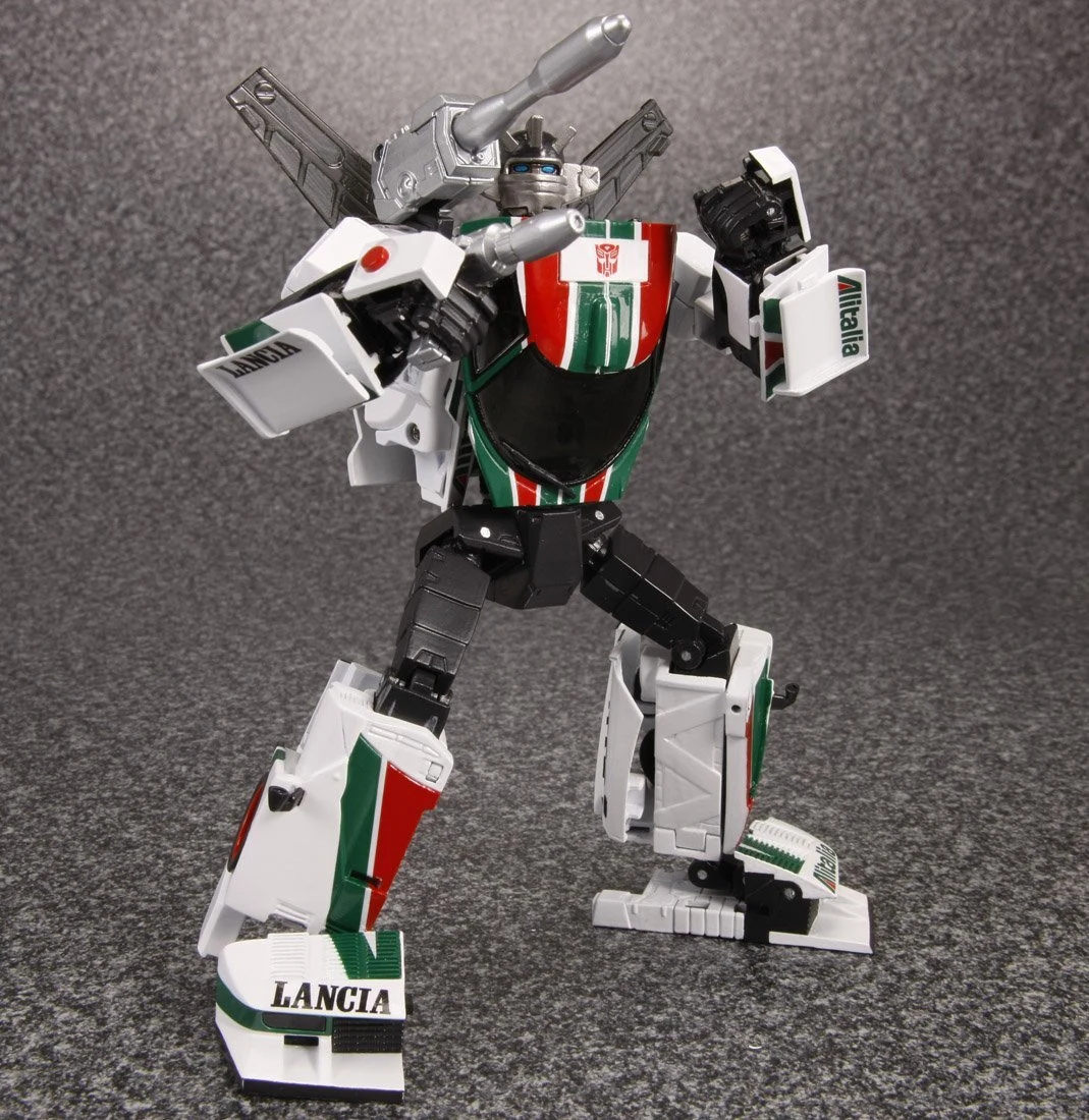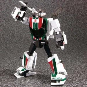 Masterpiece Wheeljack transforms into an officially-licensed Lancia Stratos with proper (licensed?) "Alitalia" markings. As with other figures in the Masterpiece line, he is intended to be an accurate representation of his cartoon model. Roughly as tall as a Voyager Class figure, he is also in scale with MP-10 Optimus Prime, and can fit inside Prime's trailer in vehicle mode. In contrast to larger entries in this line, Wheeljack lacks die-cast parts, and his tires are cast in hard, non-rubberized plastic. Additionally, his side mirrors come detached out of the box, and can be found separately packaged inside the instruction bag. An extra pair of mirrors is included in case of loss or breakage. For accessories, he comes with shoulder launcher, including a removable non-firing missile, and the generic laser pistol he wielded in "The Ultimate Doom, Part 3." In vehicle mode, the shoulder launcher mounts on the roof like the weapons of the other Masterpiece cars, while the gun stores underneath as the car's exhaust pipe. As a curious Easter egg, dismantling his head reveals a moustache hidden under his faceplate, similar to the one his Animated counterpart sports. If purchased in Japan through Amazon.com, one additionally gets a toolbox based on the hypno-chip disabling device he used in "The Ultimate Doom, Part 3". If purchased in other Asian markets outside of Japan, a collector's coin is included instead of or in addition to the toolbox. The coin package is shaped and colored like his hood deco, and identifies him as "Weeljack". This mold was redecoed and retooled into MP-23 Exhaust.