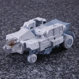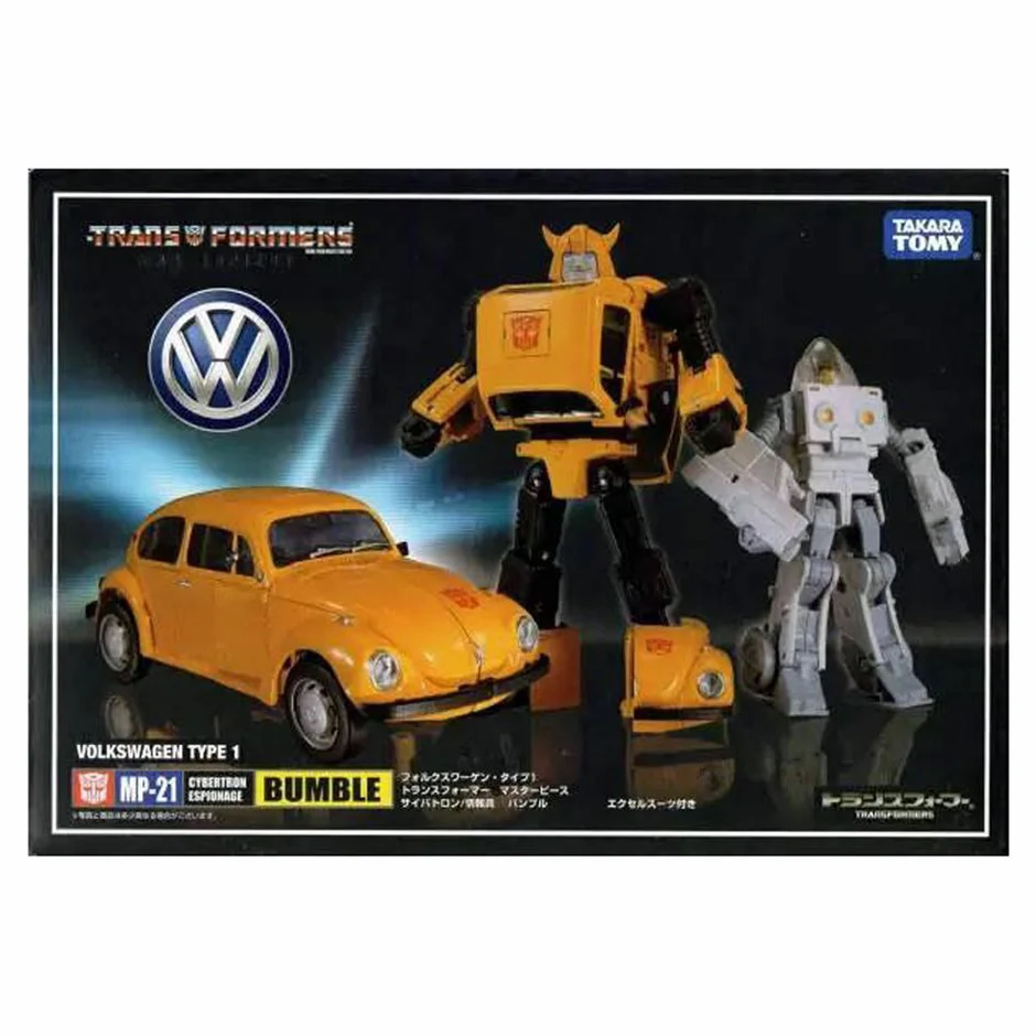 Masterpiece Bumble transforms into an officially-licensed Volkswagen Type 1 Beetle. As with other figures in the Masterpiece line, he is intended to be an accurate representation of his cartoon model. Roughly as tall as a Deluxe Class figure, he is also in scale with MP-10 Optimus Prime in robot mode (making his car mode very out of proportions with the other Masterpiece cars), and can fit inside Prime's trailer in vehicle mode. In contrast to larger entries in this line, Bumblebee lacks die-cast parts, and his tires are cast in hard, non-rubberized plastic. Additionally, following the trend started with Wheeljack, his side mirrors come detached out of the box, and can be found separately packaged inside the instruction bag. Accurate to the real-life Type 1 Beetle, he only has one mirror, on the driver's side; an extra is included in case of loss or breakage. For accessories, he comes with his gun (called Lazer Gun [sic] in the instructions), a second interchangeable face with an open-mouth smile to replace his regular neutral face, and a spare tire cover that can be plugged on the rear of his vehicle mode by pulling away the license plate, which then fits inside the cover. The cover mounts on his back in robot mode; indeed, it only exists in order to replicate the large yellow circle on the back of Bumblebee's character model, a visual adaptation of some molded circular detail on his original toy. Illustrating its non-essential vehicle mode role, it can also be stored out of view on the car's underside. To make up for the smaller size of Bumblebee when compared to other figures in the Masterpiece line (and to keep up with the price tag), MP-21 comes with an Exosuit figure, which can transform into its vehicle mode as seen in Transformers: The Movie. The figure itself is referred to only as "Exosuit" on the instruction book, but according to the lineart included in The Transformers Masterpiece Official Guide it's supposed to be Daniel Witwicky, though the back of the box refers to it as Spike. If purchased in Japan through Amazon.jp, one additionaly gets an interchangeable "Battle Face" based on the original G1 toy's one. If purchased in other Asian markets outside of Japan, a collector's coin is included instead of or in addition to the face. The coin package is shaped like his head, and identifies him as "Bumblebee Autobot".