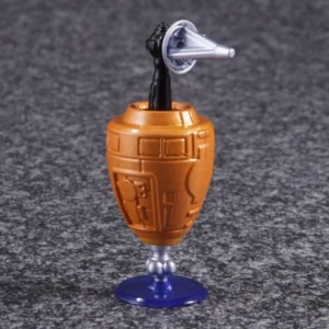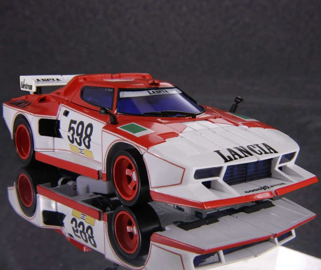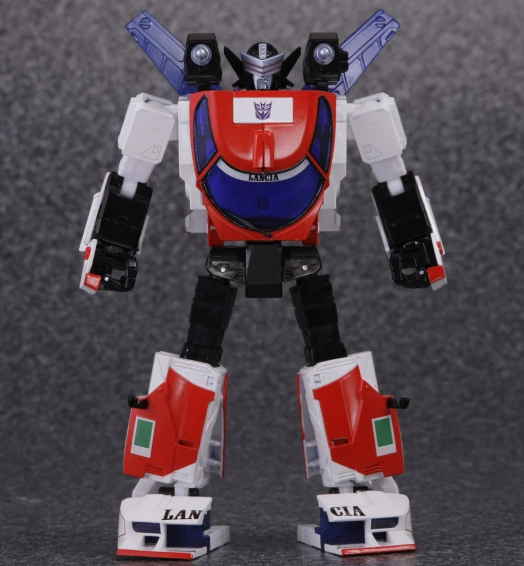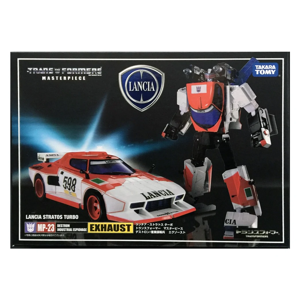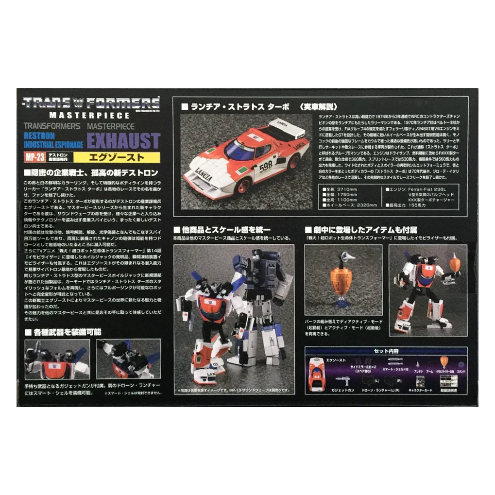 Masterpiece Exhaust is a retool of MP-20 Wheeljack, transforming from an officially-licenced Lancia Stratos into a robot and back! Roughly as tall as a Voyager Class figure, he is also in scale with MP-10 Optimus Prime, and can fit inside Prime's trailer in vehicle mode. In contrast to larger entries in this line, Exhaust lacks die-cast parts, and his tires are cast in hard, non-rubberized plastic. Additionally, his side mirrors come detached out of the box, and can be found separately packaged inside the instruction bag. An extra pair of mirrors is included in case of loss or breakage. For accessories, Exhaust comes with Wheeljack's gun and two non-firing shoulder-mounted missile launchers with newly molded, stumpier missiles in homage to the launchers of the original Wheeljack toy. He also comes with the Immobilizer from the Generation 1 cartoon episode "The Immobilizer".