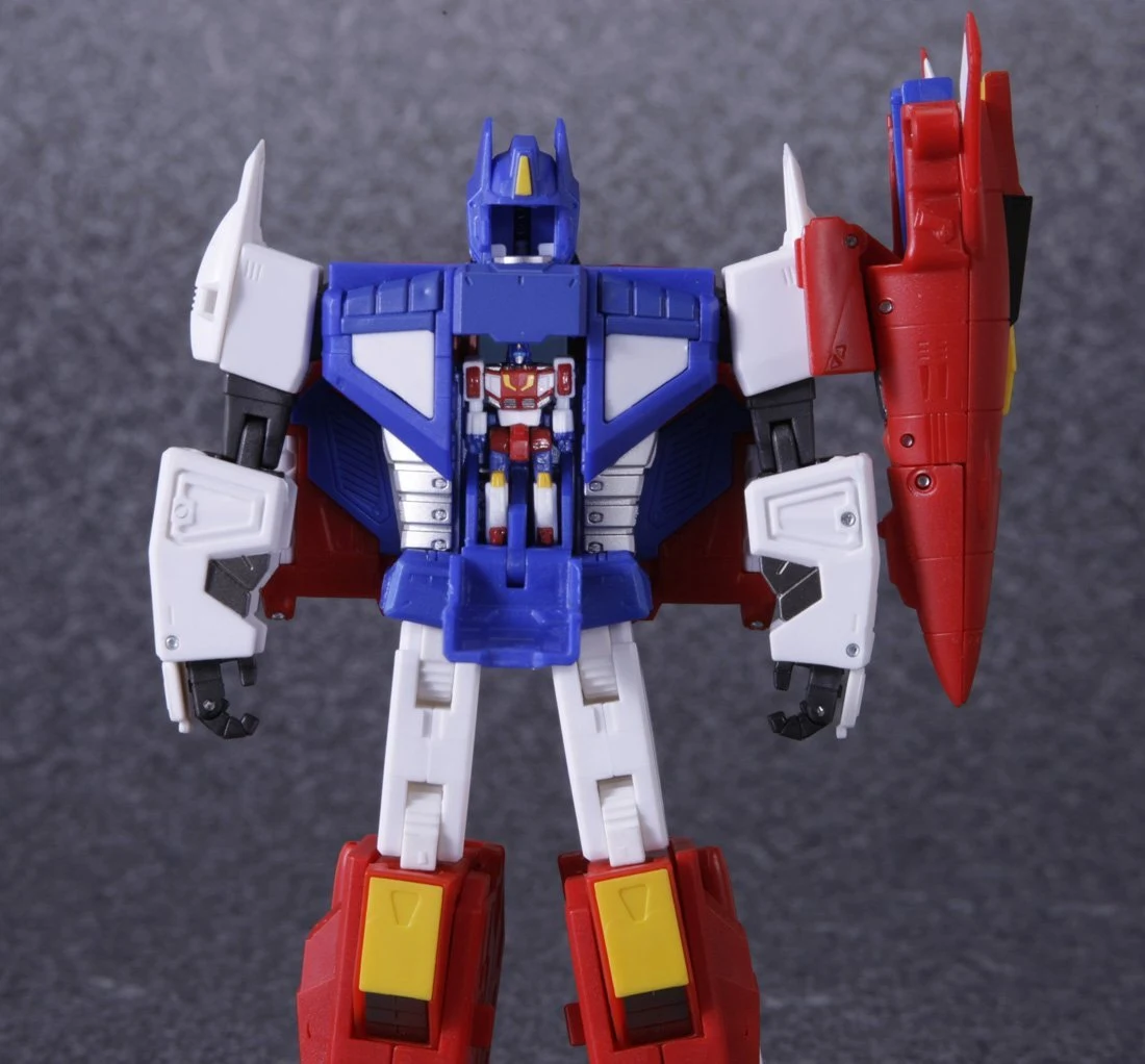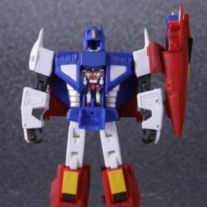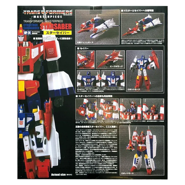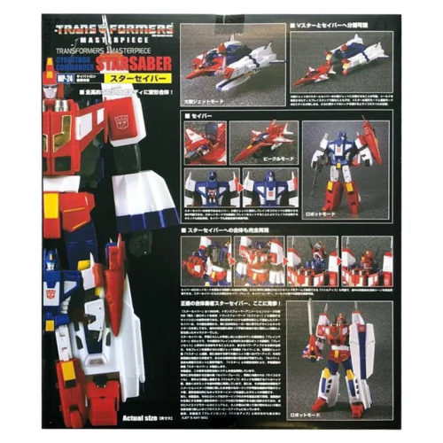 Masterpiece Star Saber was chosen by fans on the Masterpiece Fan's Choice poll and announced November 19, 2013. Hisashi Yuki led the Masterpiece Star Saber project, rather than the usual Masterpiece designer, Shogo Hasui, so the creation of Star Saber did not derail the other ongoing Masterpiece releases. Star Saber keeps most of the features the original toy had, the main difference being in how the Brainmaster gimmick works: Saber's face is in the main body rather than in the Brain of Courage figure. Also he comes with an extra accessory that was not in the original figure, the shield Star Saber used in "Showdown! The Fortress vs the Victory Unification", which doubles as a "flight stand" for the figure when in its alternate mode. He also comes with two swords, one scaled for Saber and one scaled for Star Saber. The small one's blade is stored in the slot opposite to the one where the regular blade is stored, while its hilt detaches from the big one. If ordered from Amazon in not-Japanese Asian states, he comes with a collector coin. The coin comes in a box shaped like Star Saber's chest. Star Saber was released in Australia as a Toys"R"Us exclusive, with box and instructions translated to English. The English version of his bio is based on his IDW incarnation.