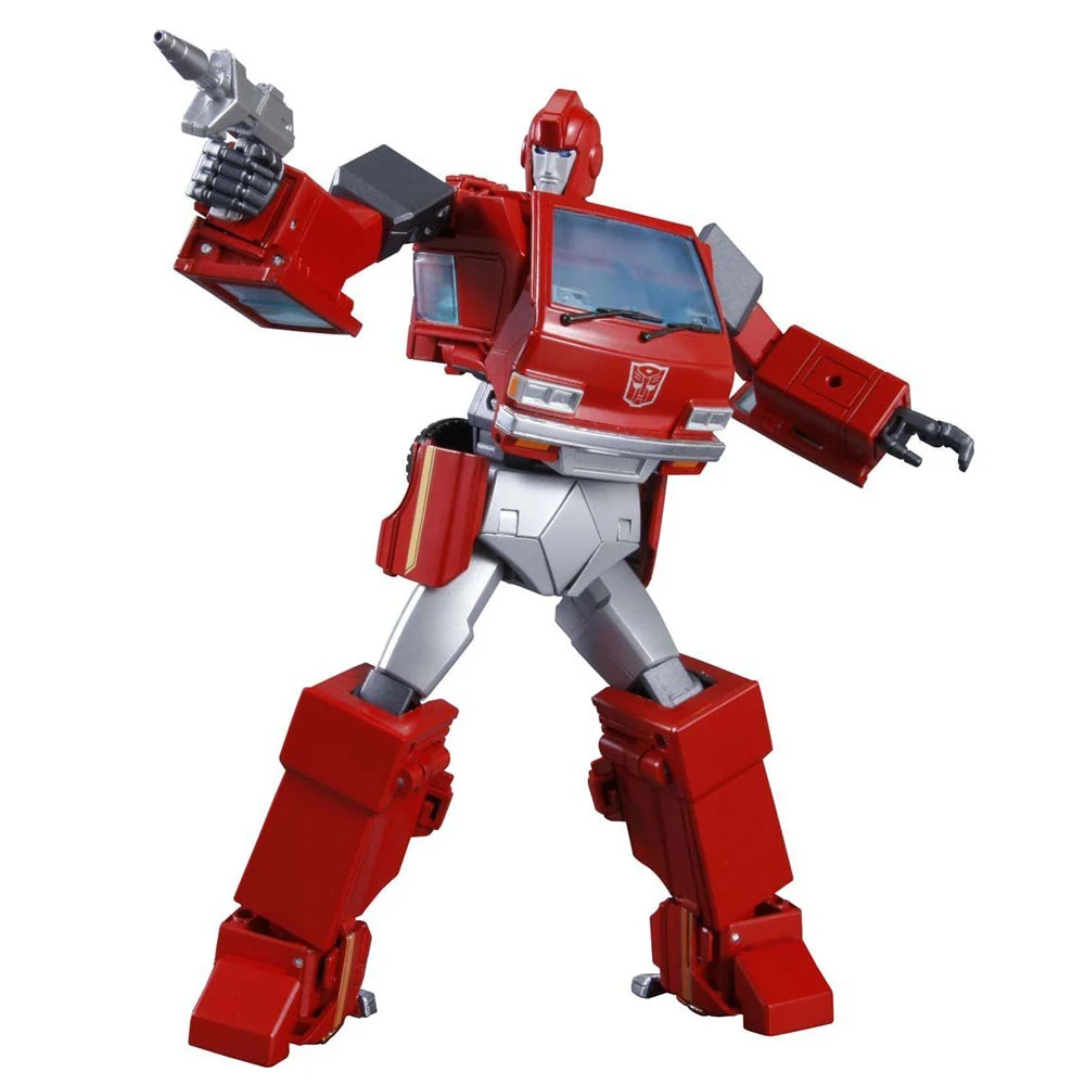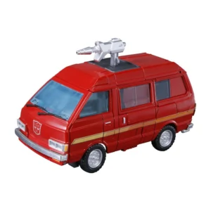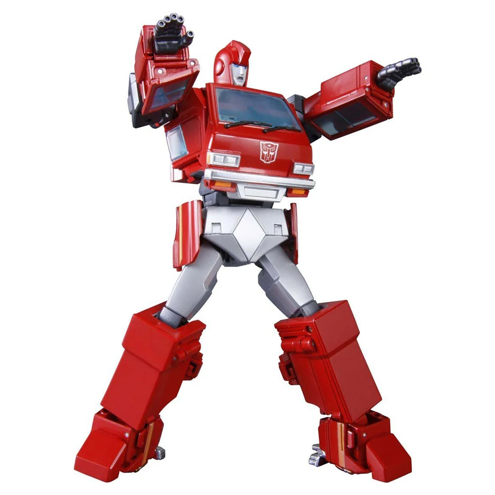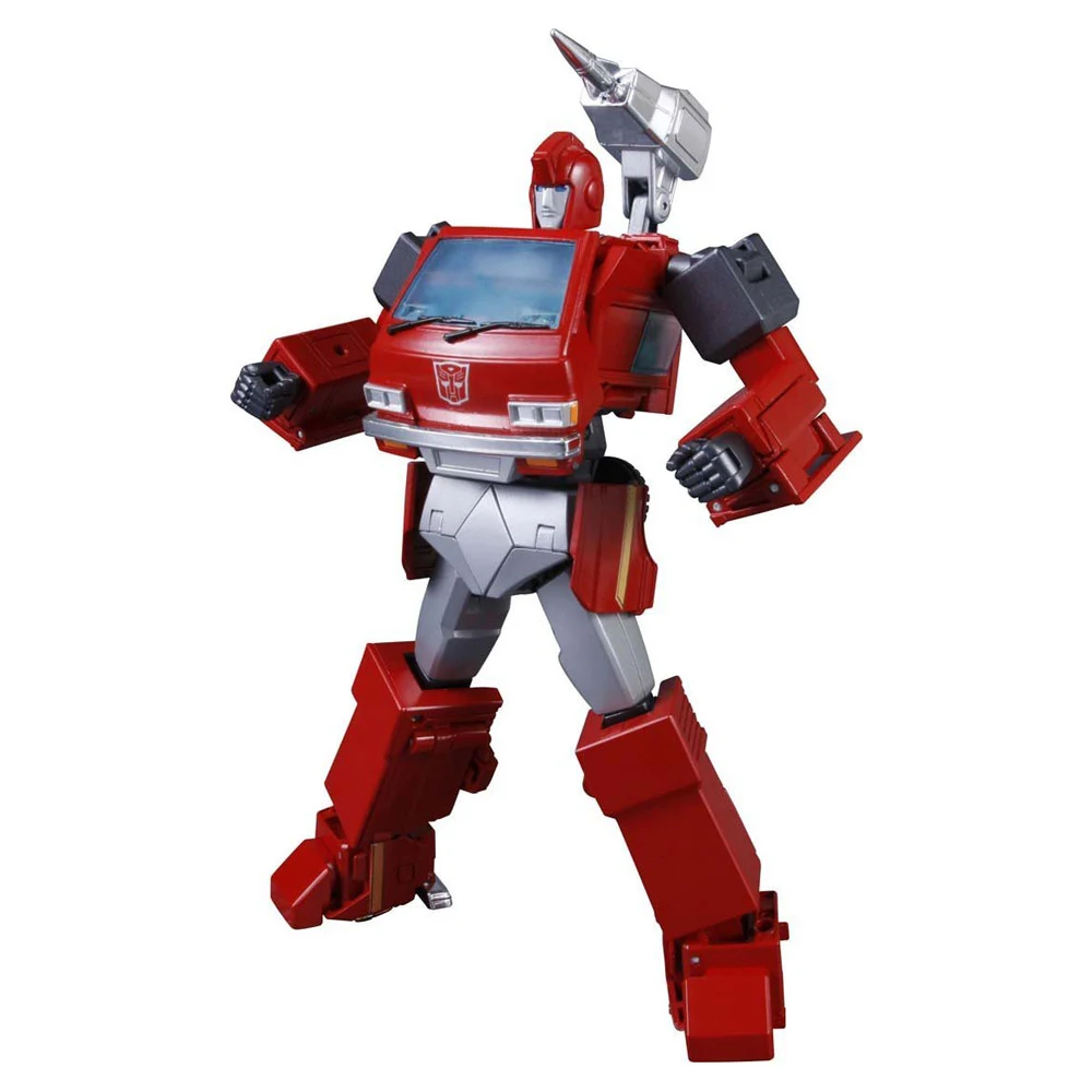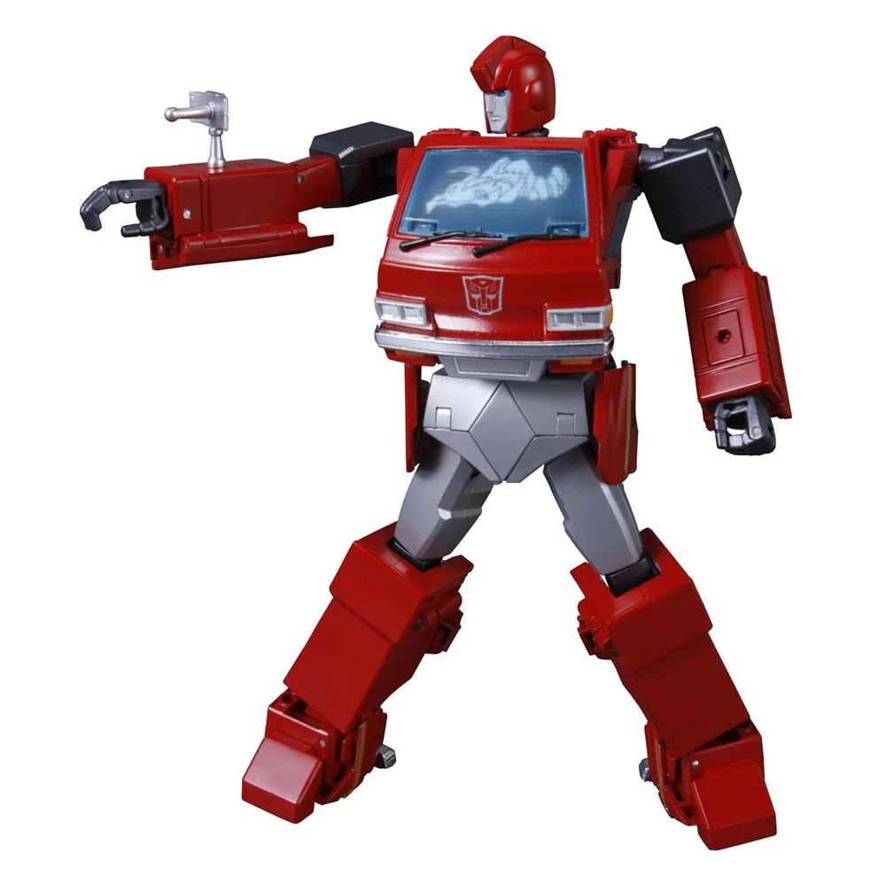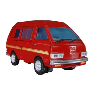 Masterpiece Ironhide is a new mold that transforms into a licensed Cherry Vanette. He is in the standard Masterpiece scale (since MP-09), standing inbetween MP-10 Convoy and MP-12 Lambor in bot mode and can fit inside Convoy's trailer in vehicle mode He comes with a bunch of accessories referencing many of the gadgets he used in the Generation 1 cartoon. Ironhide's character model did not include any weapons or other extra tools or devices, meaning there was little to no consistency in the depiction of his armament in the series; as such, the toy picks and chooses from the many weapons and accoutrements he was seen using. He includes a pair of generic Autobot laser pistols of the same design as the gun that came with Masterpiece Bumblebee (which Ironhide began using in "Megatron's Master Plan, Part 1") which can be stored on the underside of his vehicle mode, a larger gun based on his original toy's Static Laser Gun (similar weapons having been seen in "City of Steel" and "A Prime Problem"), a set of alternate hands representing his ability to spray liquids through his fingertips (done in multiple episodes), a set of nozzles that can be exchanged for his hands based on those seen in "Desertion of the Dinobots, Part 1", a second set of nozzles based not on anything from the cartoon, but on the connector peg for his Static Laser Gun from his original toy, the back-mounded missile launcher from "More than Meets the Eye, Part 3" based on his original toy's launcher, his wrist-mounted sonodar sensor dish from "S.O.S. Dinobots", complimented by a readout image of dinosaur bones that can be slipped behind his windshield, and the jetpack seen in "The Immobilizer", complete with jet-flare effects. A peg hole on the roof of his vehicle mode can hold one of the laser pistols or the Static Laser Gun. His second release for the Asian market included a die-cast version of the hand drill tool he used in "More than Meets the Eye, Part 3," packaged in a little black plastic "toolbox." Since Masterpiece Ironhide's robot mode incorporates the entire vehicle mode, a separate "battle sled" piece has been included, based on the component of the original toy, that can store all of Ironhide's accessories, including a second face piece that stores on the underside of the sled. In an additional nod to the original G1 toy, specifically its lack of a proper head, there is a sculpted detail resembling the "face" decal that went on the seat of the original toy that is visible through the windshield in van mode, that gets tucked away in robot mode. If purchased from a seller supplied by Hasbro Asia, Ironhide includes a collector coin, mounted in a card which resembles the front of his van mode. It may have also included a die cast drill accessory, based on the one he used in "S.O.S. Dinobots". The drill accessory came in a small case styled to resemble a tool case.[2] Ironhide was retooled into Masterpiece Ratchet.