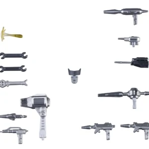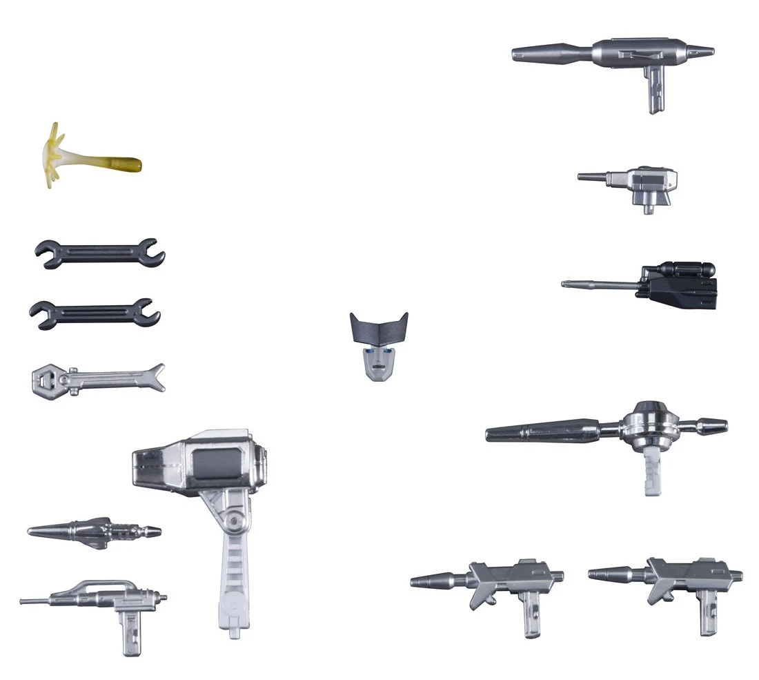 Accessories : Missile launcher, missile, static laser gun, 2 laser pistols, x-ray blaster, repair beam emitter, repair beam effect, 2 cyber spanners, magno-wrench, laser scalpel, arc-welder, repair bay, 2 faces, cardstock EKG image