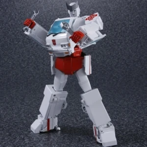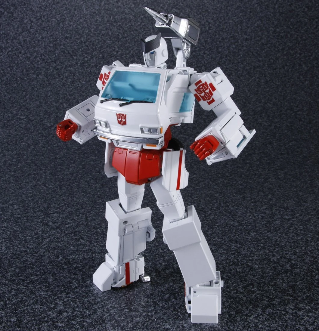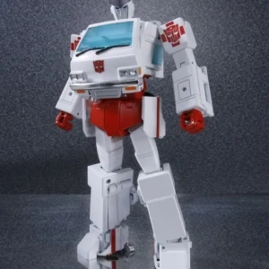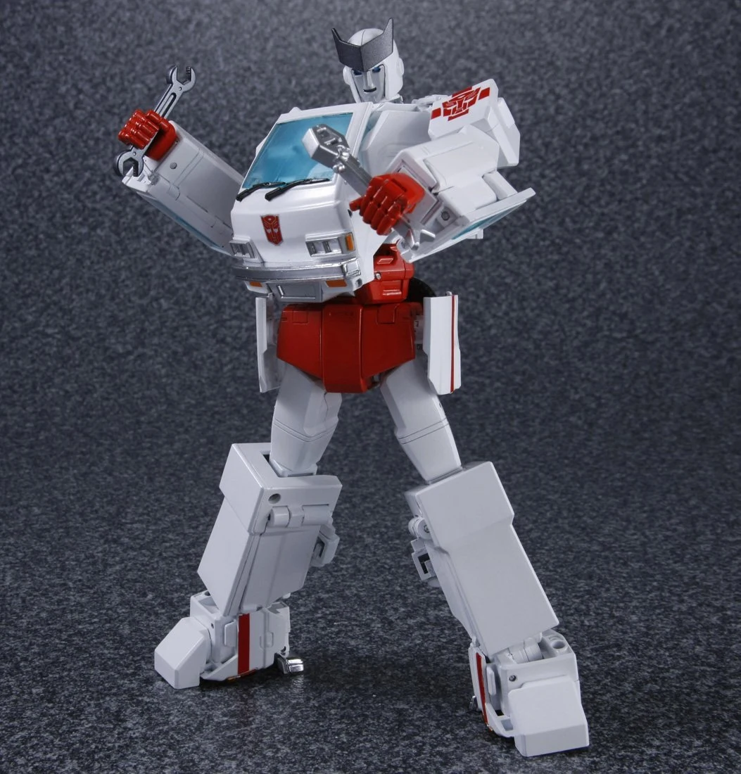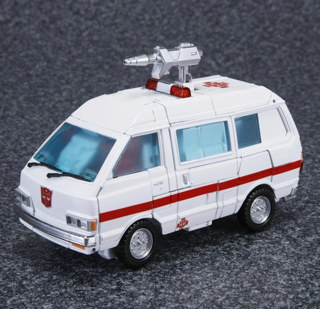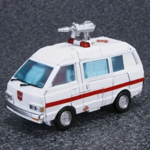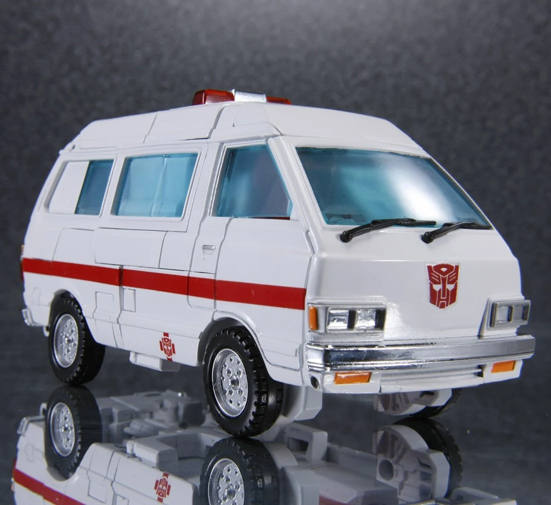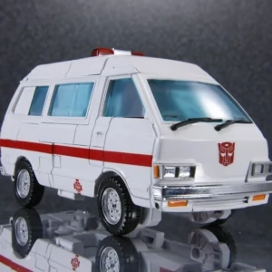 Masterpiece Ratchet is a retool of Masterpiece Ironhide, with a new head, skirt armor, and lightbar. Ratchet shares several accessories with Ironhide: a pair of generic Autobot pistols (prominently dual-wielded by Ratchet in The Transformers: The Movie), a static laser gun and missile launcher based on those included with his original toy (though, unlike Ironhide, not used by Ratchet in the cartoon), and an extra face. He also comes with multiple new accessories, mostly various kinds of medic tools he used in the show, including a "repair beam emitter" that plugs into his forearm (used occasionally throughout the series, but first seen in "Transport to Oblivion") complete with an attachable beam light effect, an "arc-welder" that replaces his hand (Ratchet used a tool like this regularly in the series, but this accessory is specifically based on the detailed one seen in "Dinobot Island, Part 2"), a pair of "cyber spanners" (used in "Attack of the Autobots"), a "magno-wrench" (from "The Autobot Run"), a hand-held laser scalpel (also from "The Autobot Run") and an "x-ray blaster" (from "Microbots"). Similar to how Ironhide included a cardstock image of dinosaur bones, Ratchet includes a cardstock image of an EKG reading that fits behind his windscreen. Ratchet has two options for his red cross stickers–placed on his shoulders, and the sides and top of his vehicle mode–both of which sidestep the trademark issues involving the Red Cross organization: one set places an Autobot insignia over the center of the cross, whilst the other adds a red square into each corner of the cross. You didn't hear it from us, but you can totally cut the squares off the latter set to give Ratchet his original plain crosses. If purchased from a seller supplied by Hasbro Asia, Ratchet includes a collector coin mounted in a card which resembles the front of his van mode.