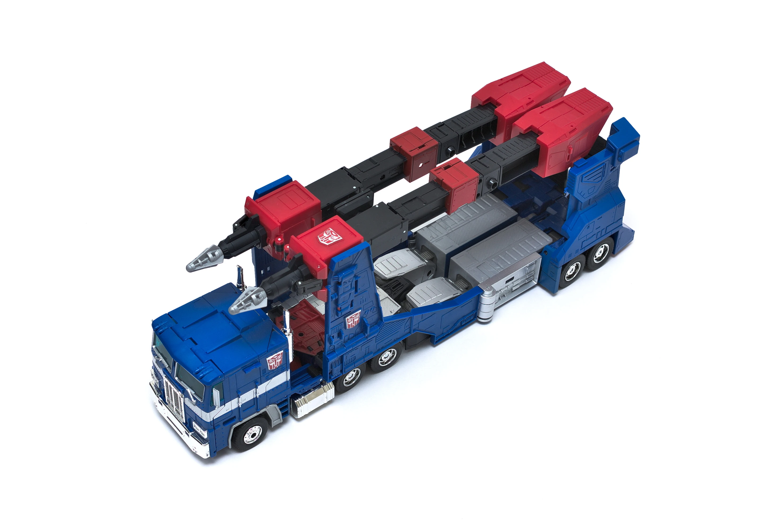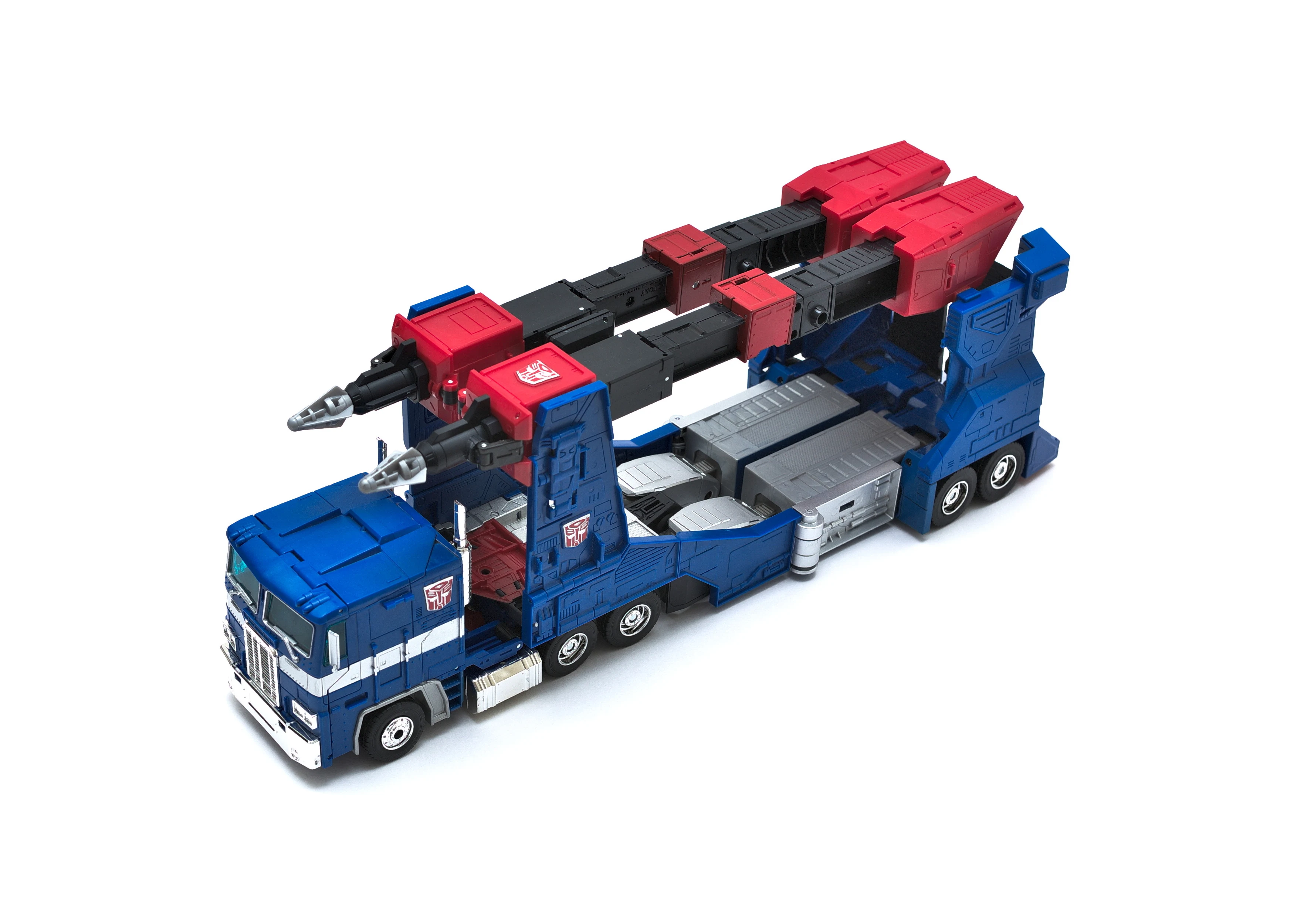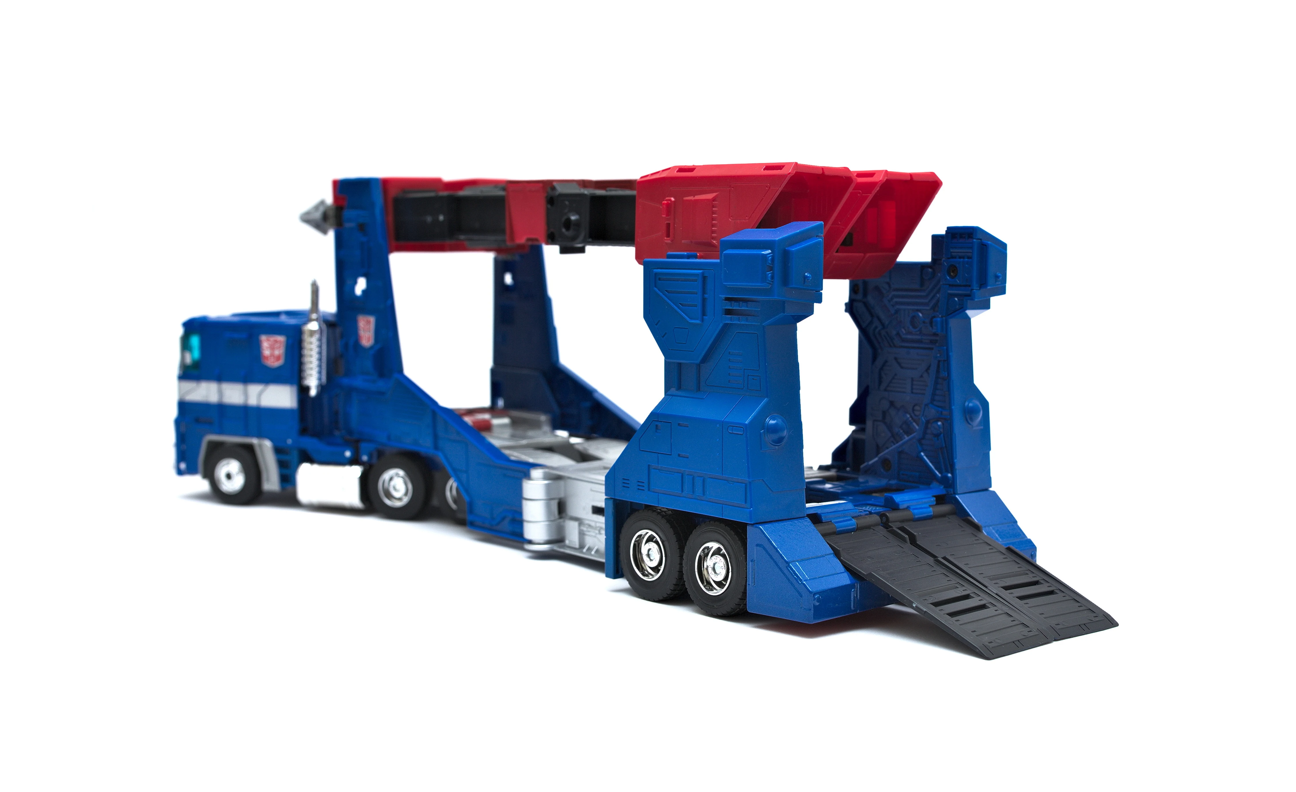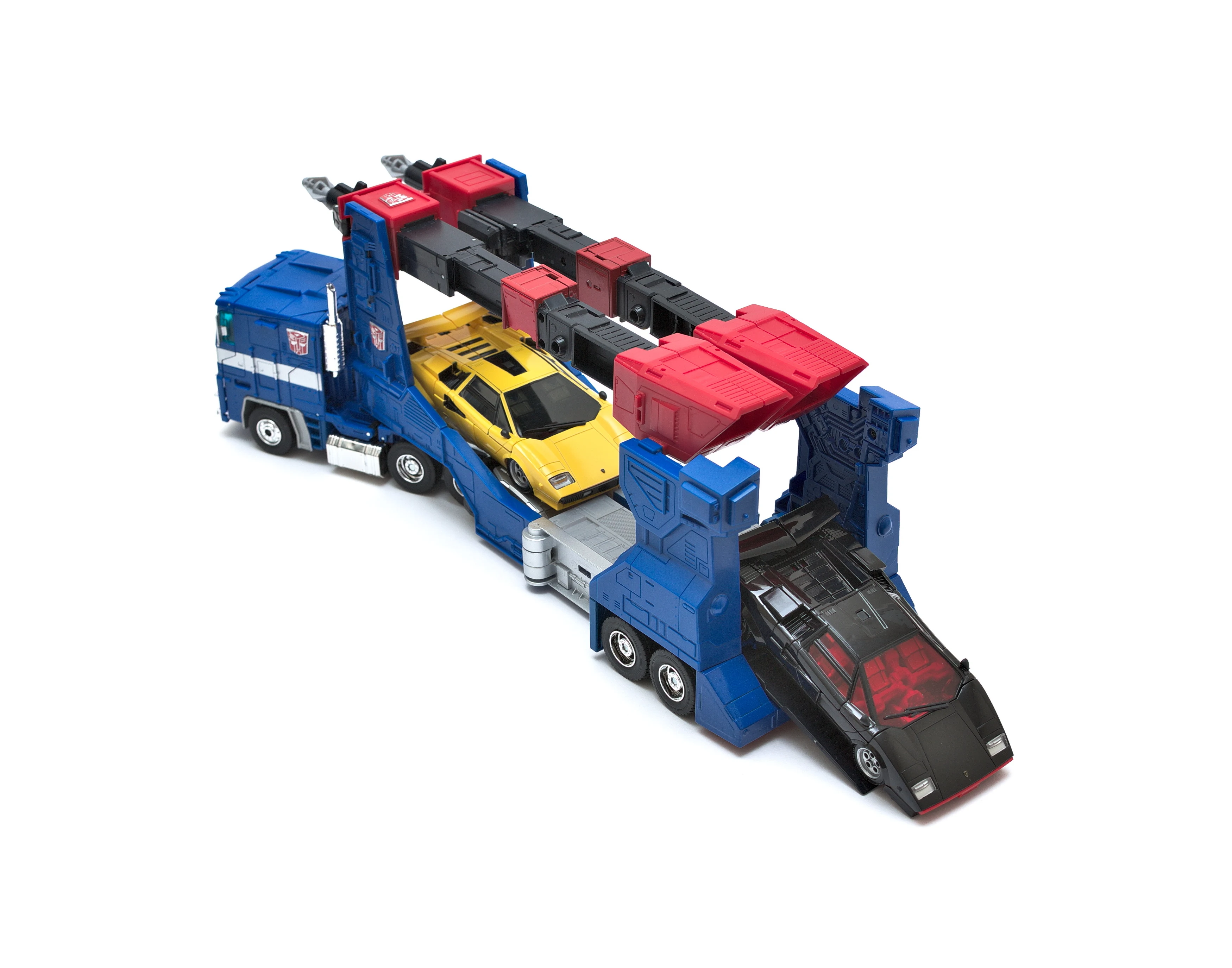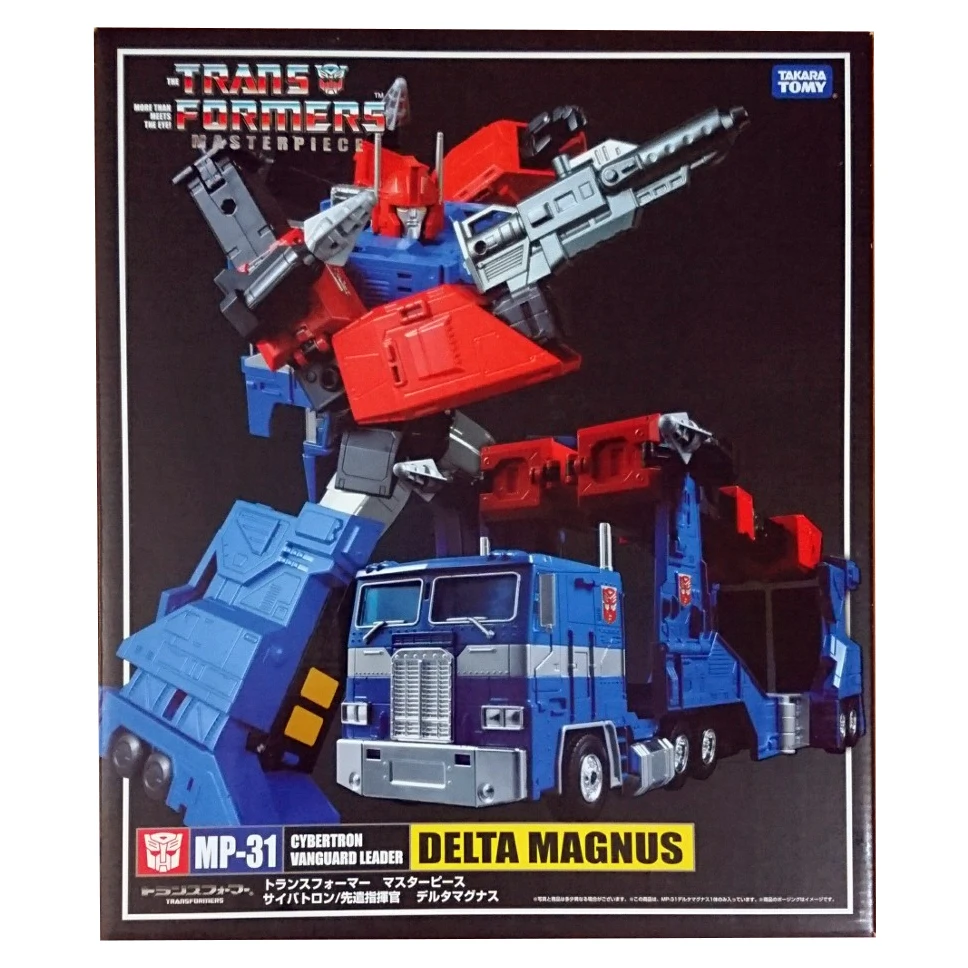 Masterpiece Delta Magnus is a redeco of the 2014 Masterpiece MP-22 Ultra Magnus in his Diaclone/movie preview colors, transforming into a car carrier with a functioning gate/ramp. He can carry 4 smaller Masterpiece Autobots in the top and bottom of his trailer, which features small indents to stop them from rolling off. The Matrix of Leadership accessory of MP-10 Optimus Prime can be stored in his chest. He lacks MP-22's Spike and Daniel figures and Matrix-holding hands, but instead comes with two alternate faces for Ultra Magnus and an articulated figure of Marissa Faireborn who can ride in his cab. If purchased from a seller supplied by Hasbro Asia, Delta Magnus comes with a collector coin, mounted in a folding card styled like his chest and torso, opening to reveal the coin where the Matrix chamber would be.
